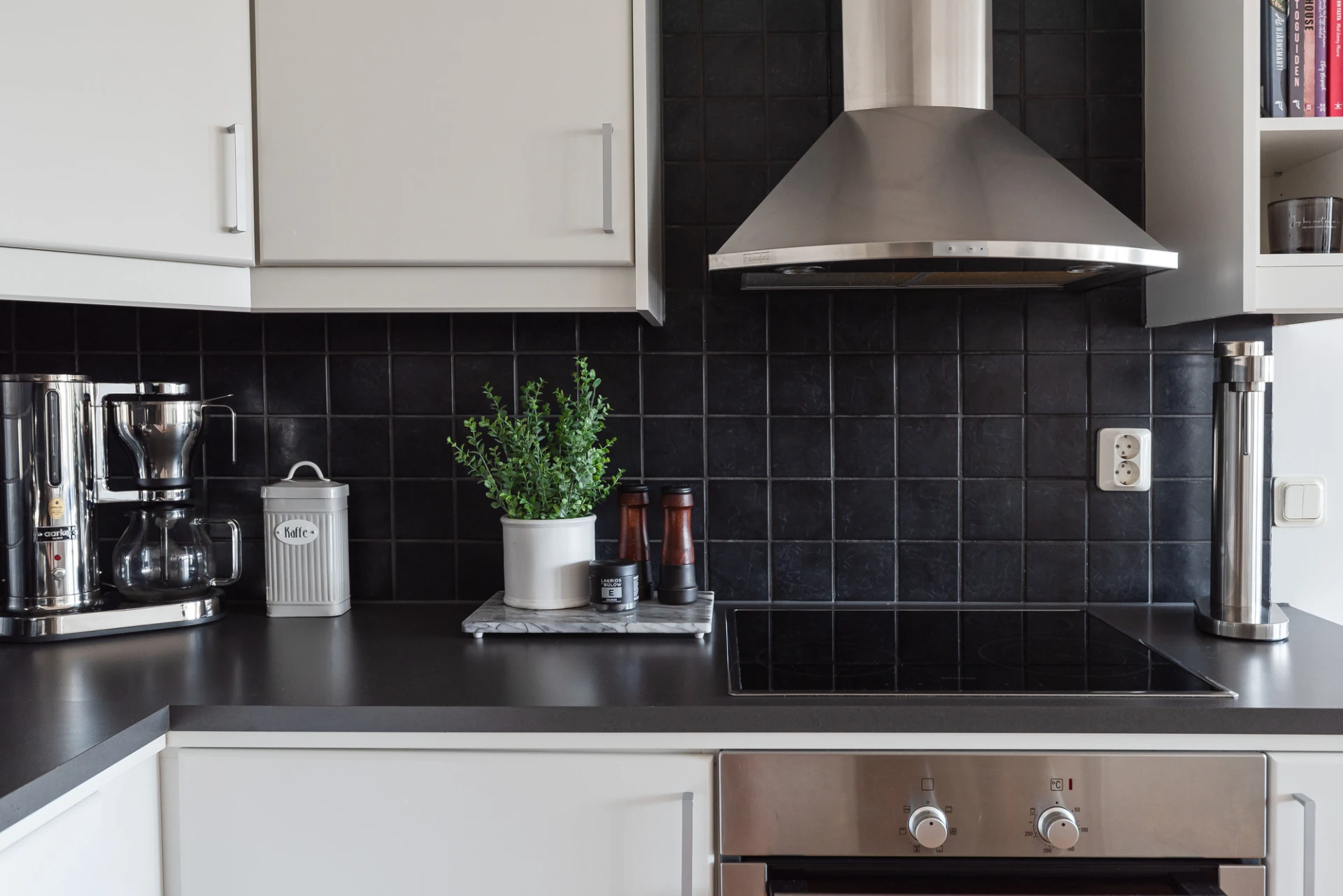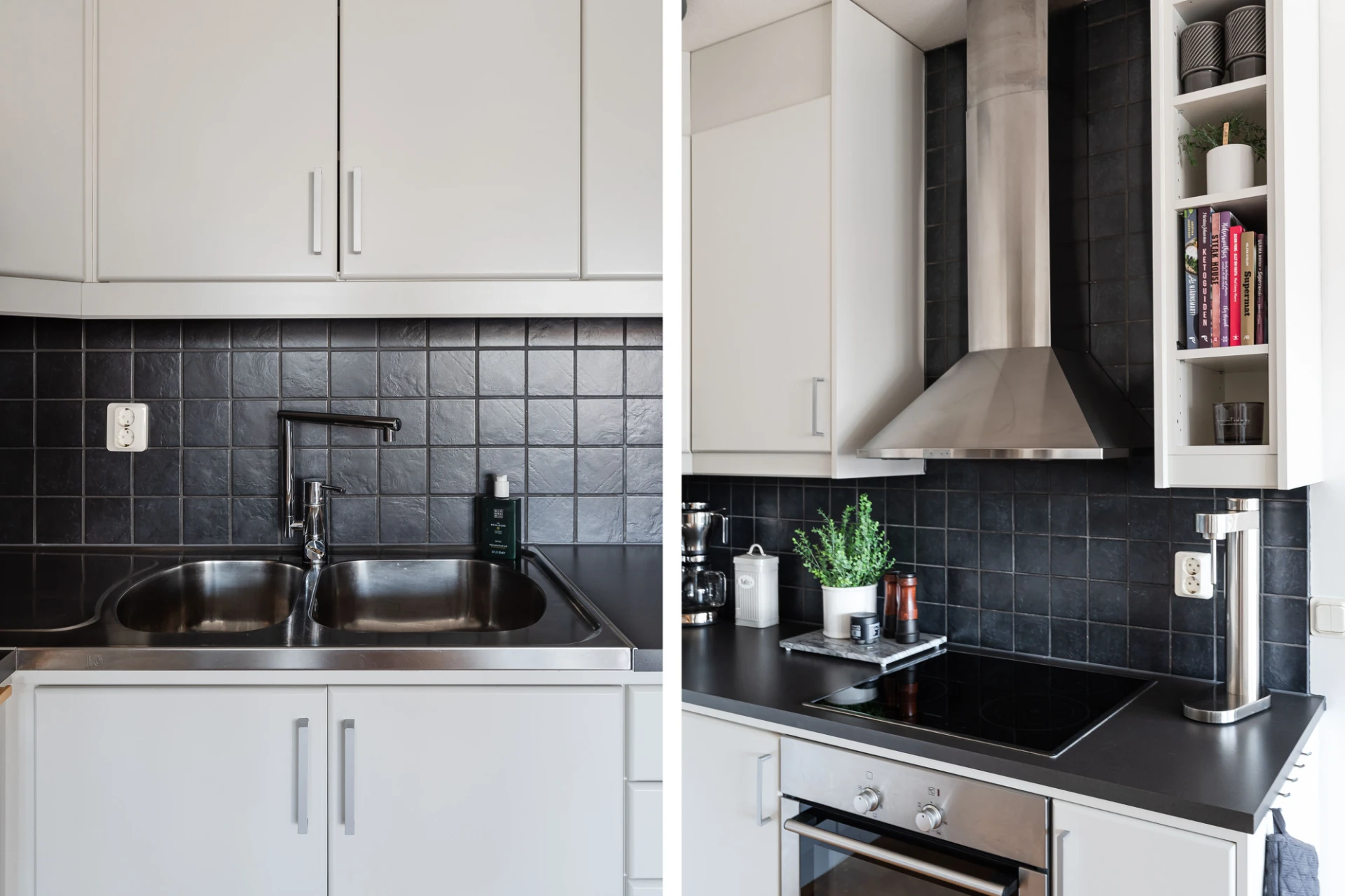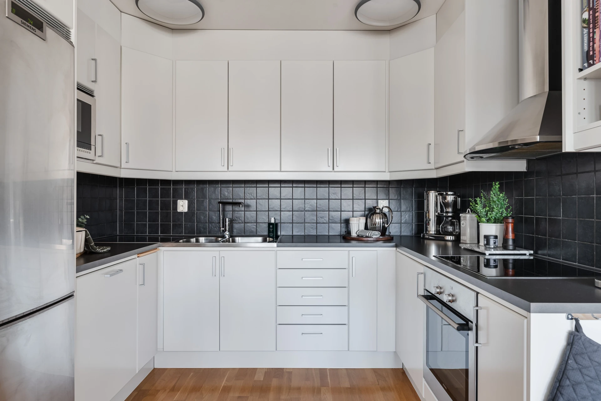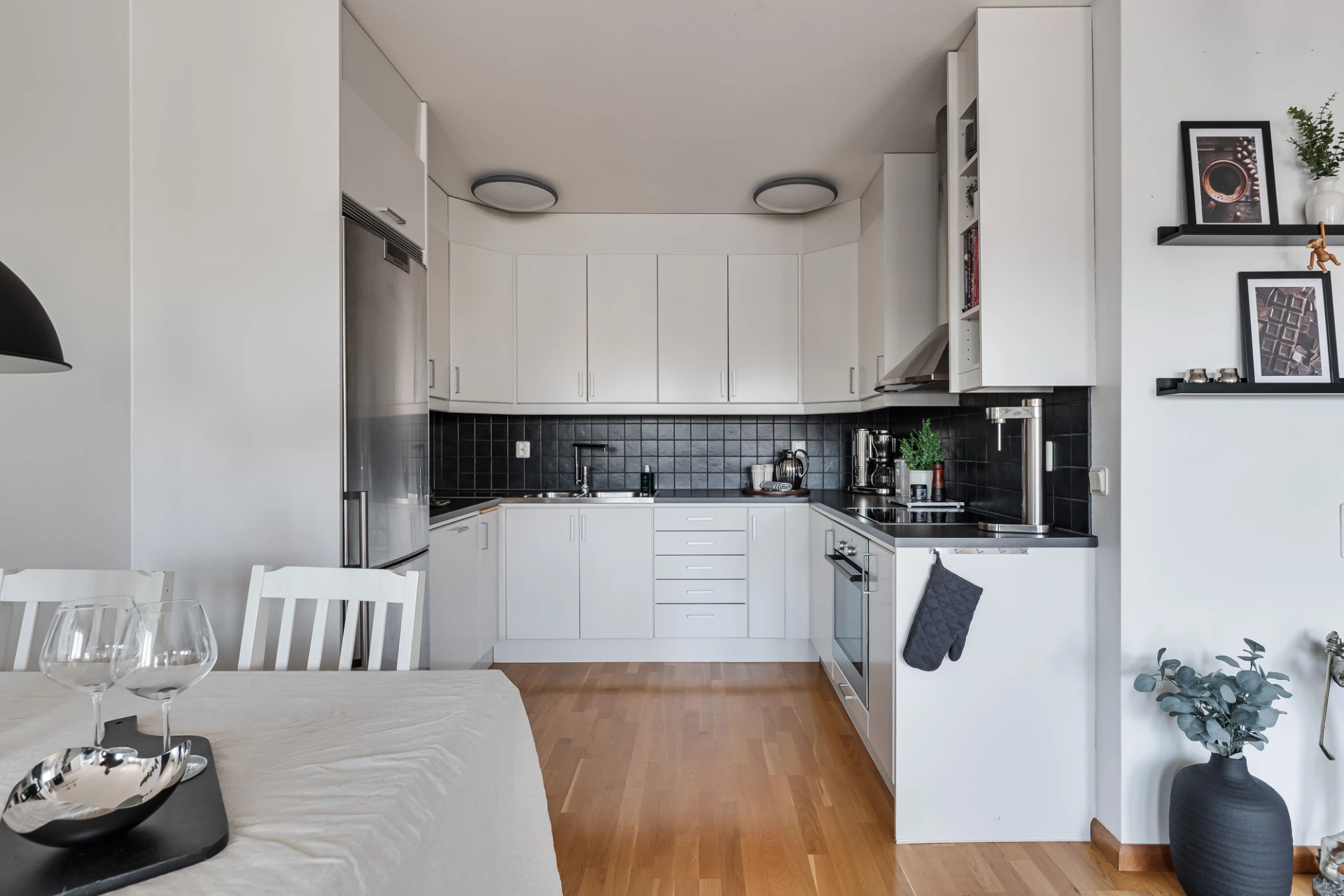 Ljust och stilrent kök som är perfekt för både matlagning och umgänge. Med vita skåpluckor, grått kakel och full maskinell utrustning i rostfritt utförande kombineras funktionalitet med modern design. Den öppna planlösningen mot vardagsrummet skapar en luftig och social atmosfär. Utrustat med kyl/frys, diskmaskin, induktionshäll, fläkt samt inbyggnadsmicro.