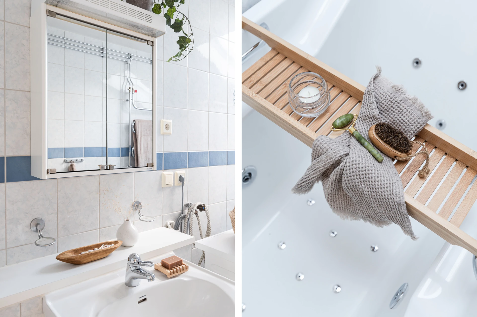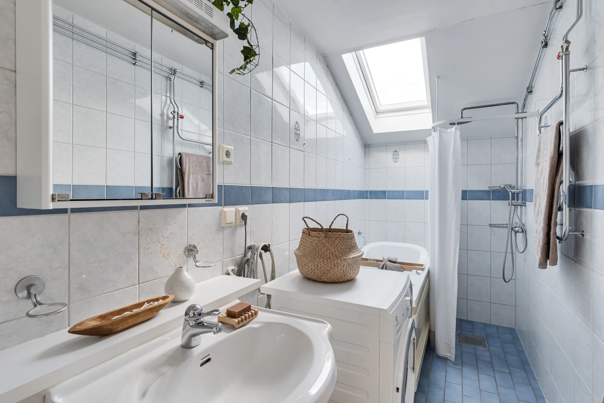 Handfat med kommod, spegelskåp, wc, handdukstork, badkar, dusch samt tvättmaskin. Kaklade väggar och klinkergolv.