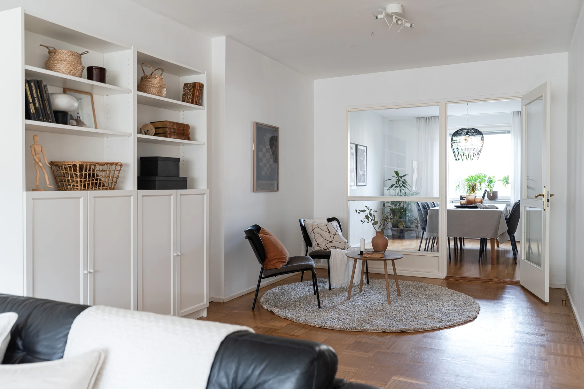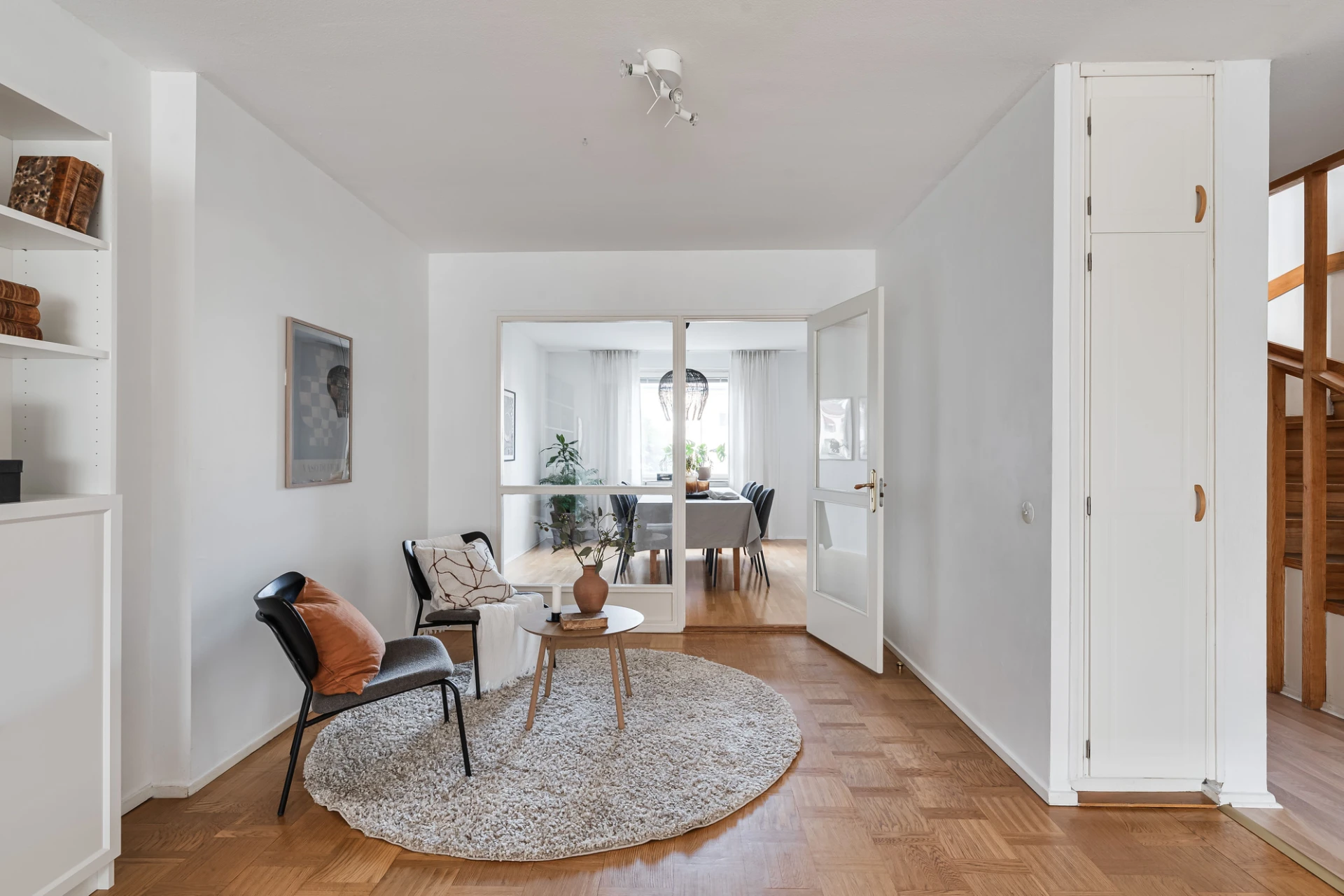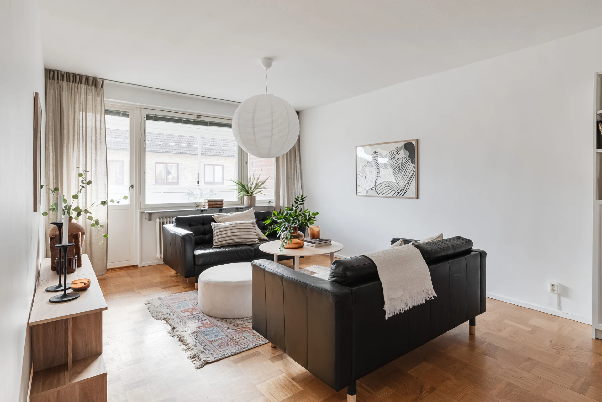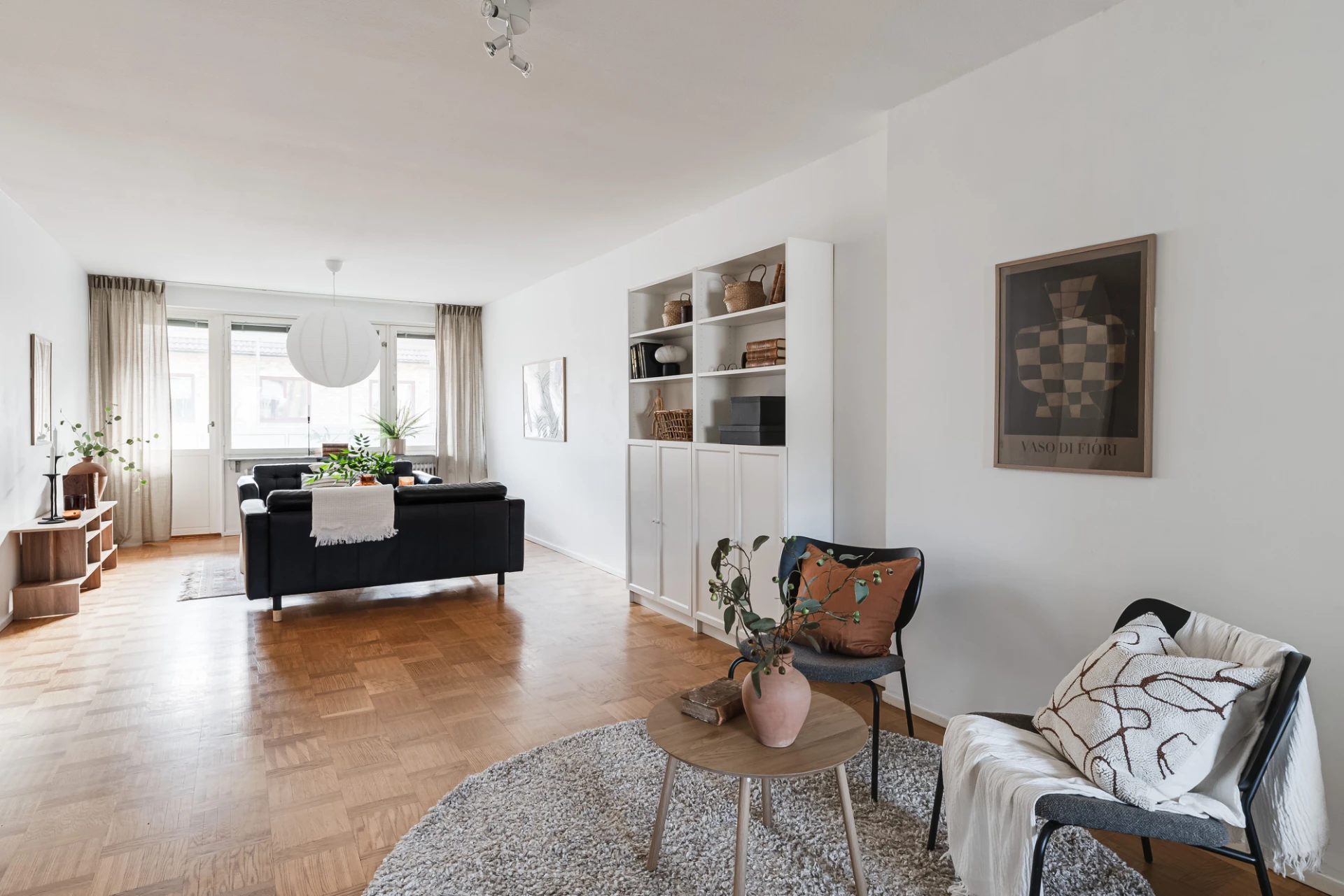 Ljust och luftigt vardagsrum med härligt ljusinsläpp från stora fönsterpartier och utgång till balkong som förlänger rummet under årets varmare månader. Här finns gott om plats för både en inbjudande soffgrupp och en trevlig sitt- eller matgrupp. Rummet ramas in av målade väggar och en vacker stavparkett som ger en tidlös och elegant känsla. Målade väggar och parkettgolv.
