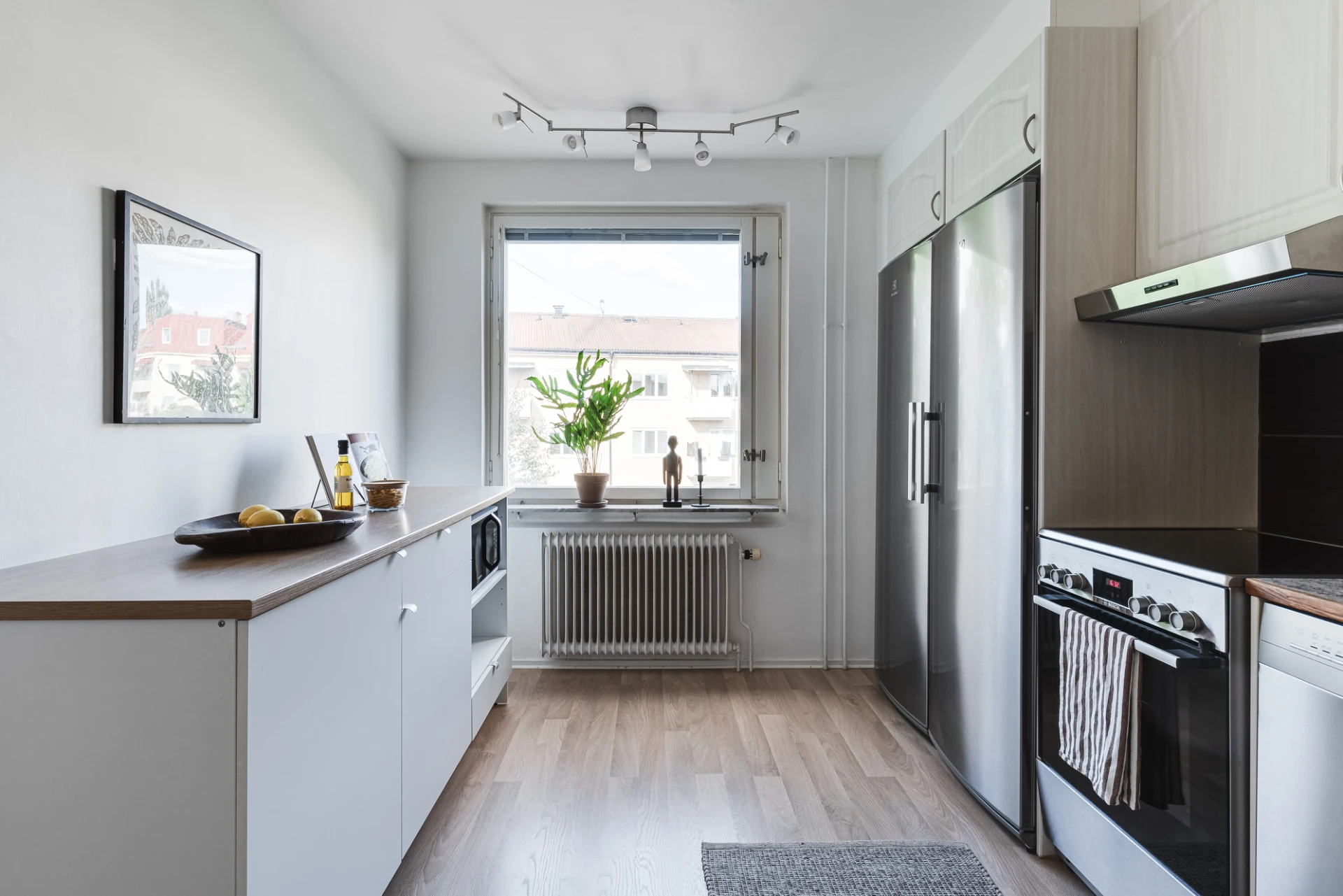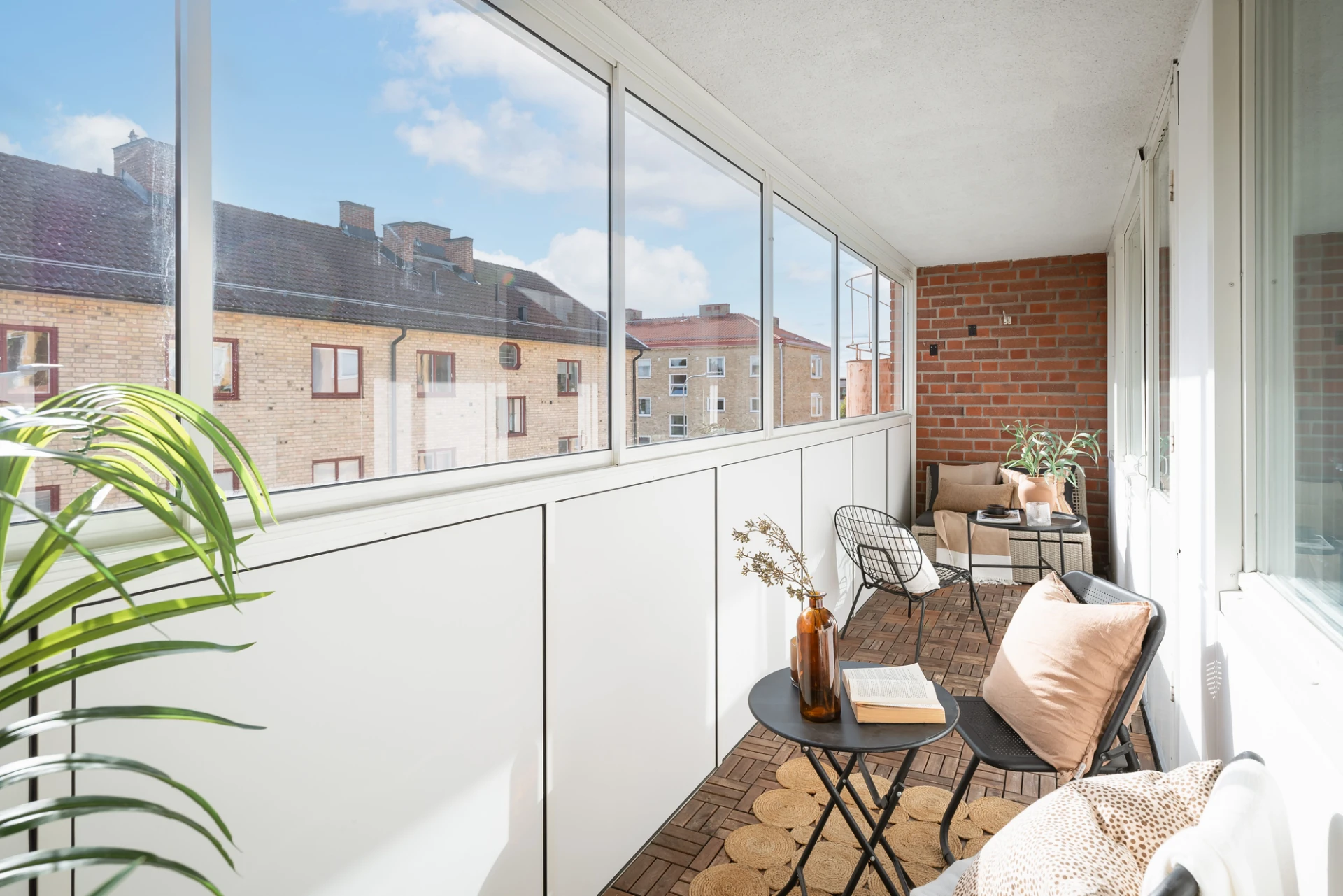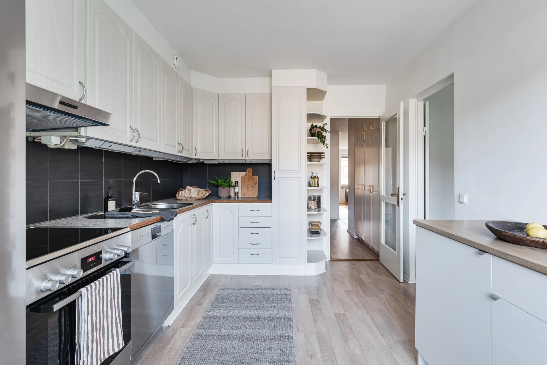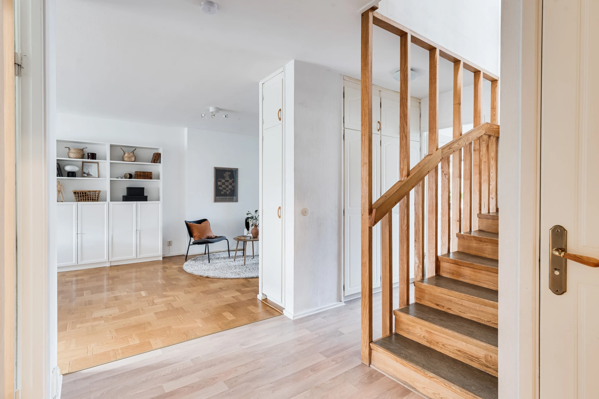 Ljust och luftigt vardagsrum med härligt ljusinsläpp från stora fönsterpartier och utgång till balkong som förlänger rummet under årets varmare månader. Här finns gott om plats för både en inbjudande soffgrupp och en trevlig sitt- eller matgrupp. Rummet ramas in av målade väggar och en vacker stavparkett som ger en tidlös och elegant känsla. Målade väggar och parkettgolv.