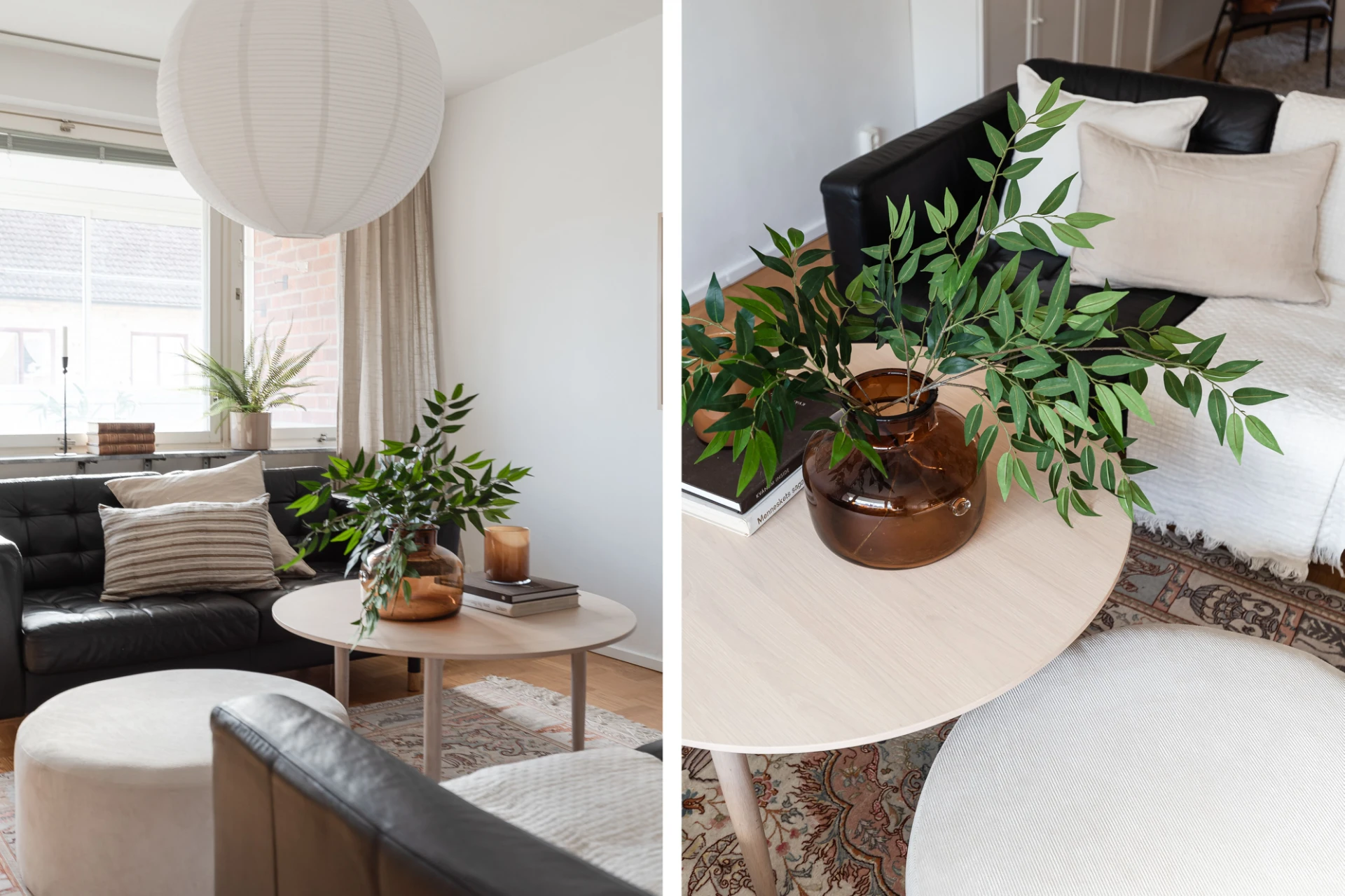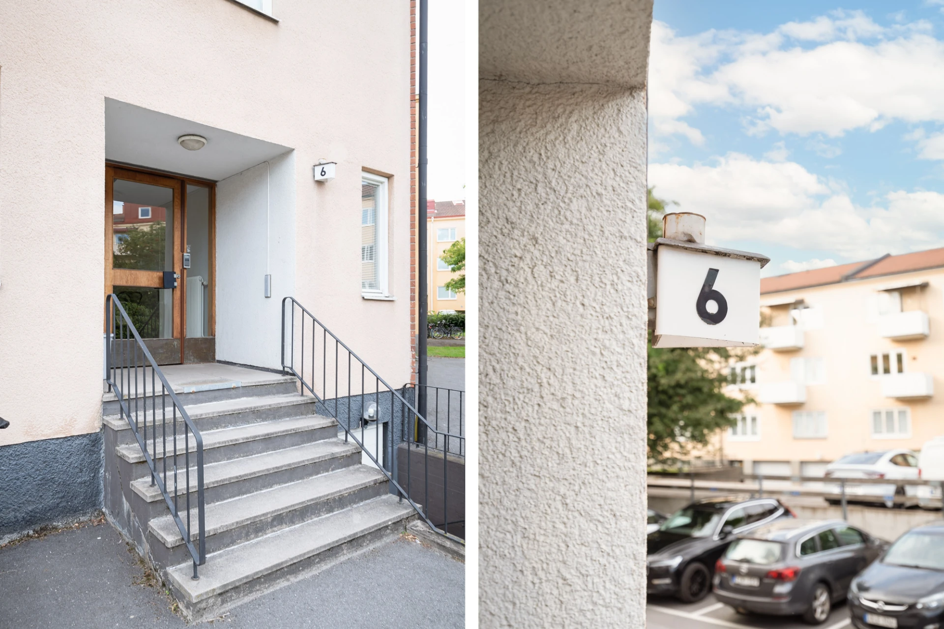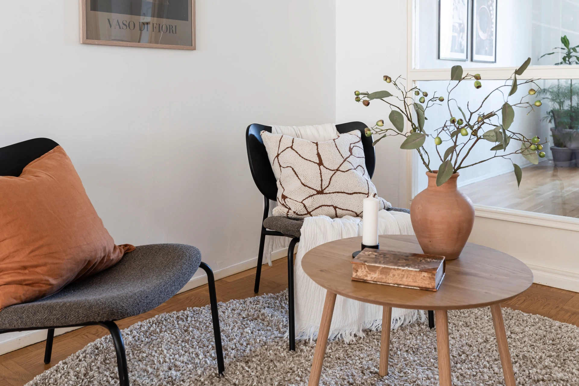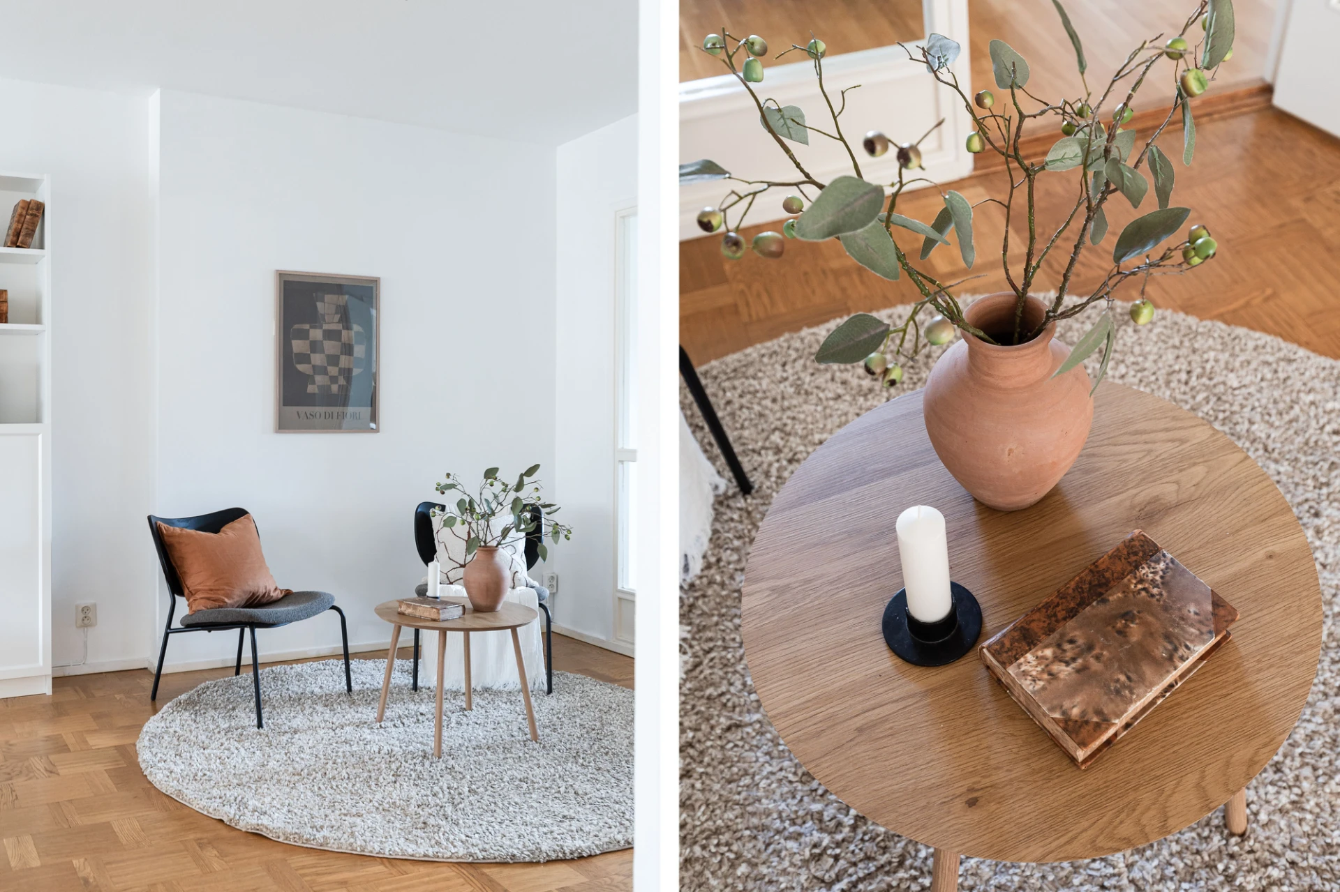 Ljust och luftigt vardagsrum med härligt ljusinsläpp från stora fönsterpartier och utgång till balkong som förlänger rummet under årets varmare månader. Här finns gott om plats för både en inbjudande soffgrupp och en trevlig sitt- eller matgrupp. Rummet ramas in av målade väggar och en vacker stavparkett som ger en tidlös och elegant känsla. Målade väggar och parkettgolv.