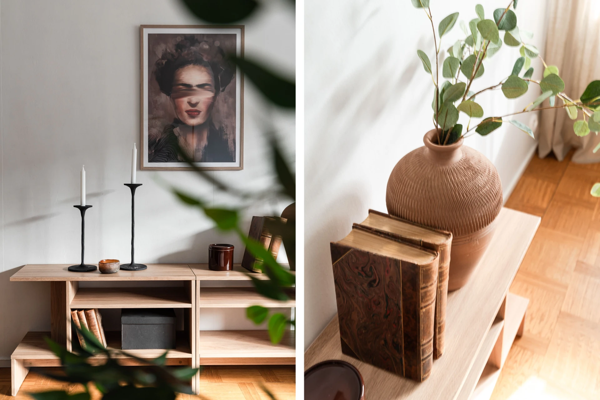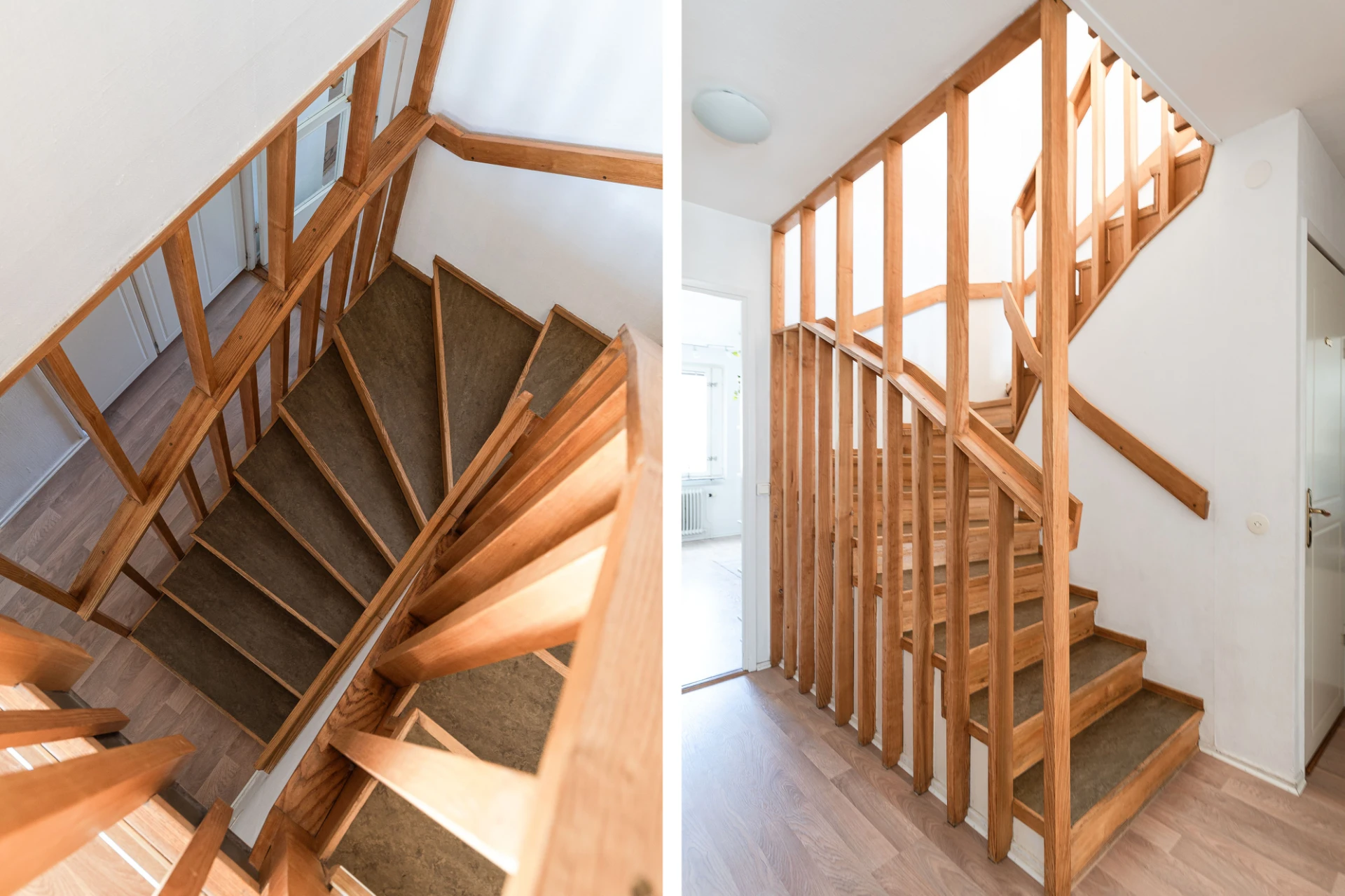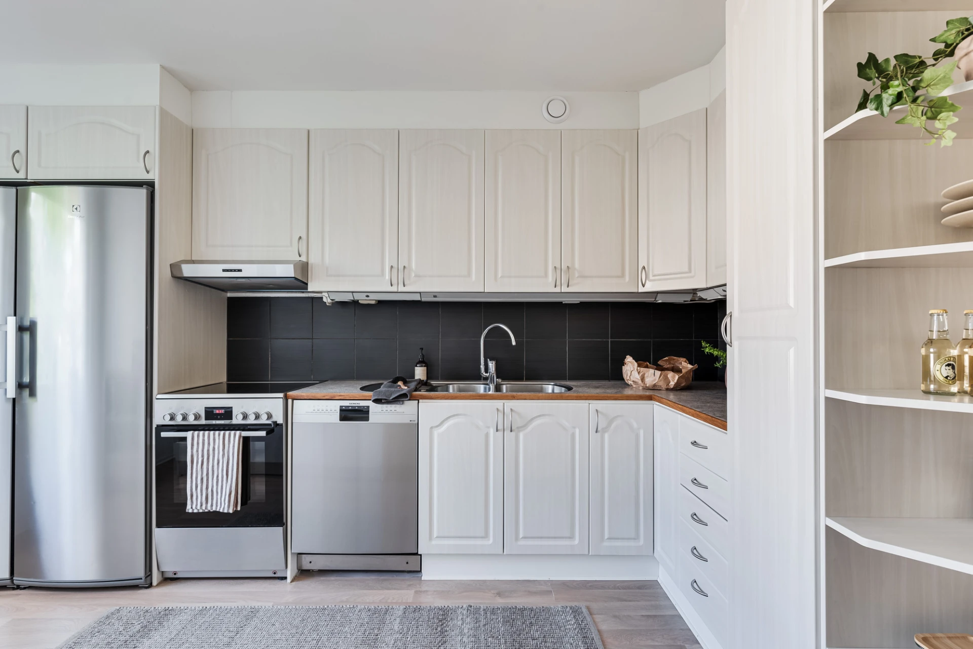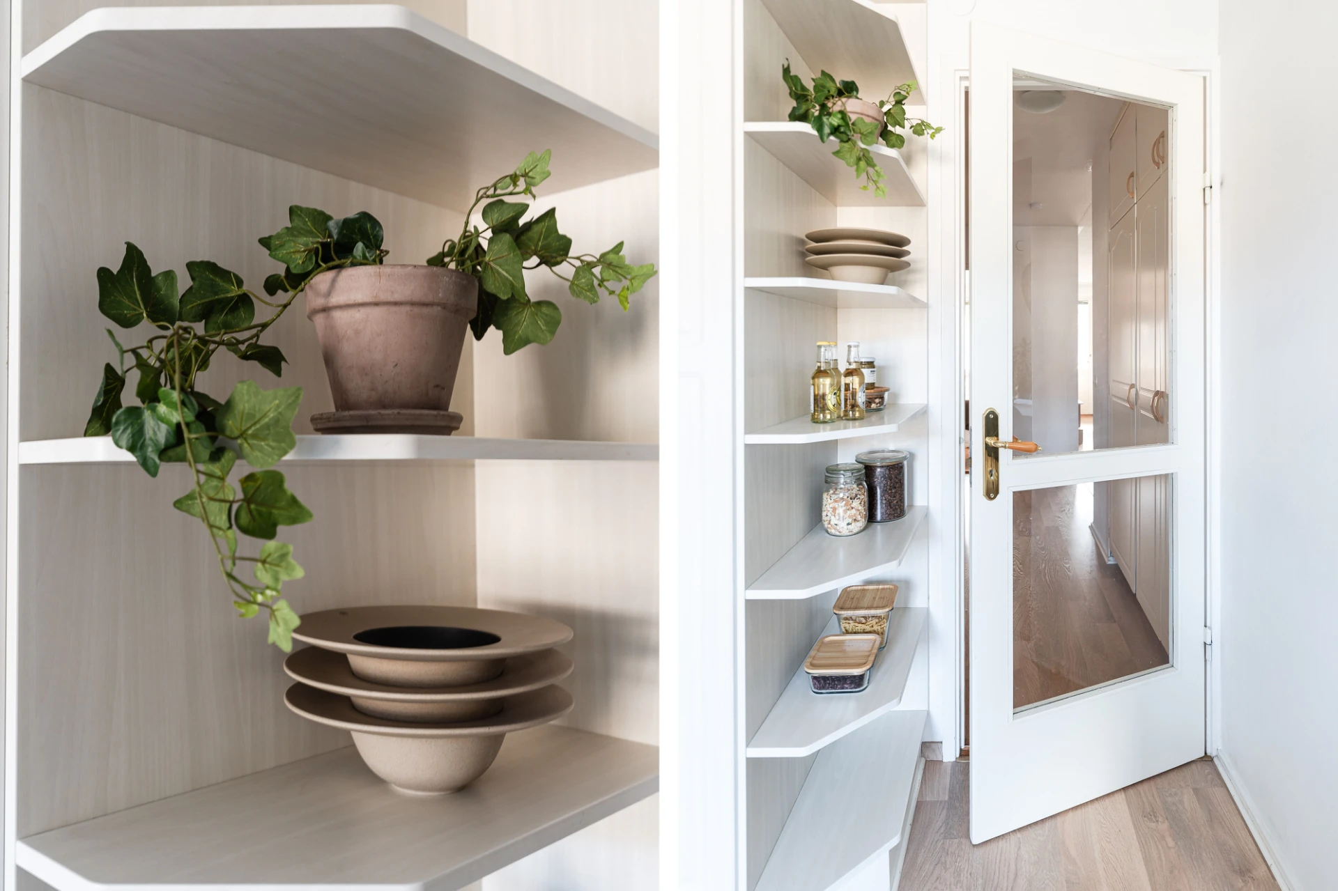 Ljust och luftigt vardagsrum med härligt ljusinsläpp från stora fönsterpartier och utgång till balkong som förlänger rummet under årets varmare månader. Här finns gott om plats för både en inbjudande soffgrupp och en trevlig sitt- eller matgrupp. Rummet ramas in av målade väggar och en vacker stavparkett som ger en tidlös och elegant känsla. Målade väggar och parkettgolv.