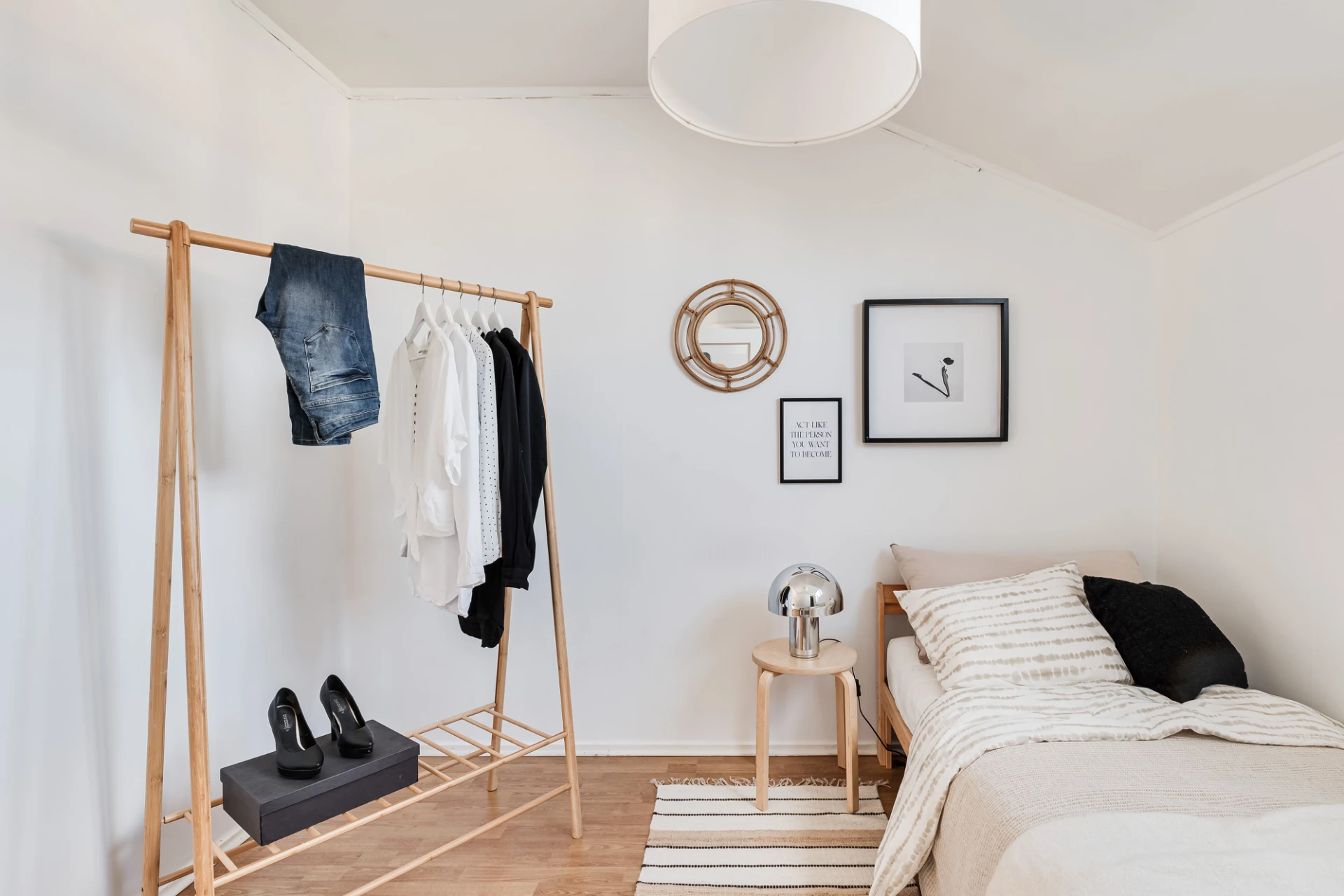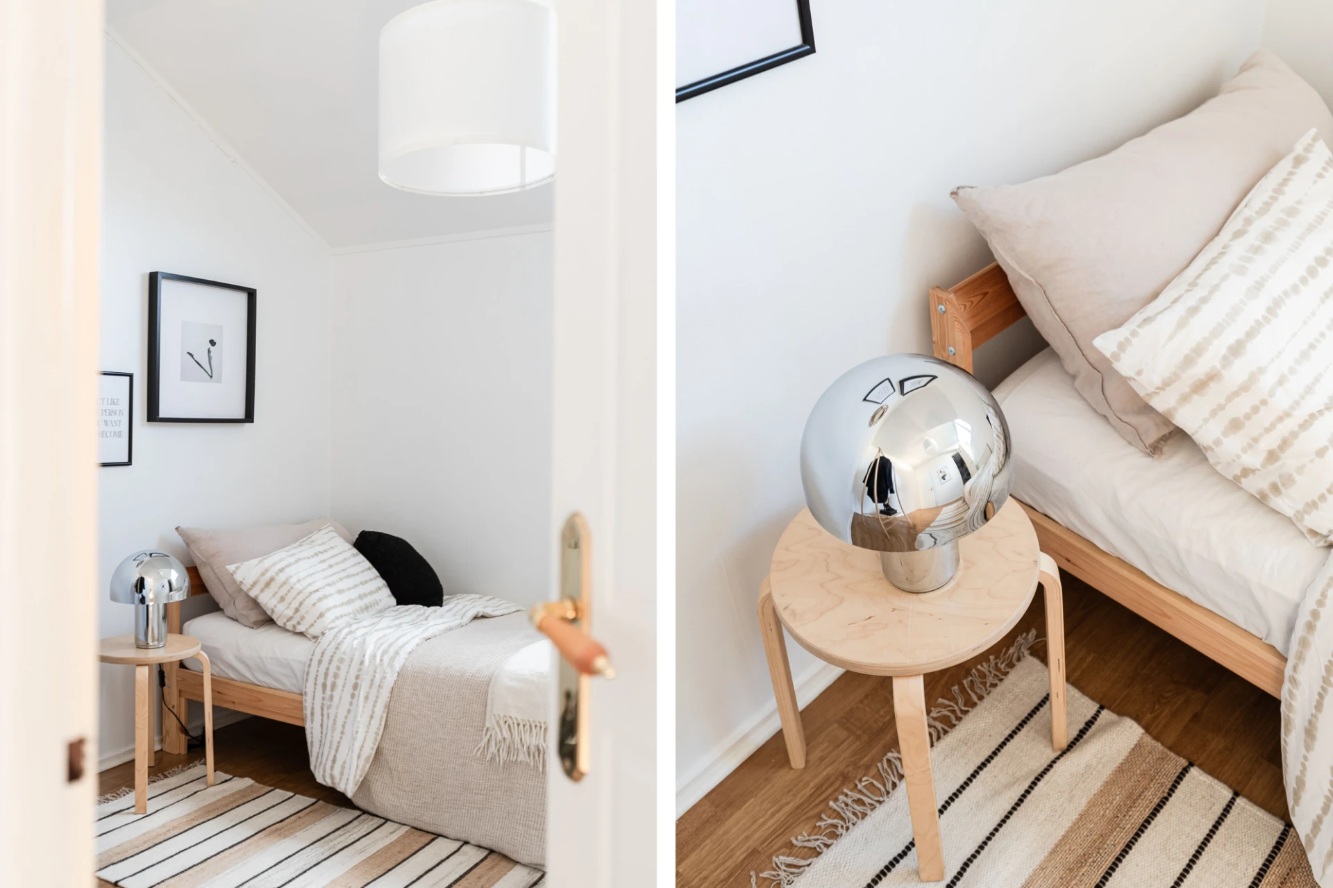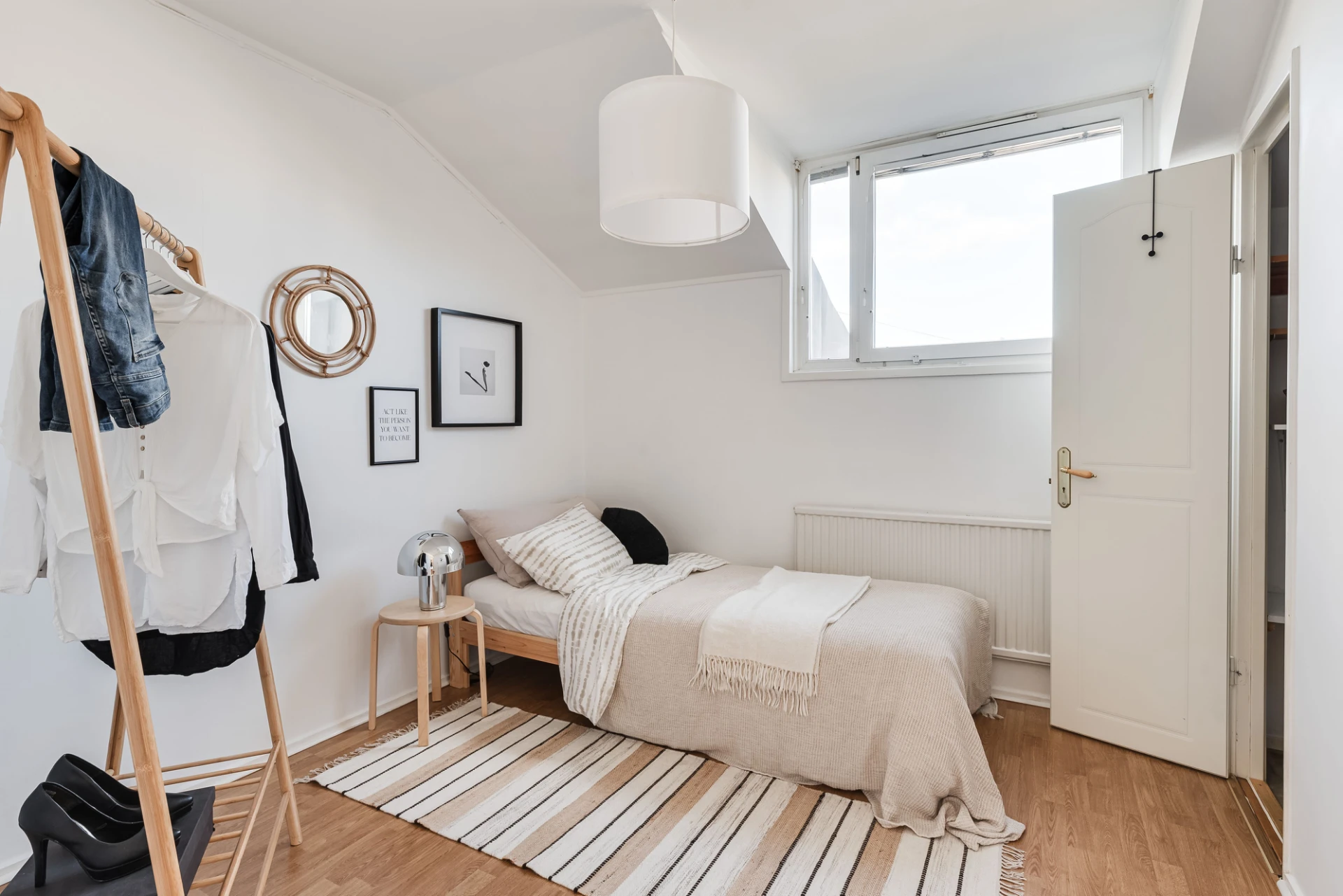 Ett mångsidigt sovrum med utrymme för en enkelsäng och en praktisk arbetshörna. Perfekt som barnrum eller hemmakontor. Målade väggar och laminatgolv.