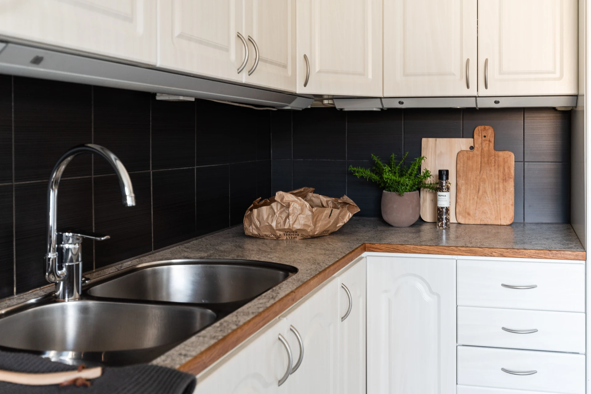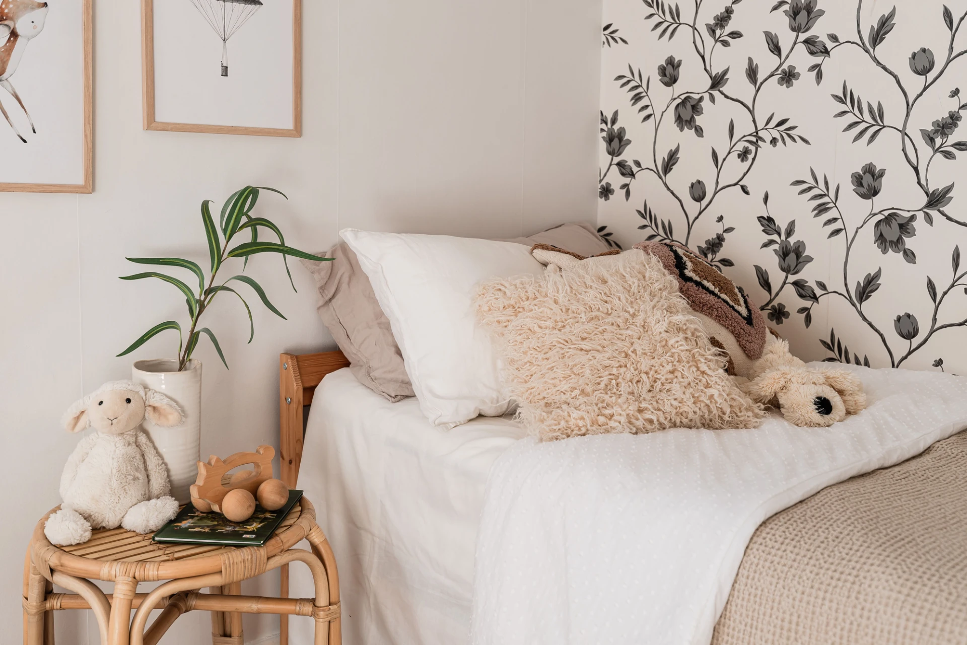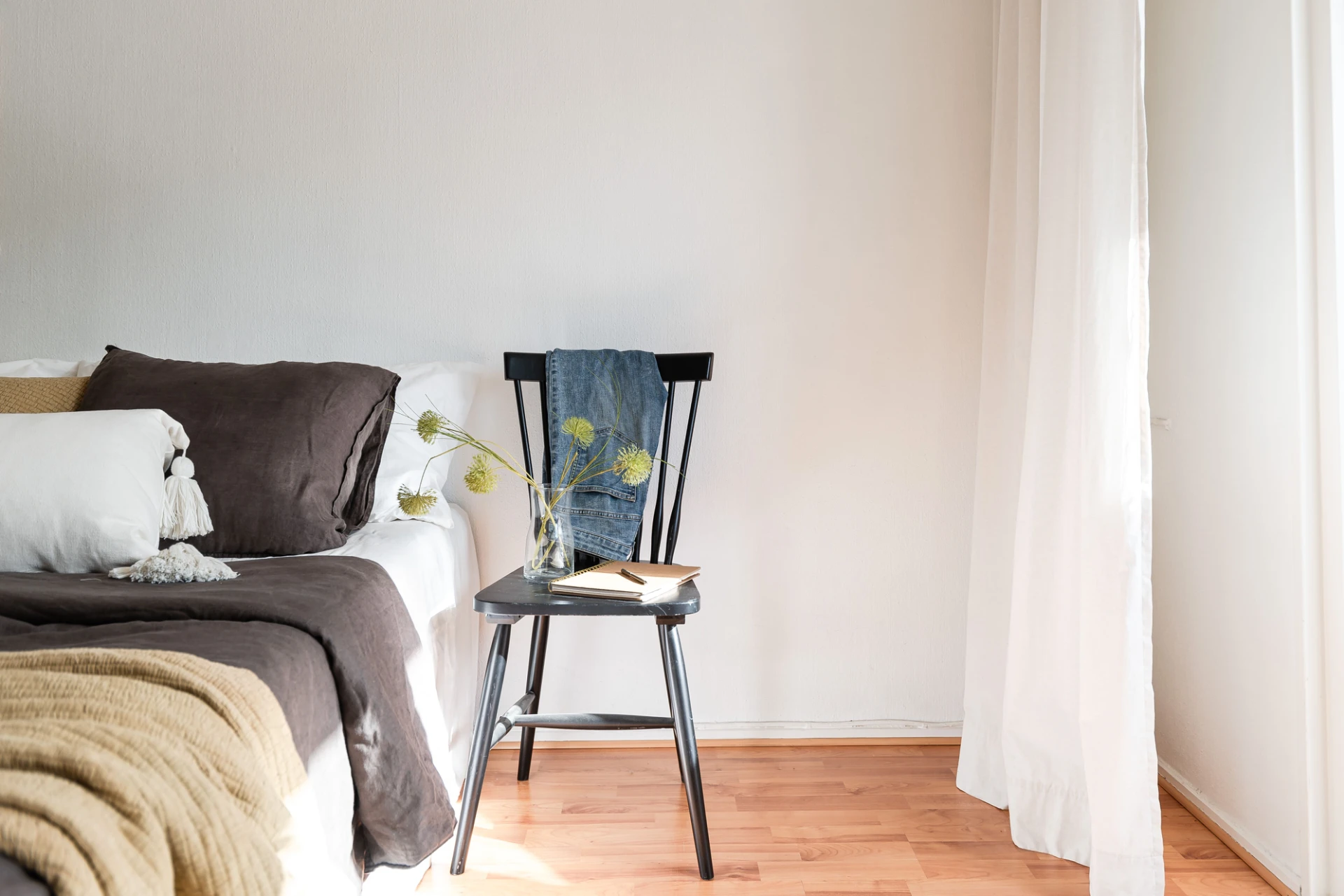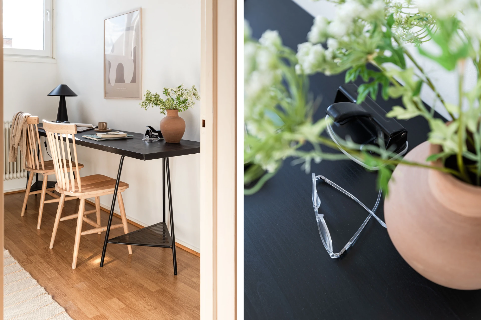 Ett mångsidigt sovrum med utrymme för en enkelsäng och en praktisk arbetshörna. Perfekt som barnrum eller hemmakontor. Målade väggar och laminatgolv.