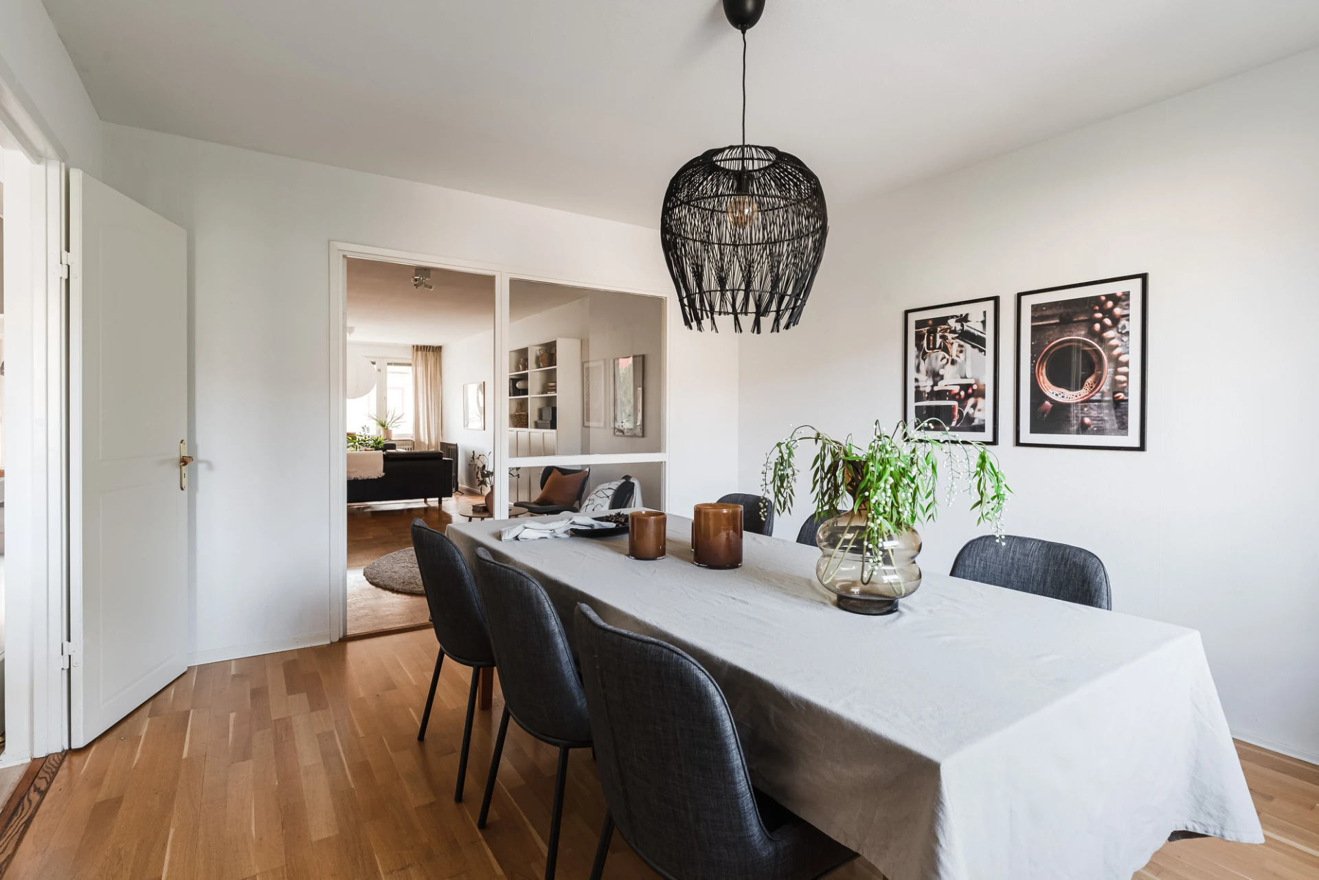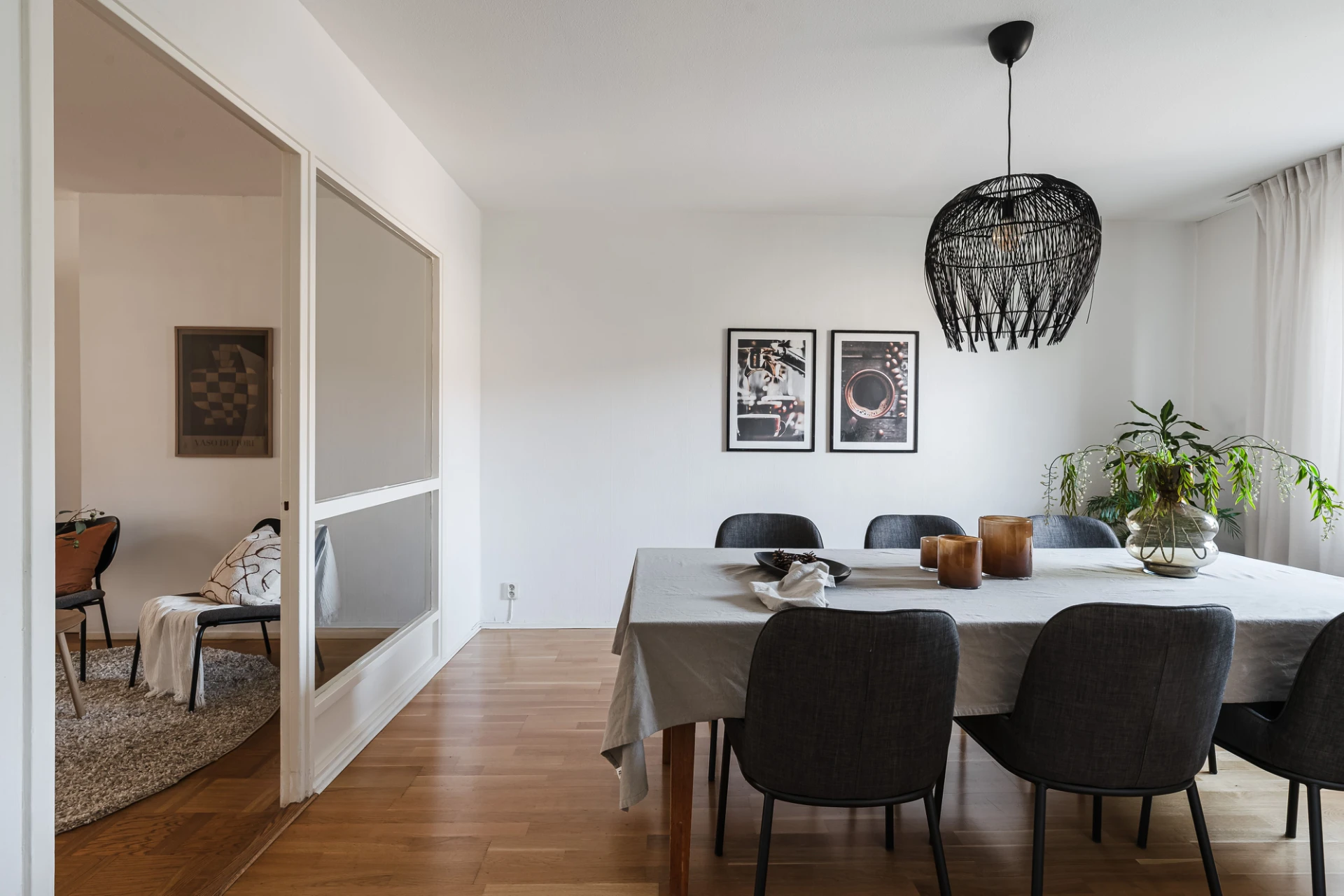 Rymligt matrum med fint ljusinsläpp från fönster samt glasparti mot vardagsrum som skapar en härlig känsla av rymd och öppenhet. Här finns gott om plats för större matbord – perfekt för trevliga middagar och sociala sammanhang.