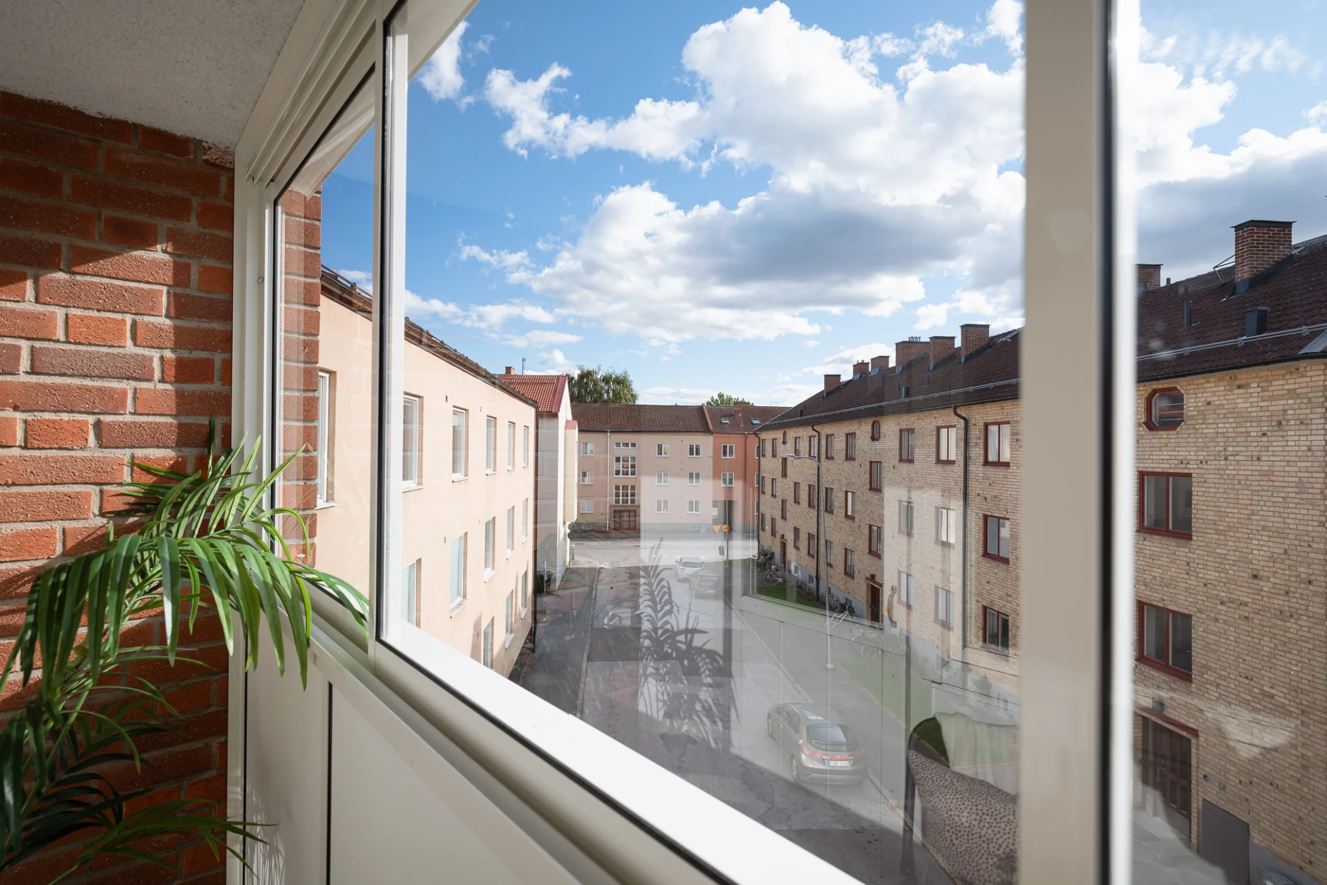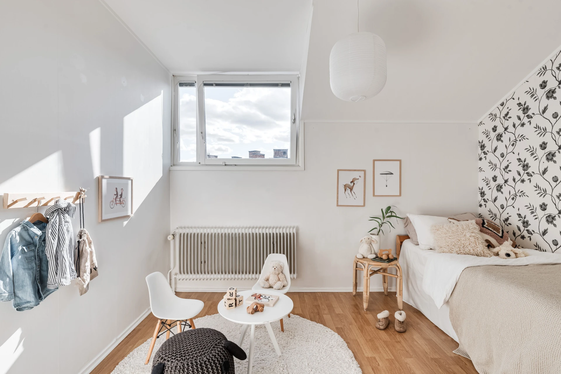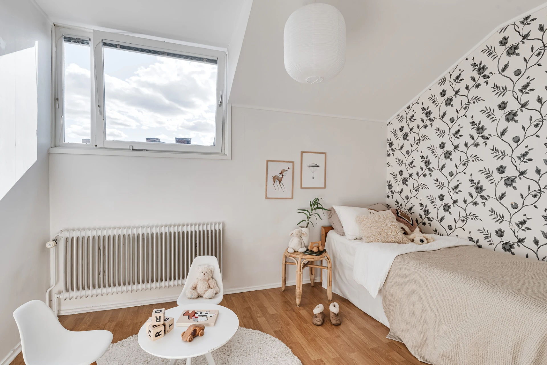 Trivsamt sovrum som passar perfekt som barnrum. Här finns plats för enkelsäng, lekhörna och övrigt möblemang. Ett ljust och inbjudande rum som enkelt kan anpassas efter behov. Målade och tapetserade väggar samt laminatgolv.