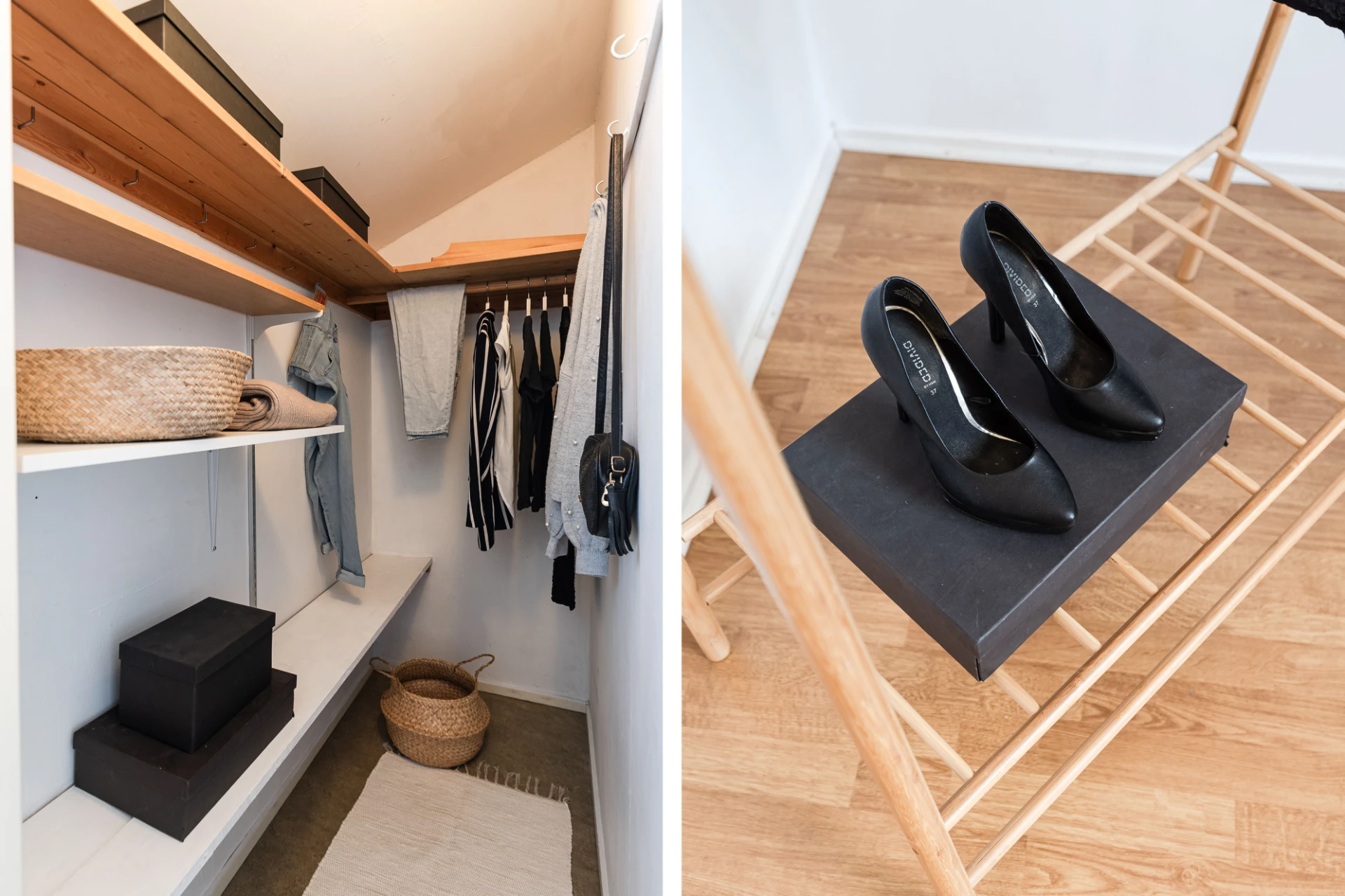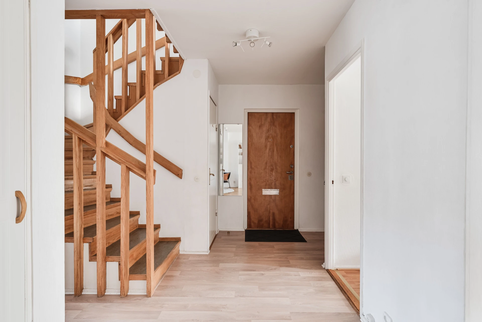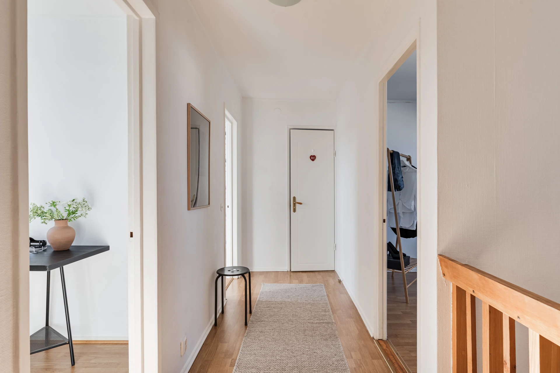 Välkomnande hall med plats för avhängning och förvaring i tre garderober. Målade väggar och laminatgolv.