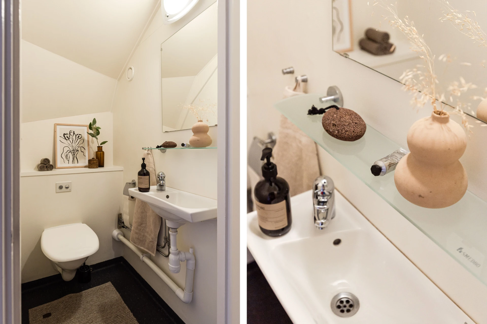 Handfat, spegel och wc. Målade väggar och våtrumsmatta på golv.