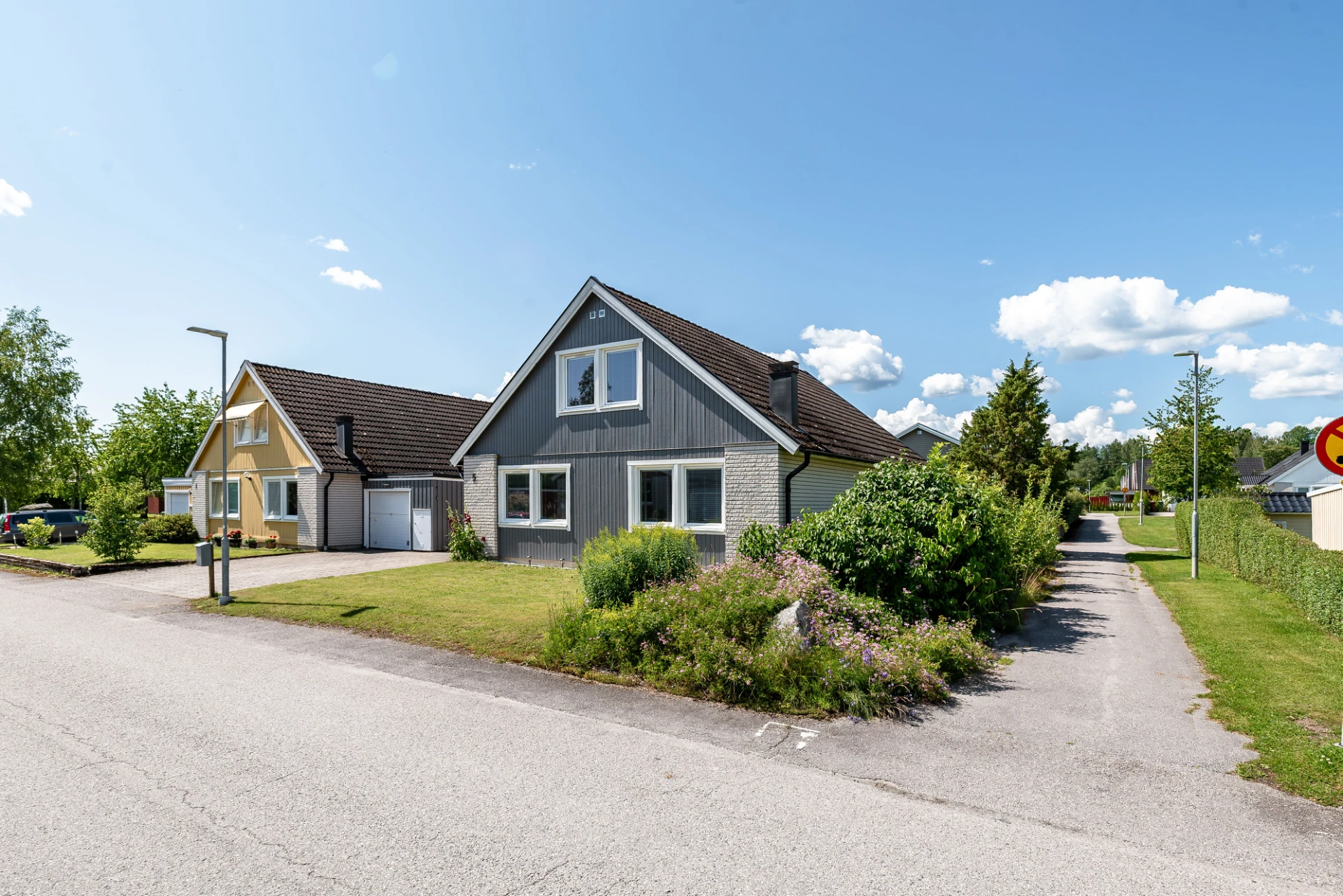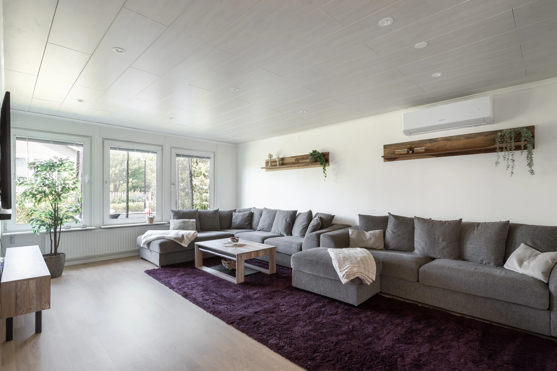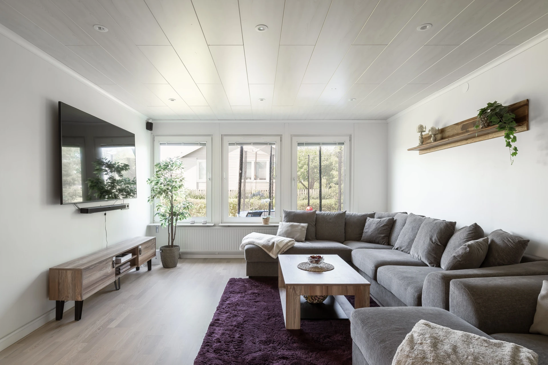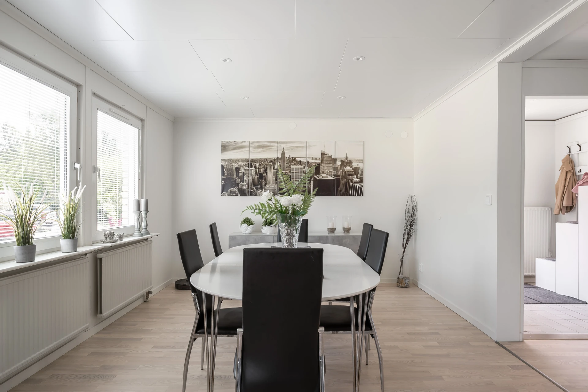 Generöst vardagsrum med härligt ljusinsläpp från stora fönsterpartier. Rummet erbjuder gott om plats för både en inbjudande soffgrupp och ett rymligt matbord – en perfekt samlingspunkt för både vardagsmys och sociala tillställningar. Målade väggar och parkettgolv.