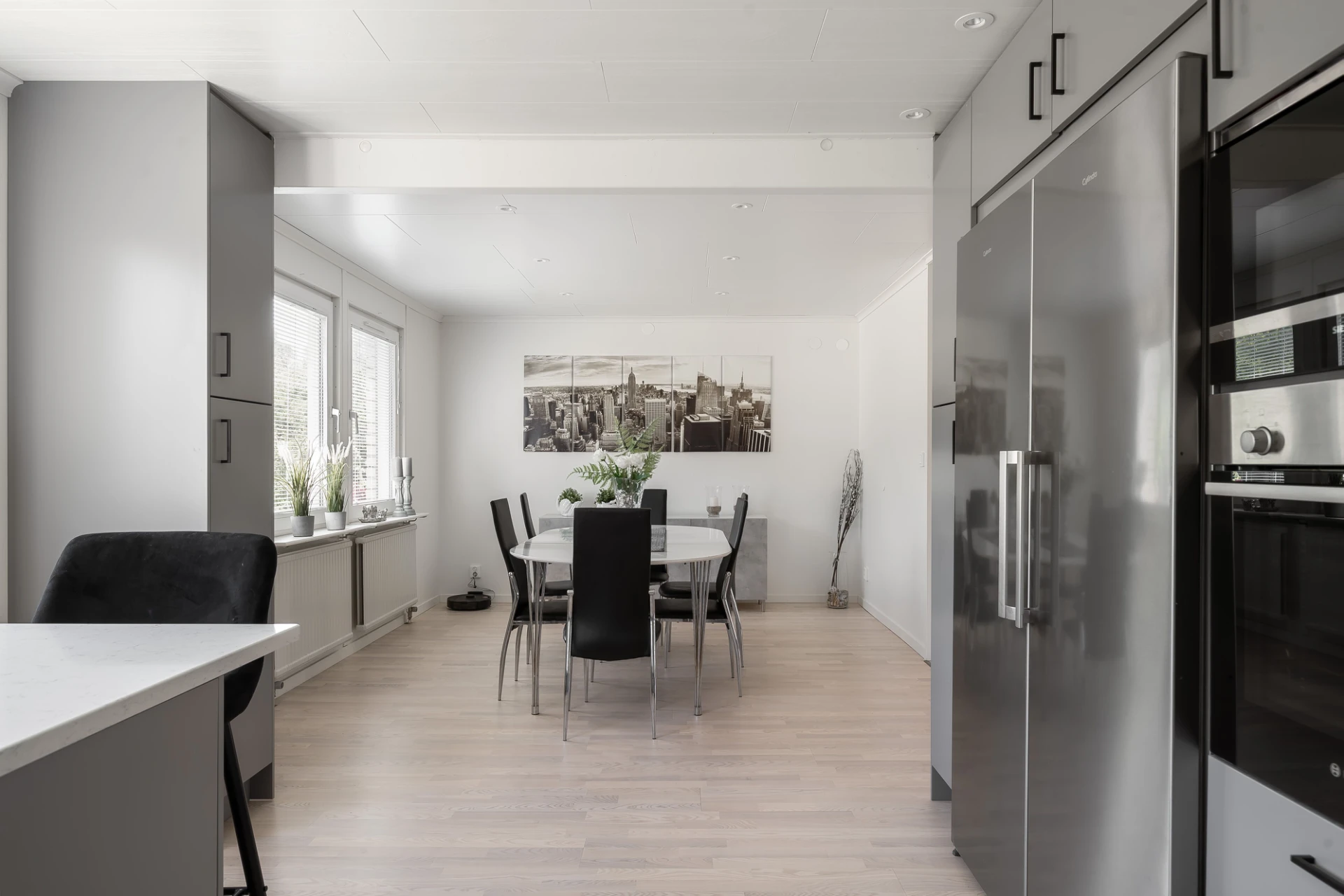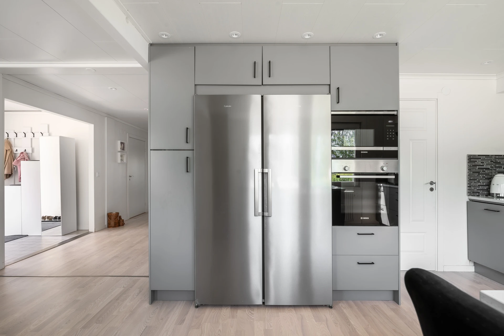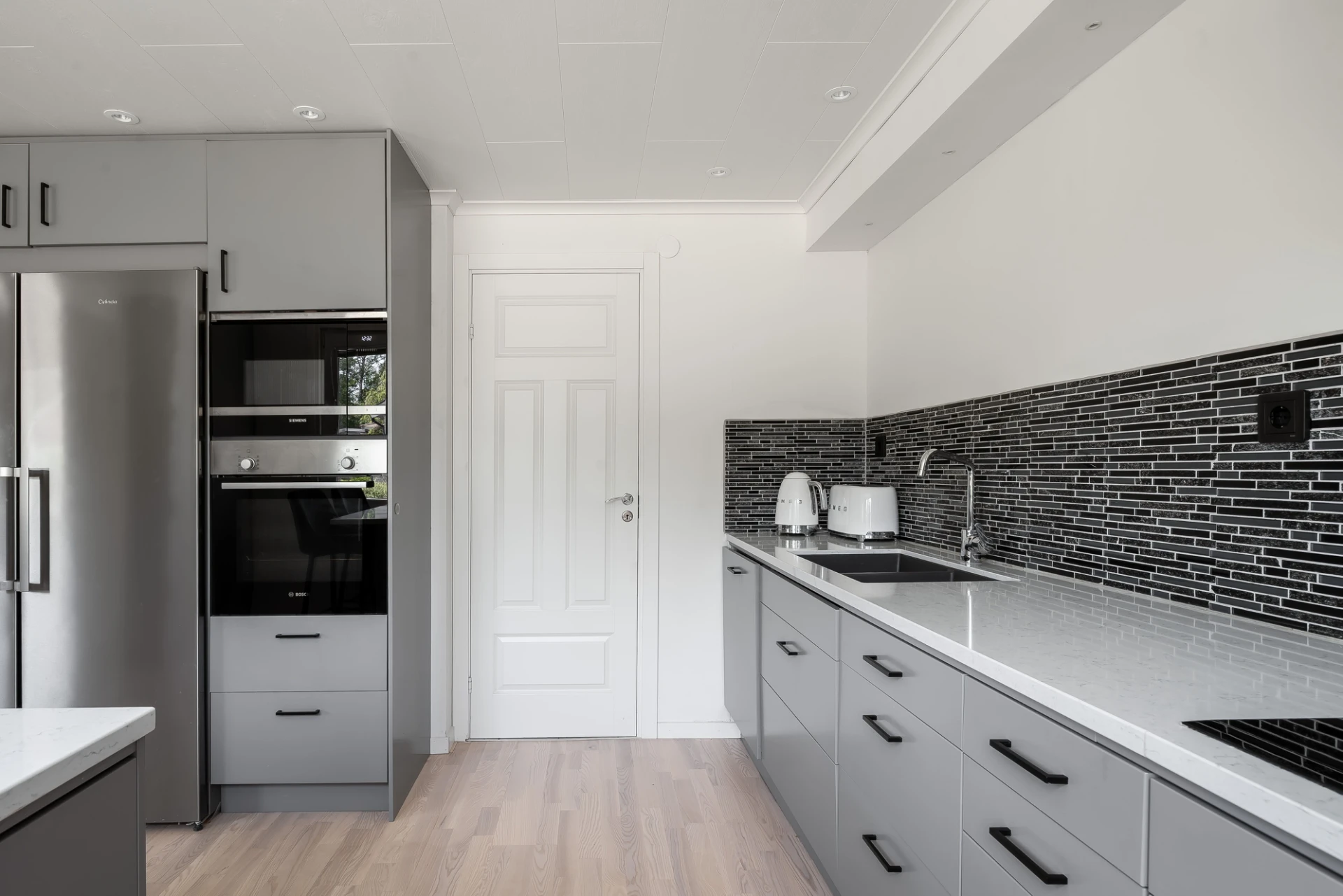 Smakfullt kök i modern grå ton med generös förvaring i skåp och lådor. Här finns en praktisk köksö som både skapar extra arbetsyta och blir en naturlig samlingspunkt. Stenbänkskiva och kakel som stänkskydd ger en stilren och exklusiv känsla. Den maskinella utrustningen är komplett med fläkt, häll, inbyggd ugn och mikrovågsugn, diskmaskin samt kyl och frys i fullhöjd. I anslutning till köket finns ett stort matrum med plats för 8–10 personer – perfekt för både vardagsmiddagar och festliga tillställningar. Målade vägar och parkettgolv.