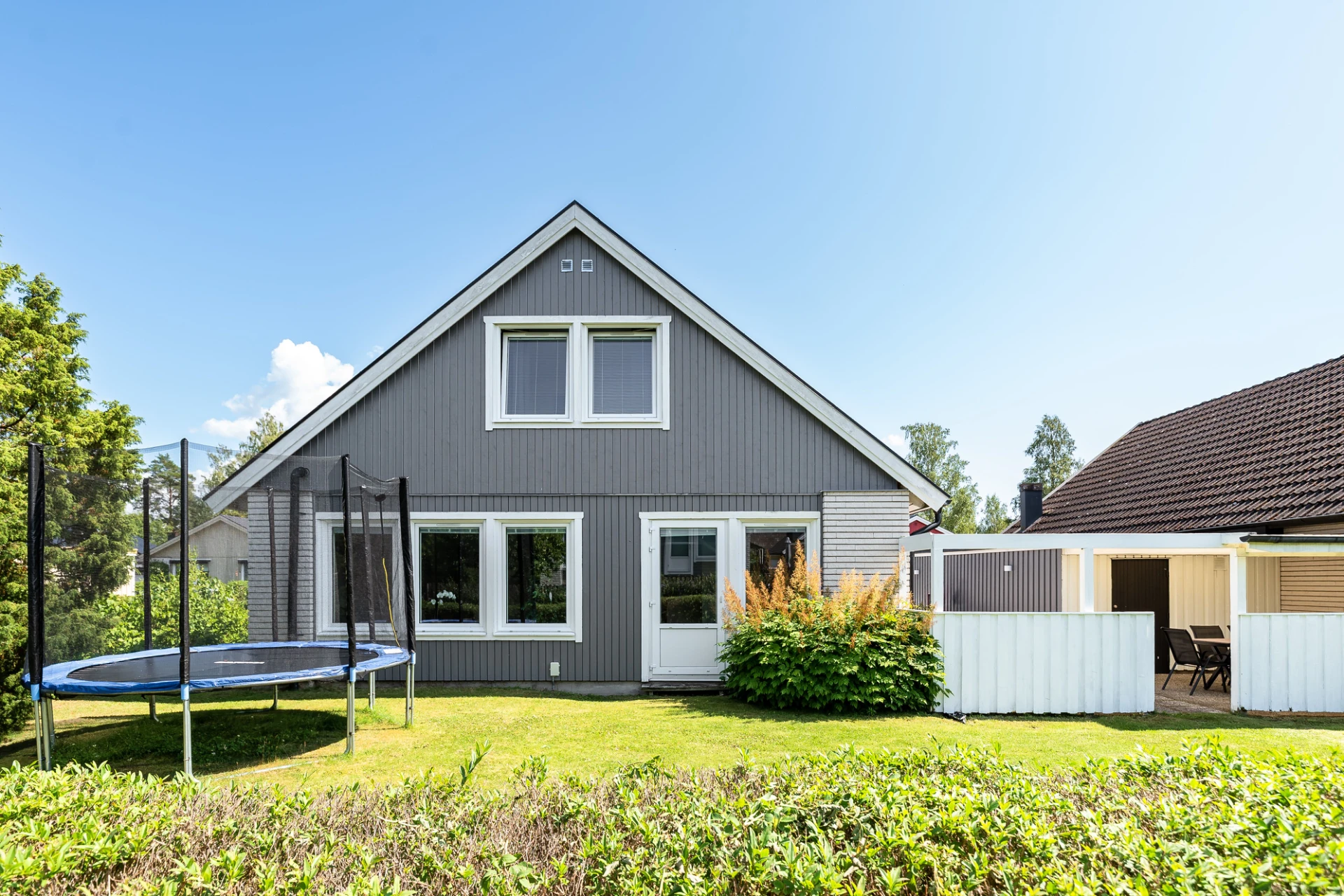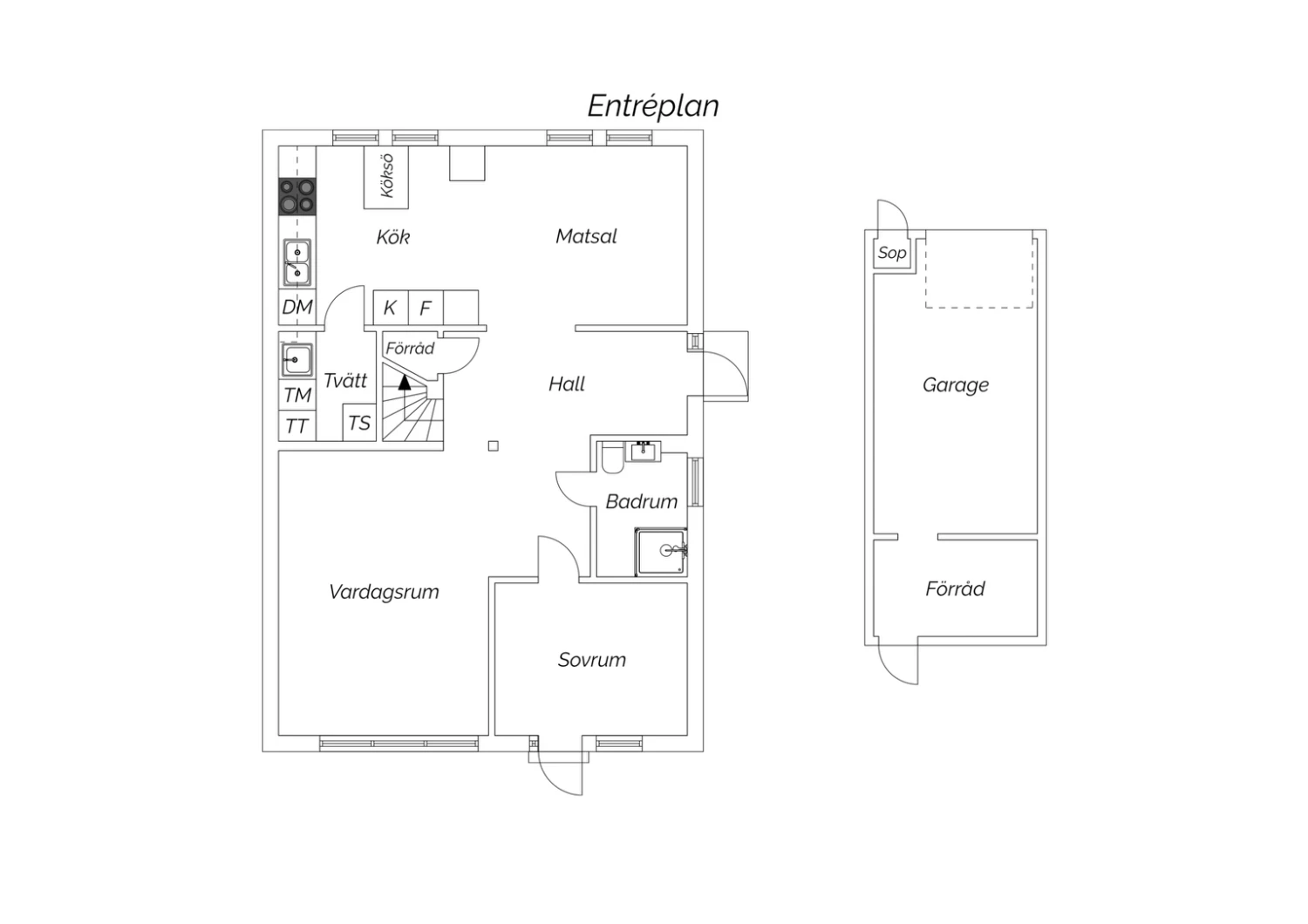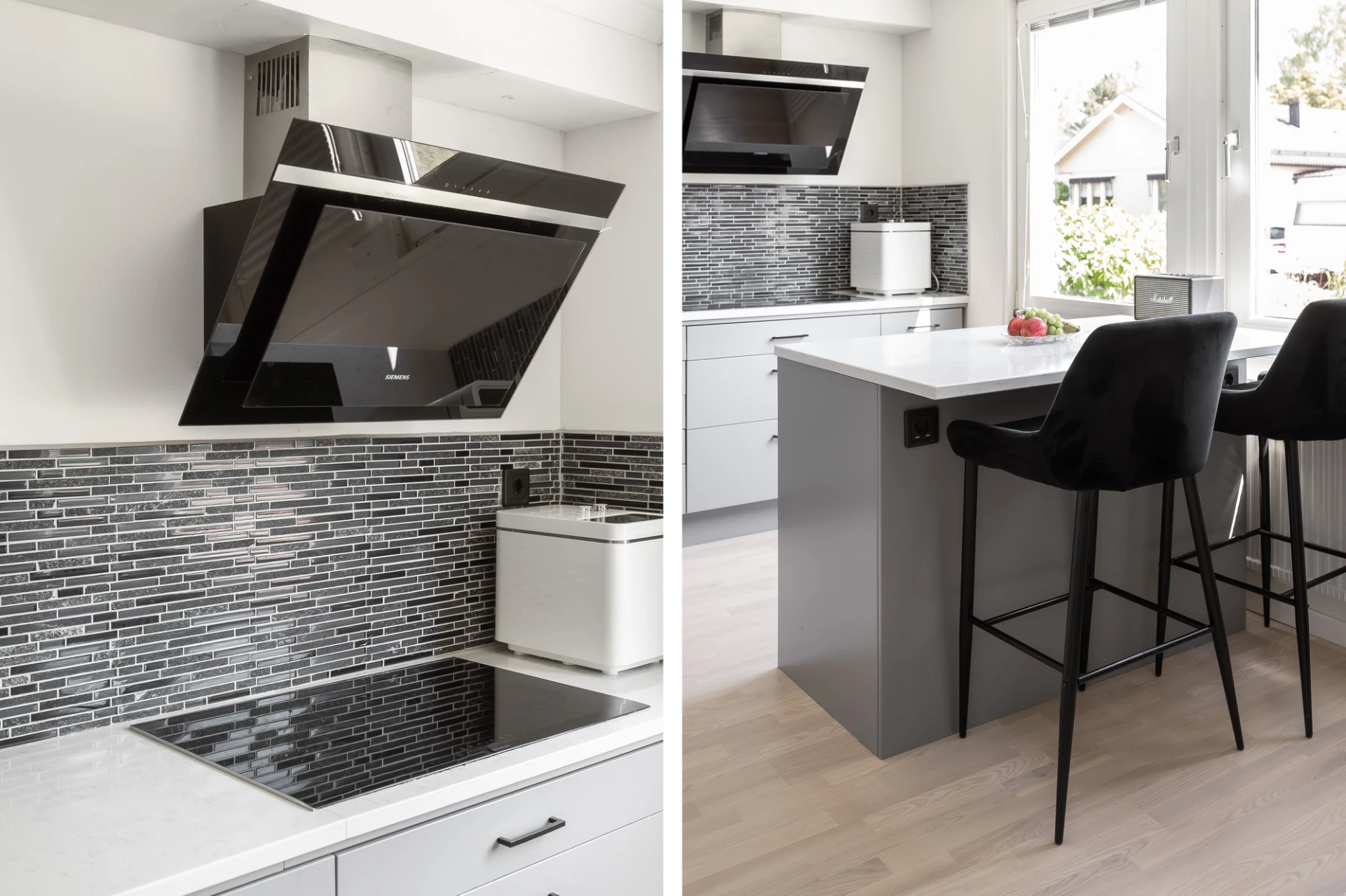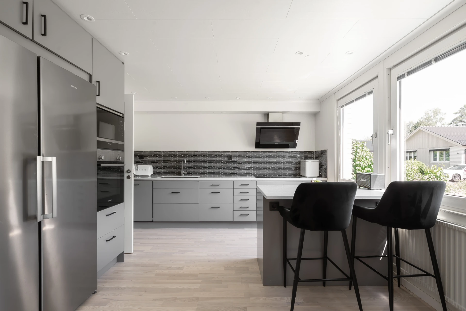 Smakfullt kök i modern grå ton med generös förvaring i skåp och lådor. Här finns en praktisk köksö som både skapar extra arbetsyta och blir en naturlig samlingspunkt. Stenbänkskiva och kakel som stänkskydd ger en stilren och exklusiv känsla. Den maskinella utrustningen är komplett med fläkt, häll, inbyggd ugn och mikrovågsugn, diskmaskin samt kyl och frys i fullhöjd. I anslutning till köket finns ett stort matrum med plats för 8–10 personer – perfekt för både vardagsmiddagar och festliga tillställningar. Målade vägar och parkettgolv.