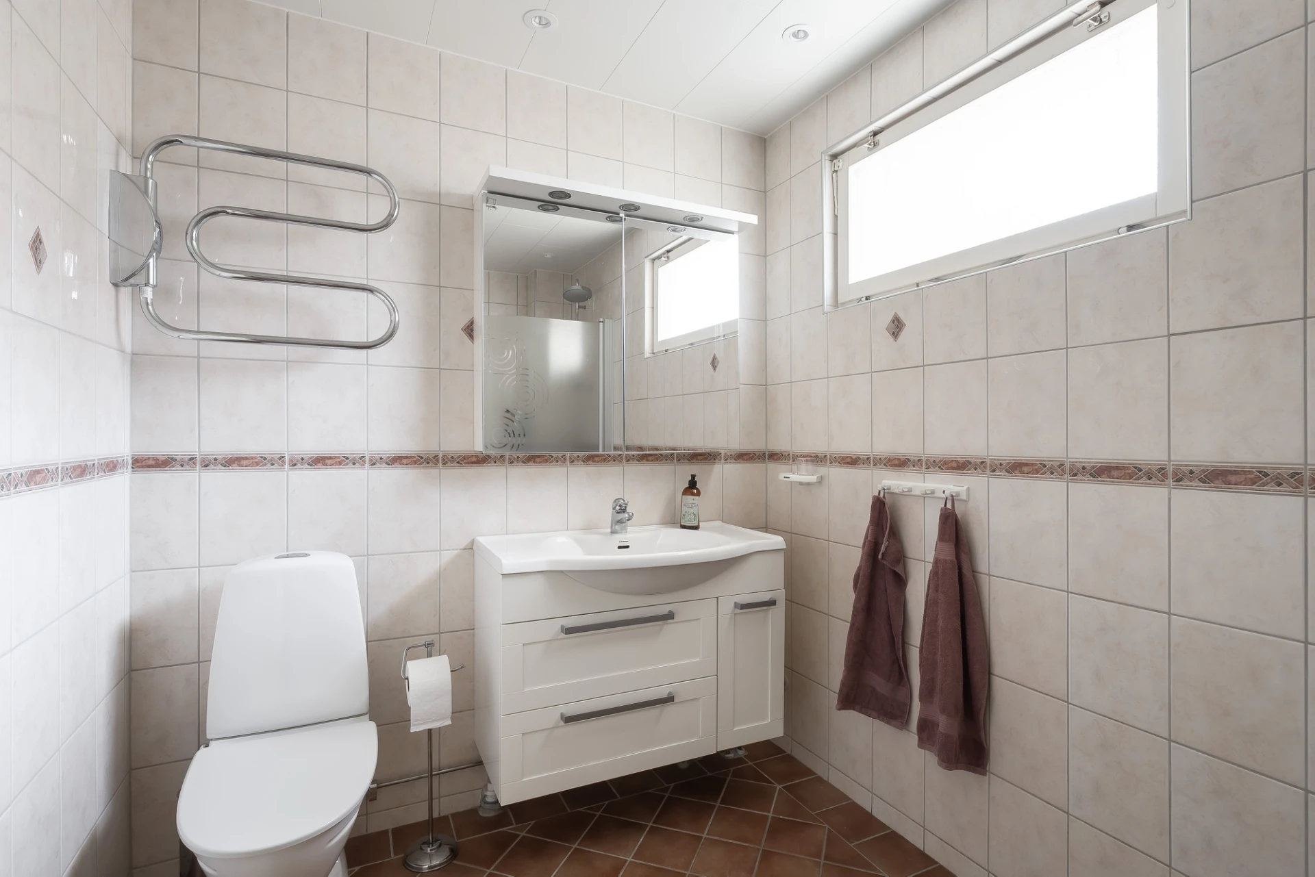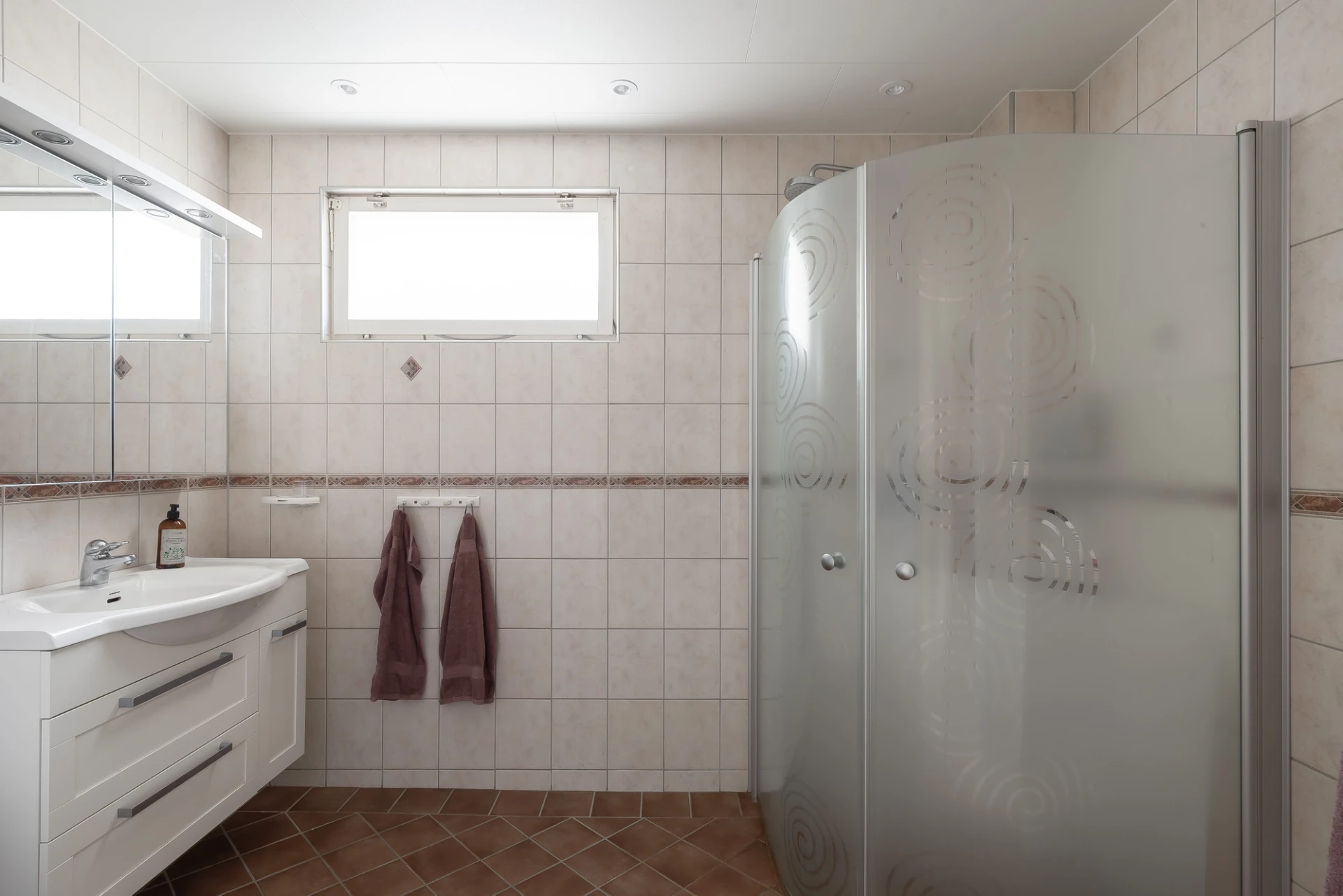 Handfat med kommod, spegelskåp, wc, handdukstork samt dusch med vikdörrar. Kaklade väggar och klinkergolv.