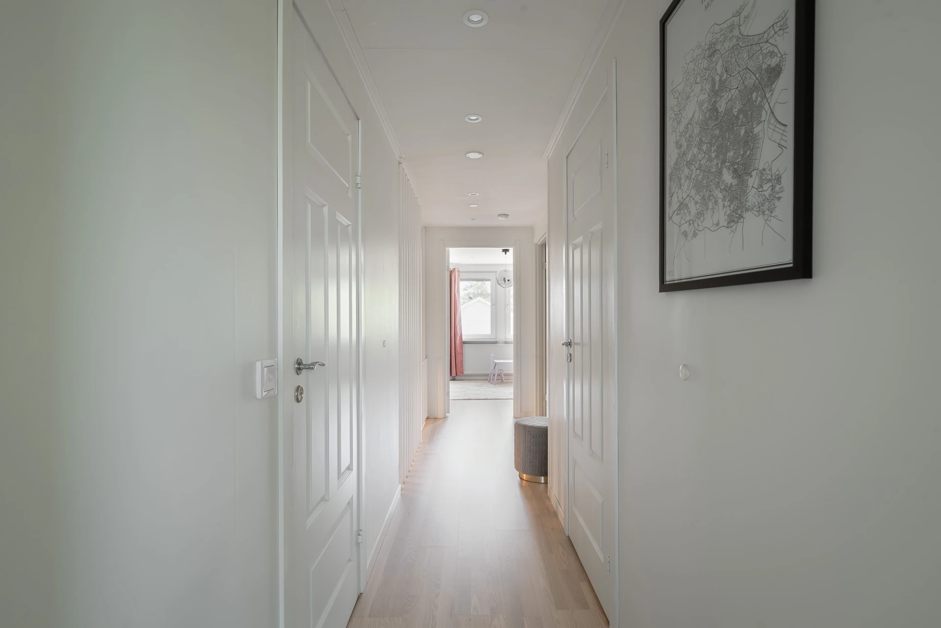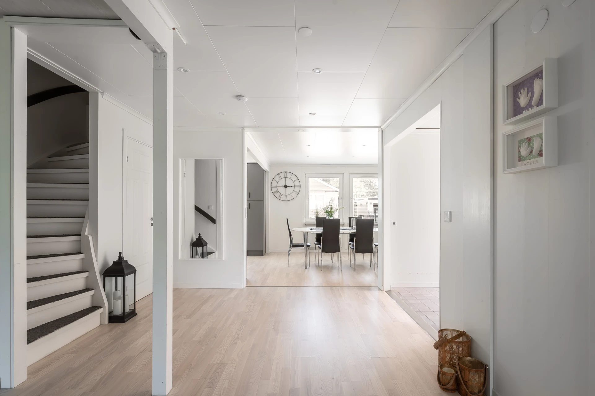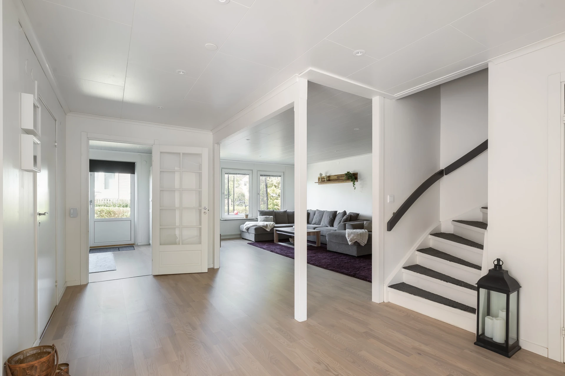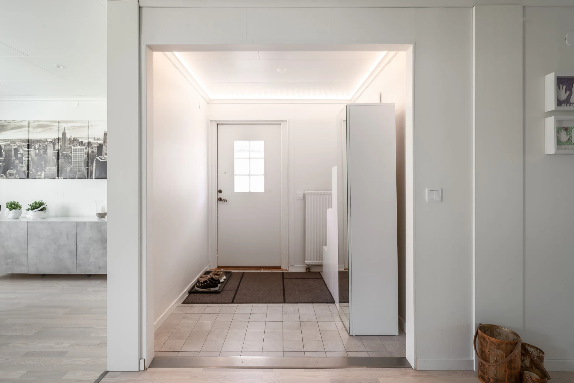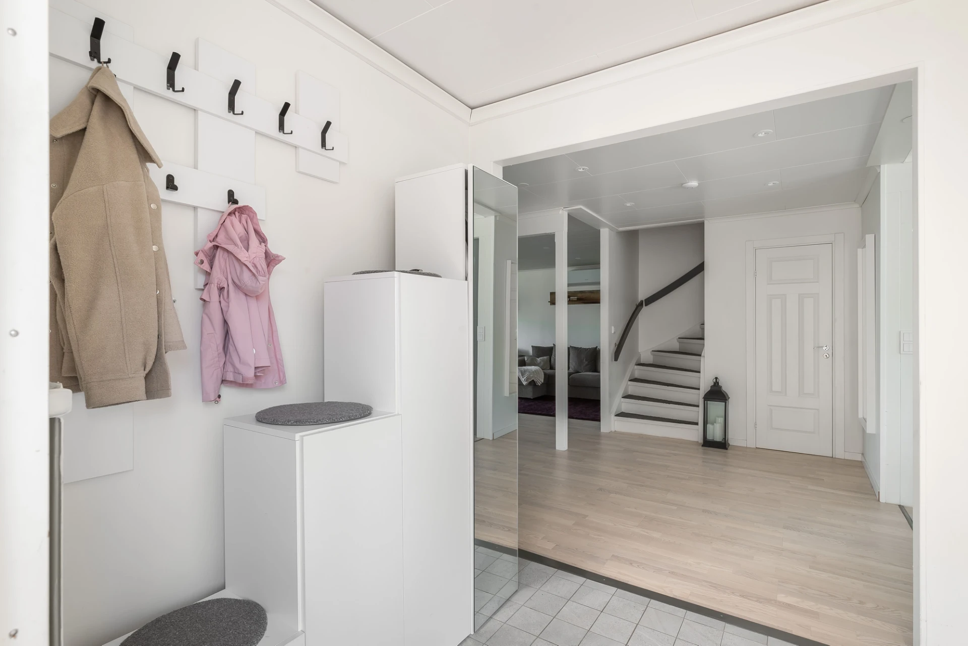 Hallen är ljus och rymlig med plats för avhängning. Målade väggar och klinkergolv.