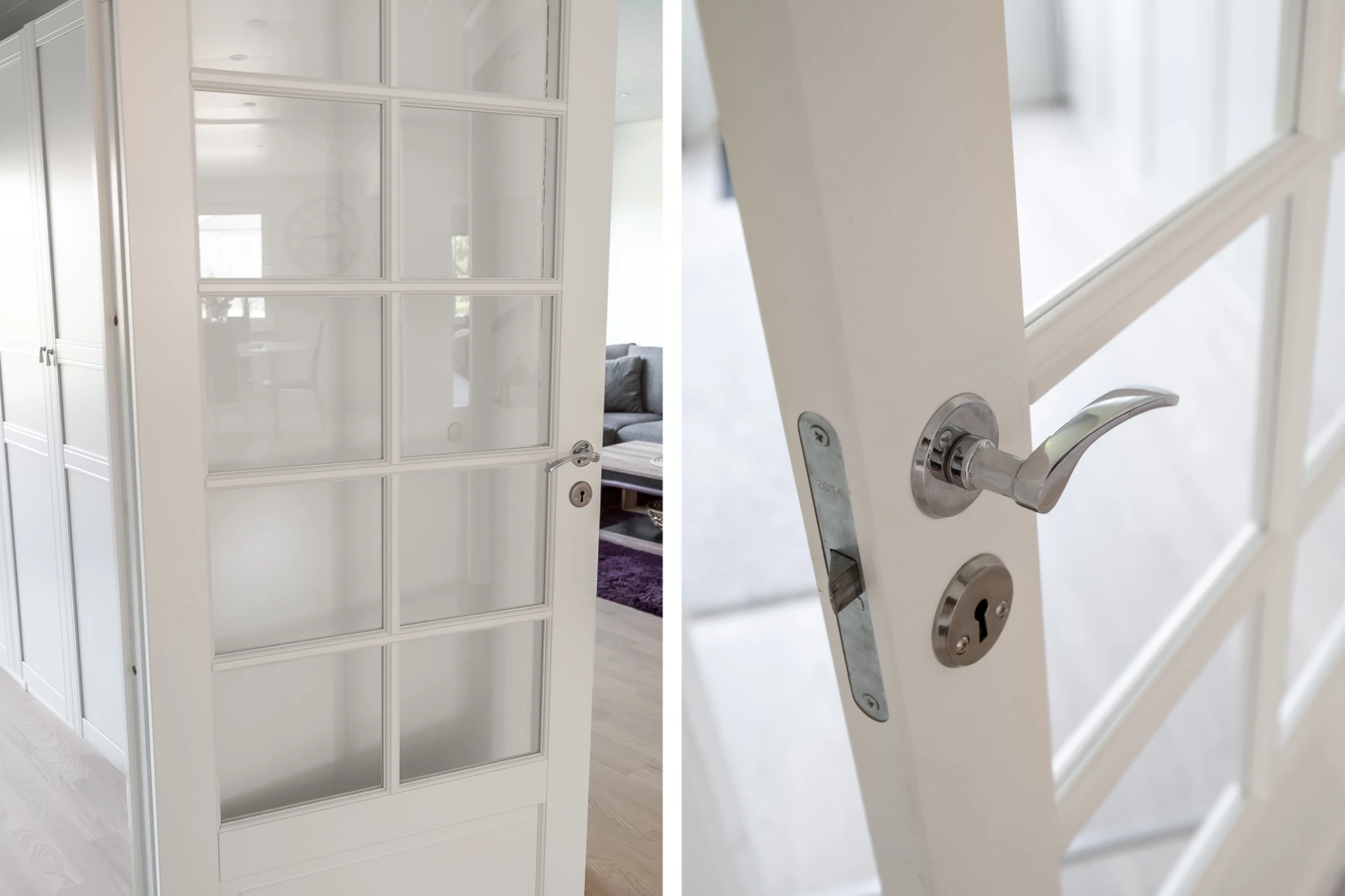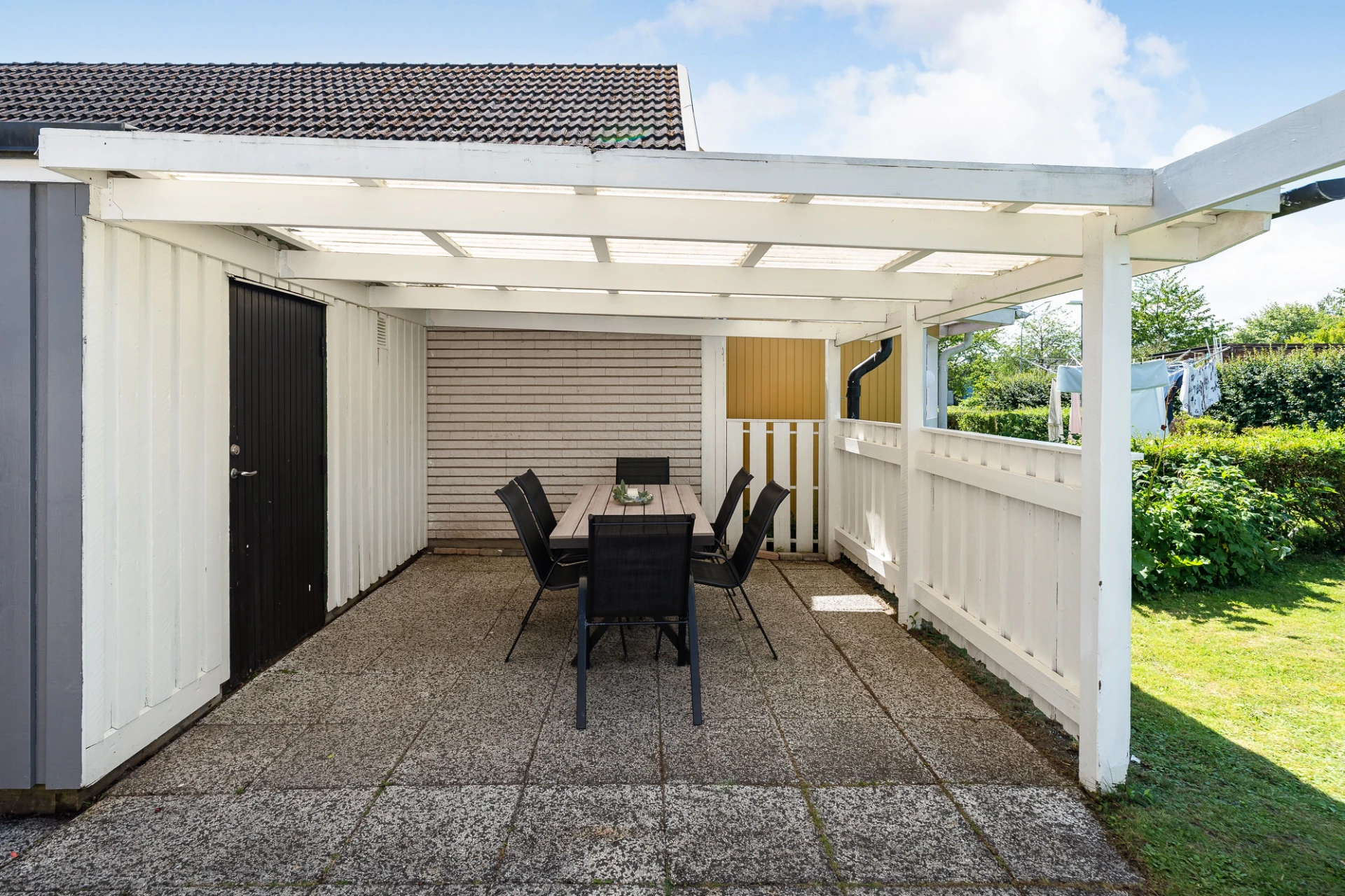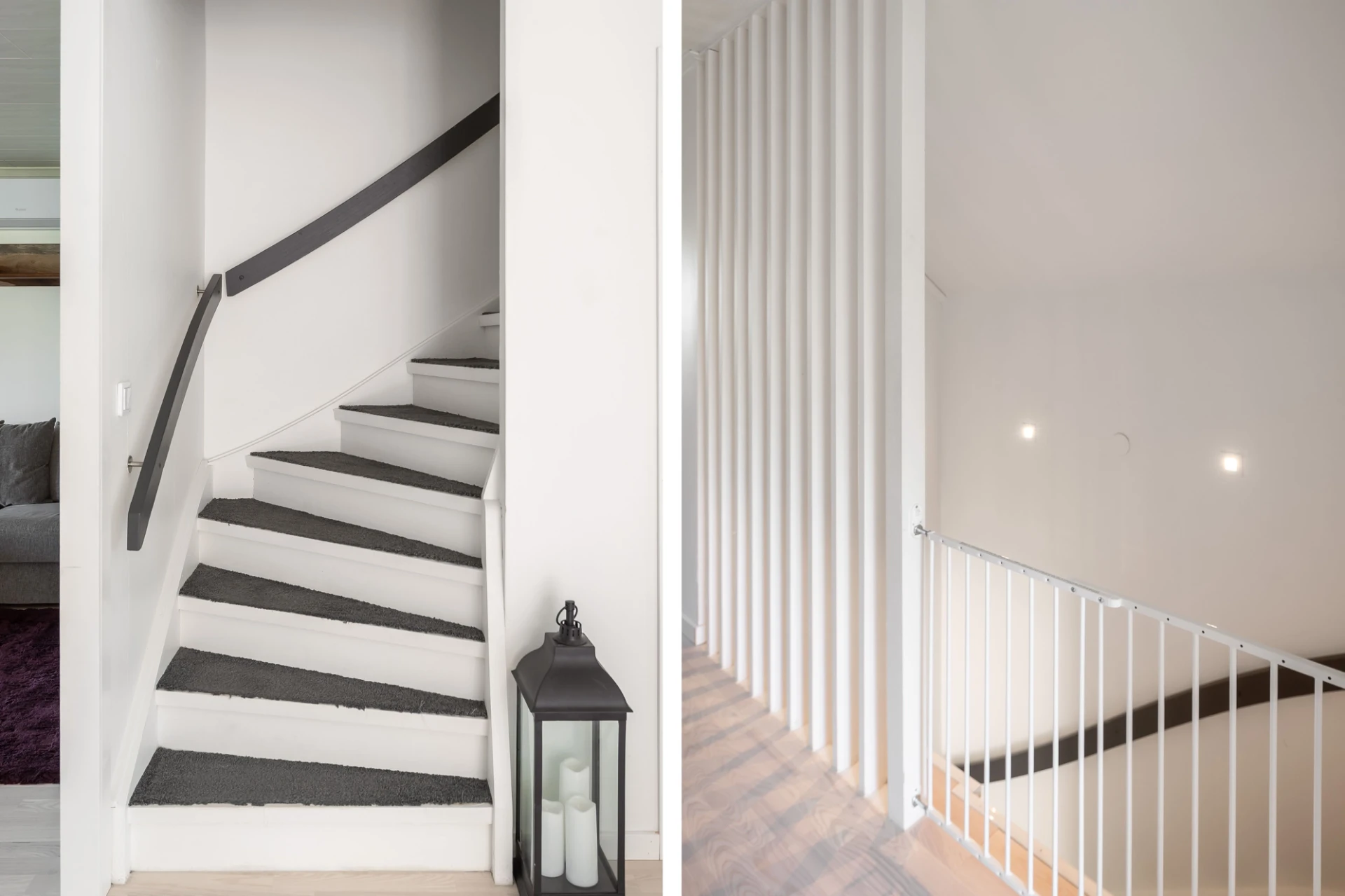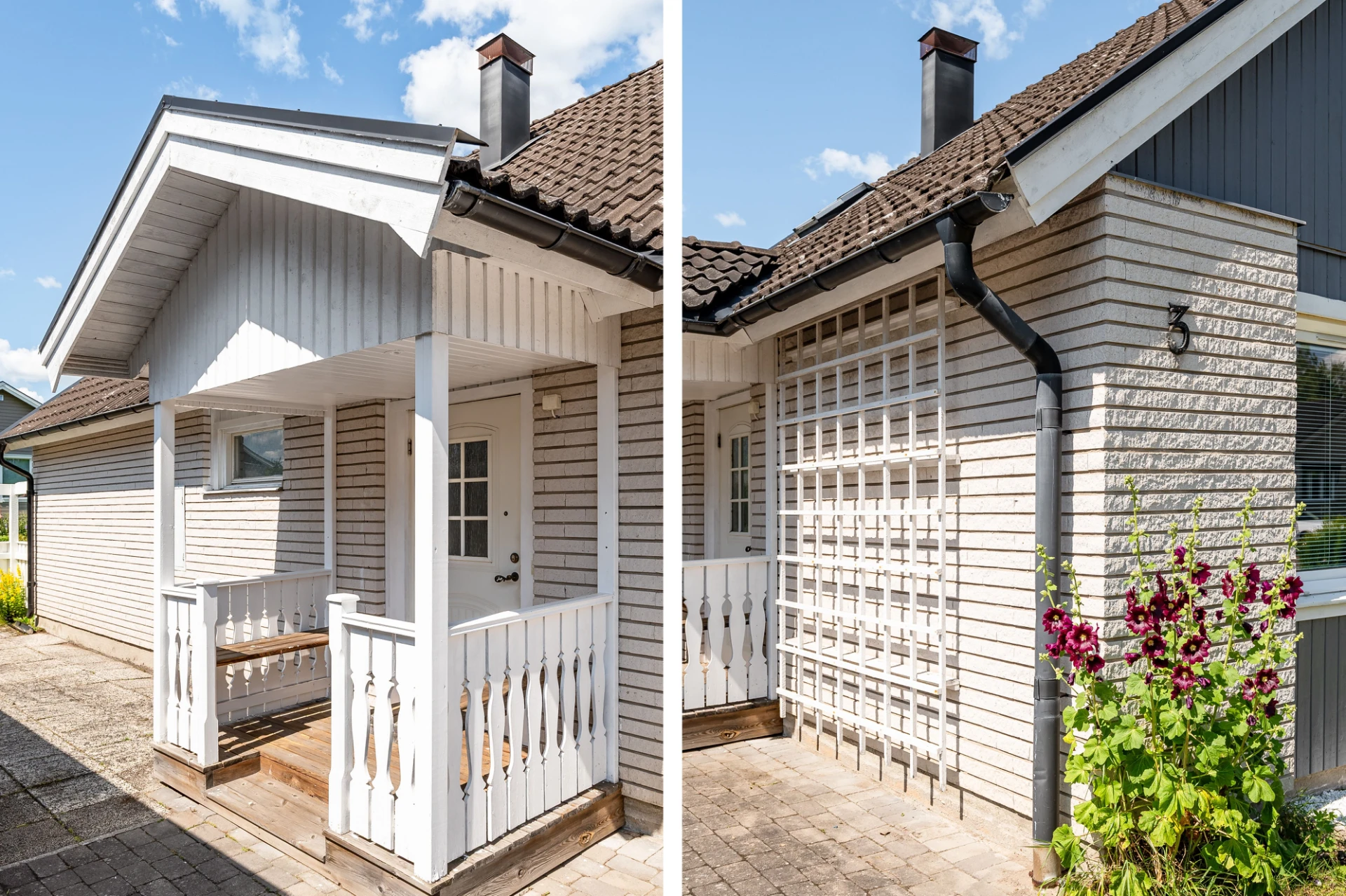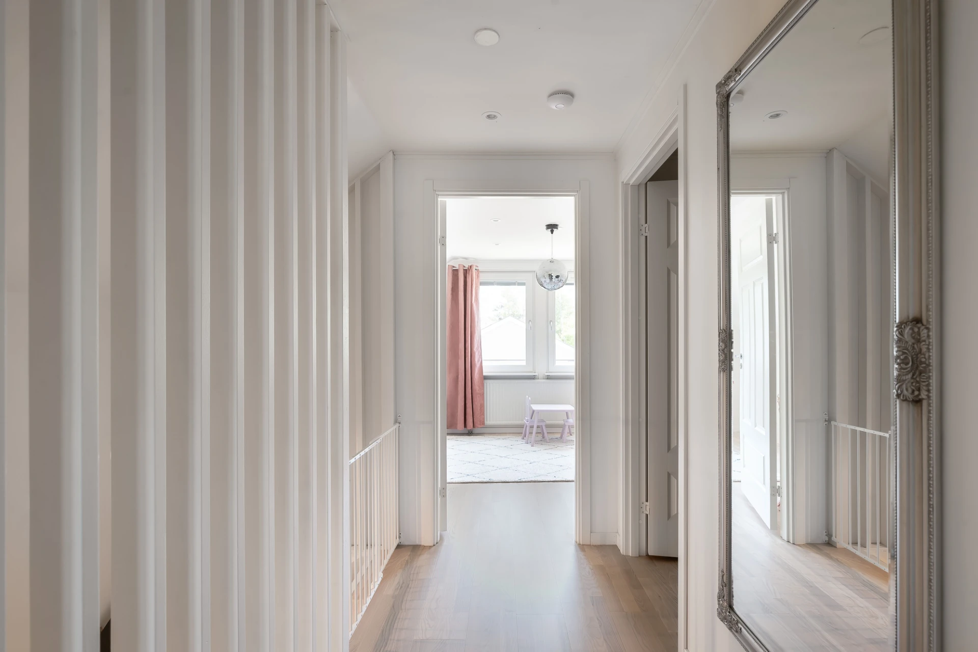 Hallen är ljus och rymlig med plats för avhängning. Målade väggar och klinkergolv.