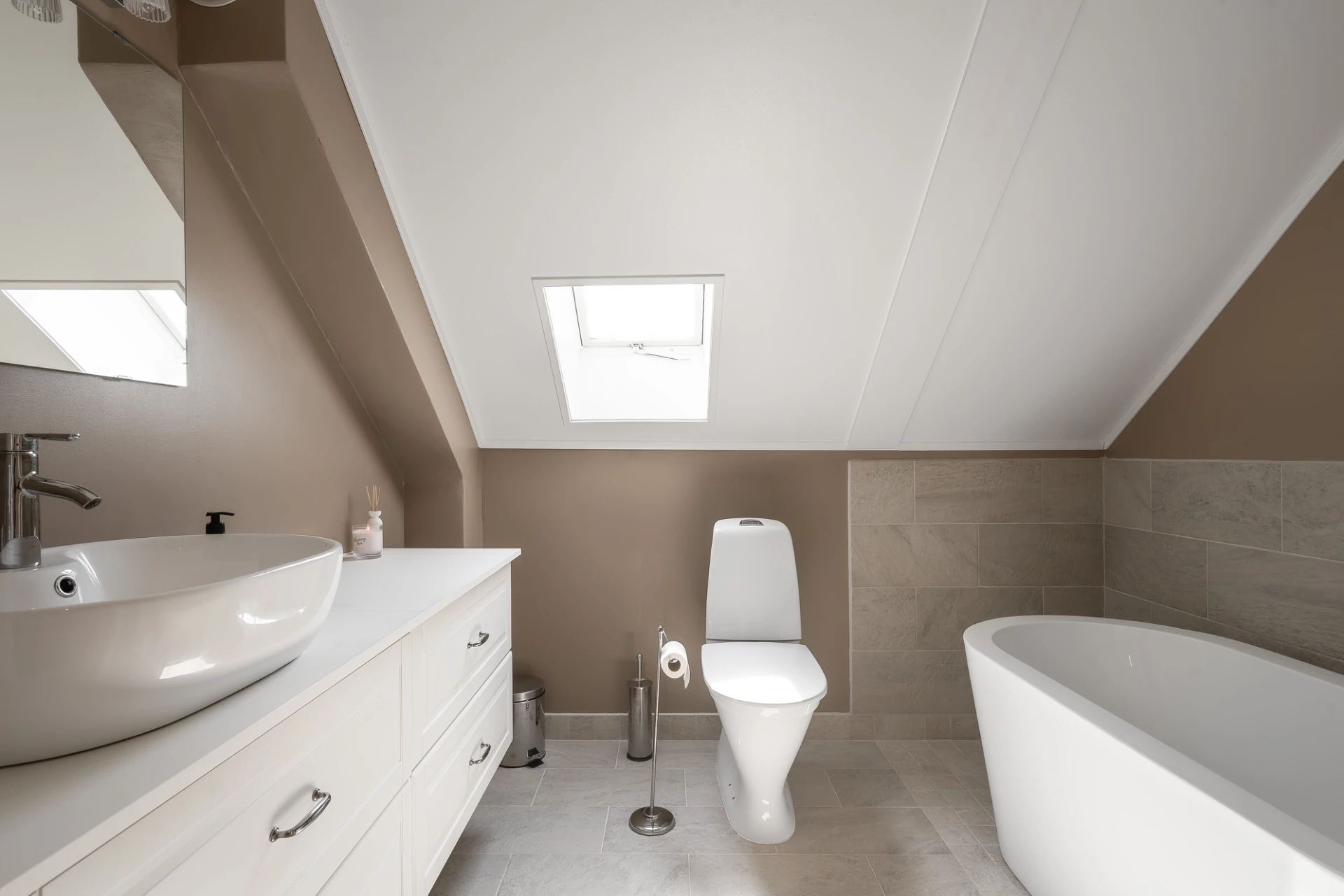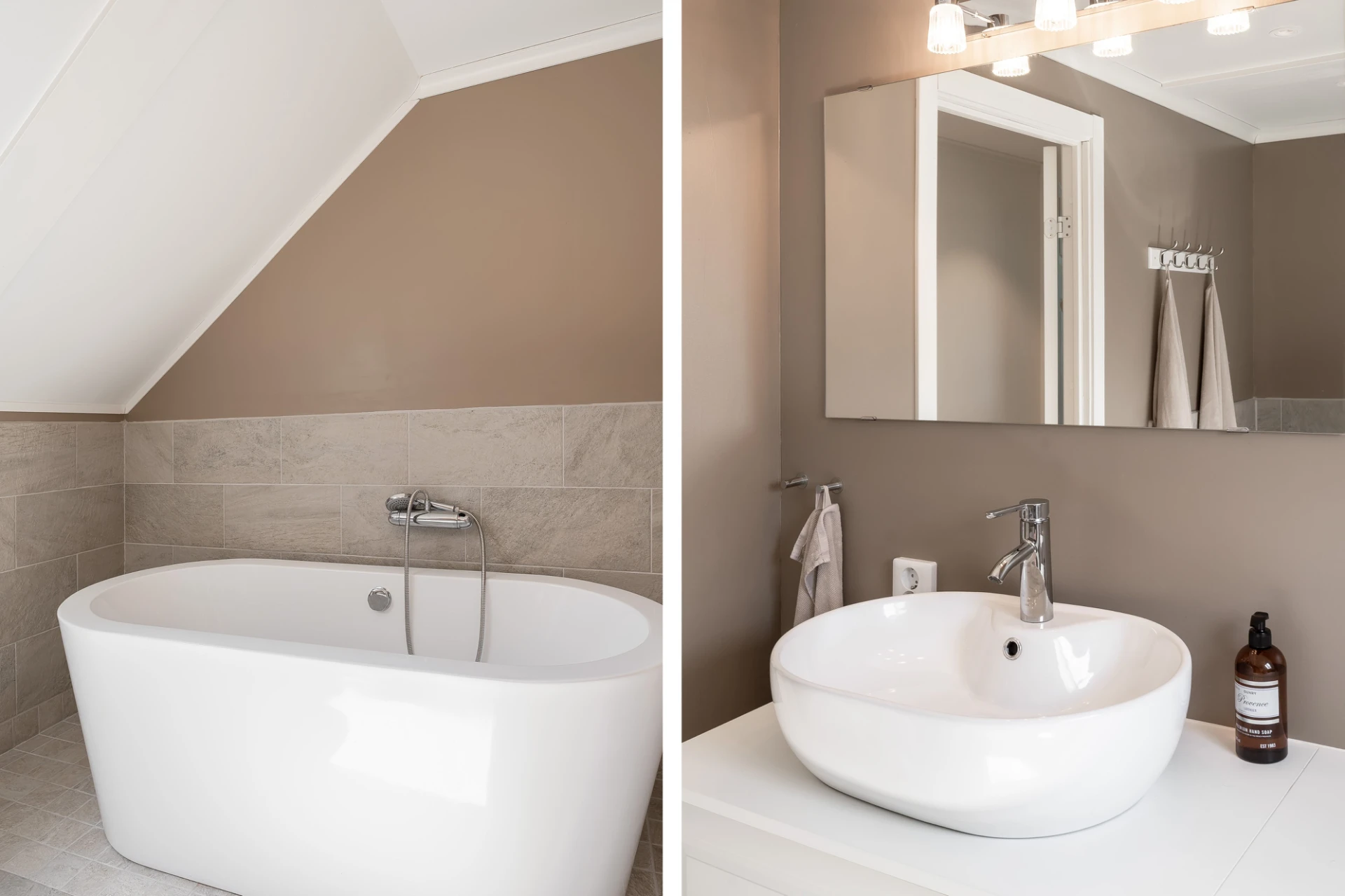Stilfullt badrum i naturnära toner med delvis kaklade väggar och klinkergolv. Här finns handfat med kommod, spegel och wc. Badrummets stora höjdpunkt är det inbjudande badkaret – perfekt för avkopplande stunder i vardagen.