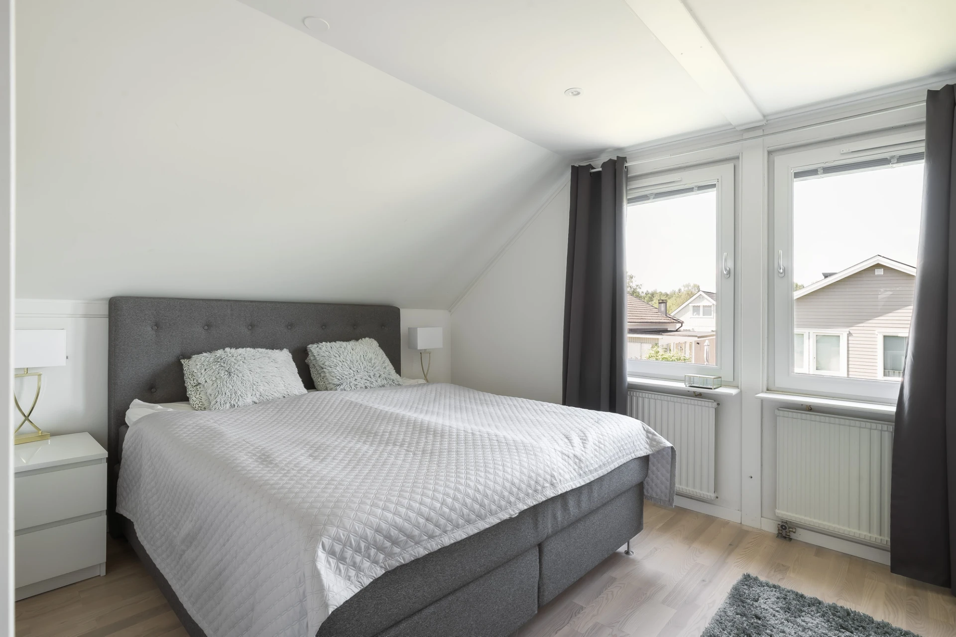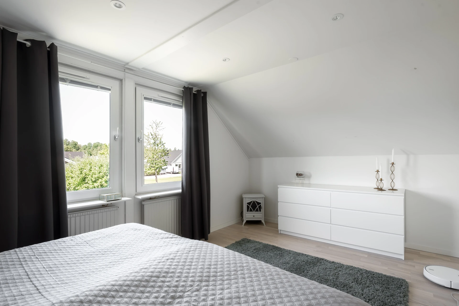 Ett mysigt sovrum med utrymme för en dubbelsäng och skrivbord. Målade väggar och parkettgolv.