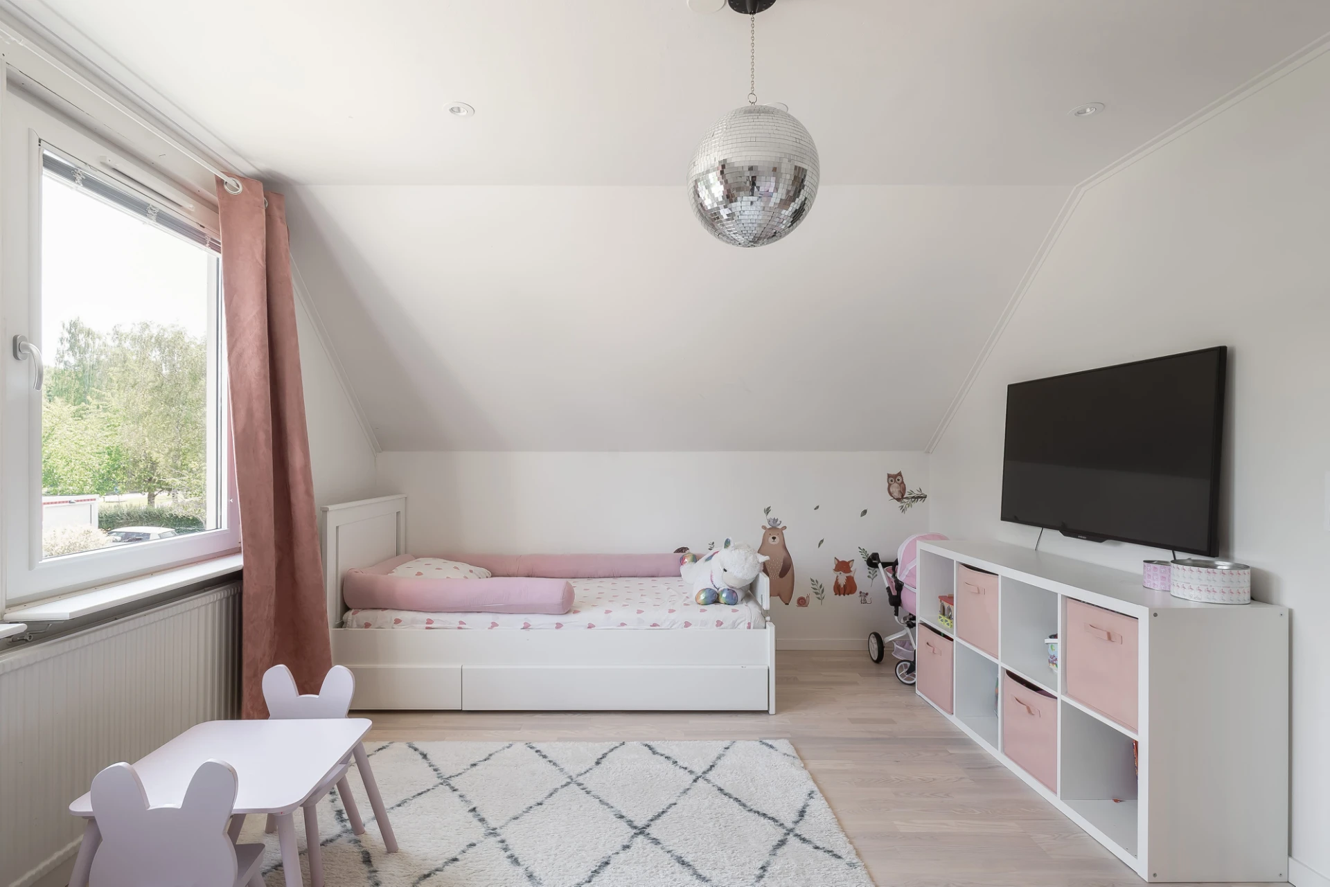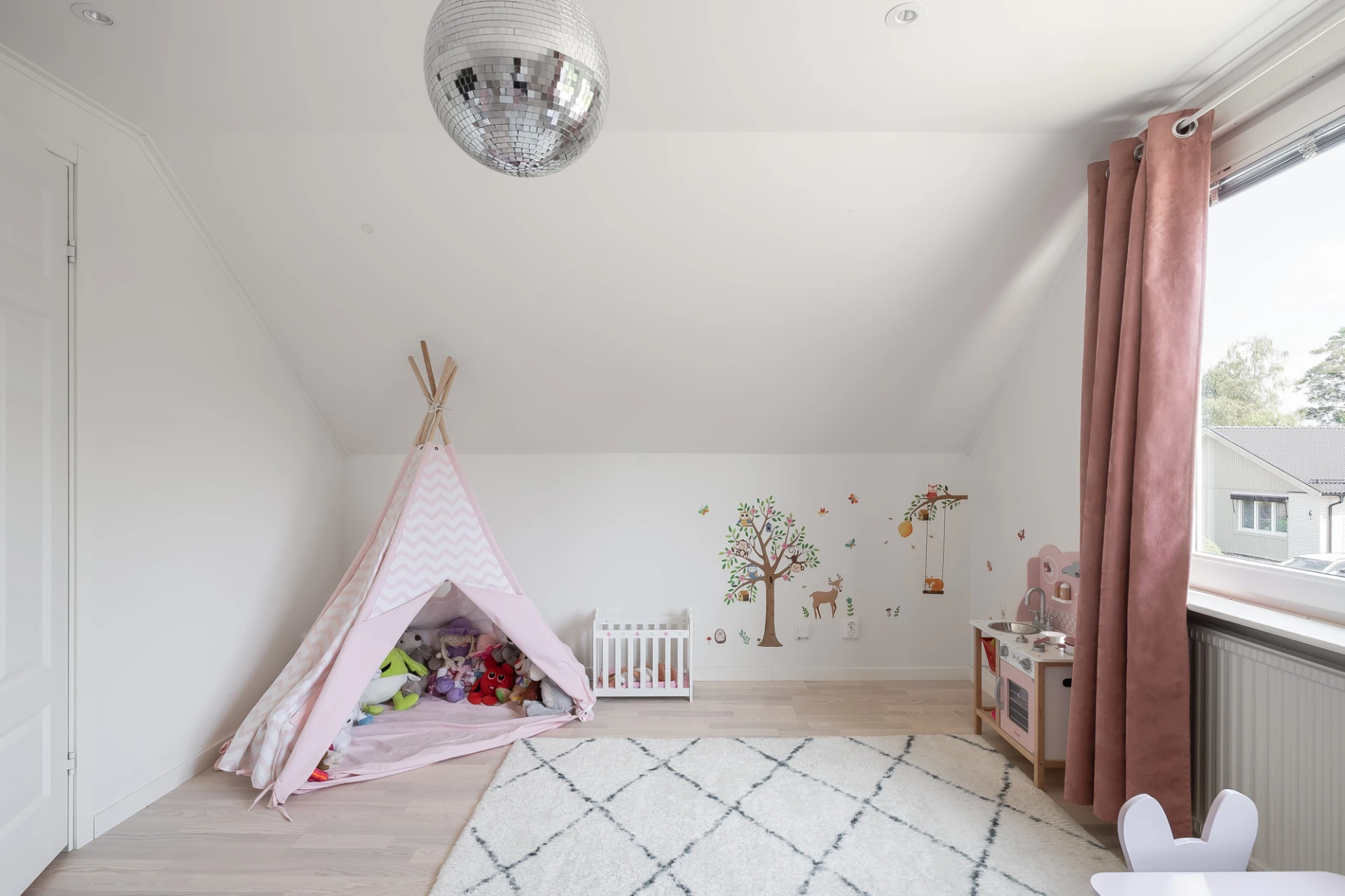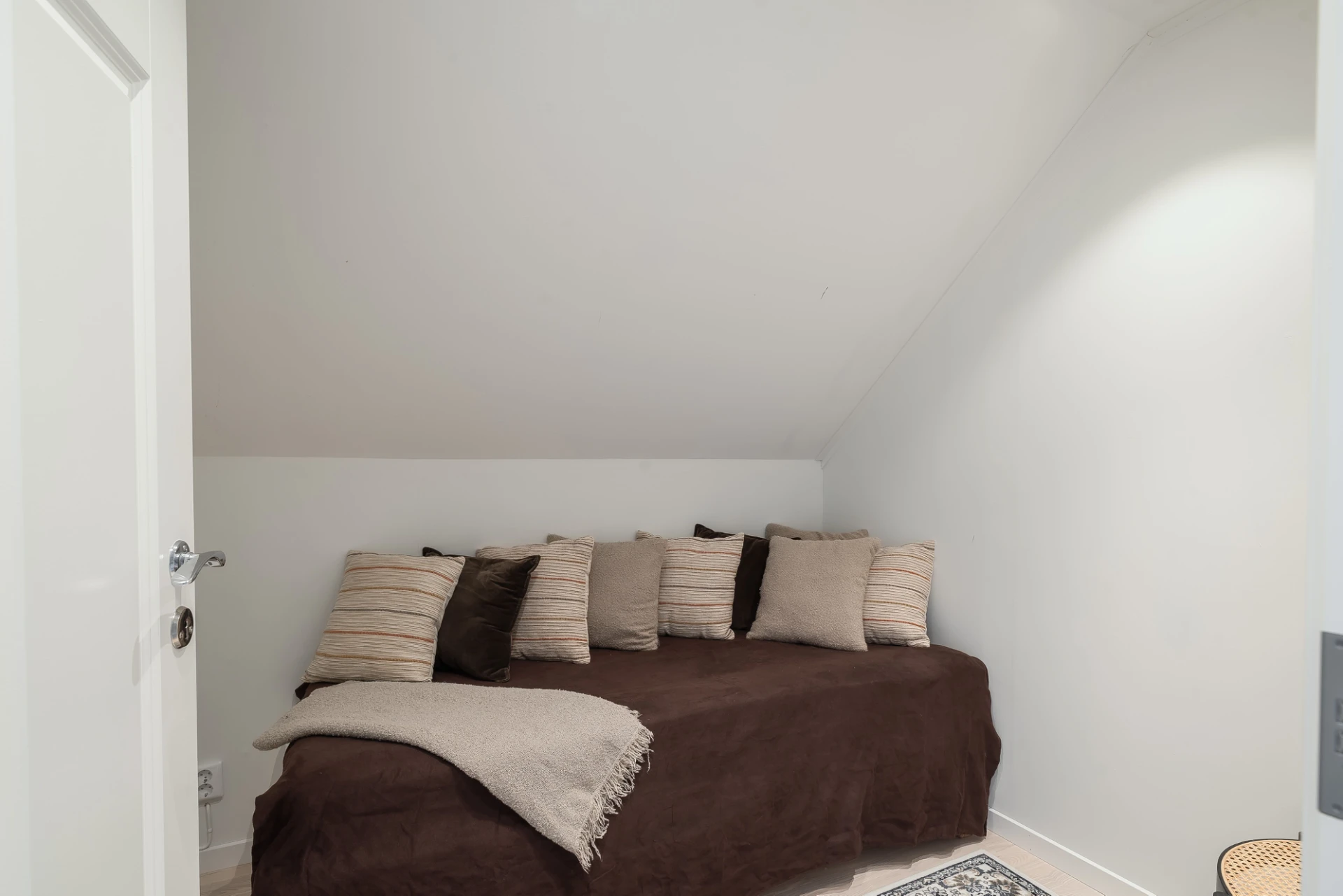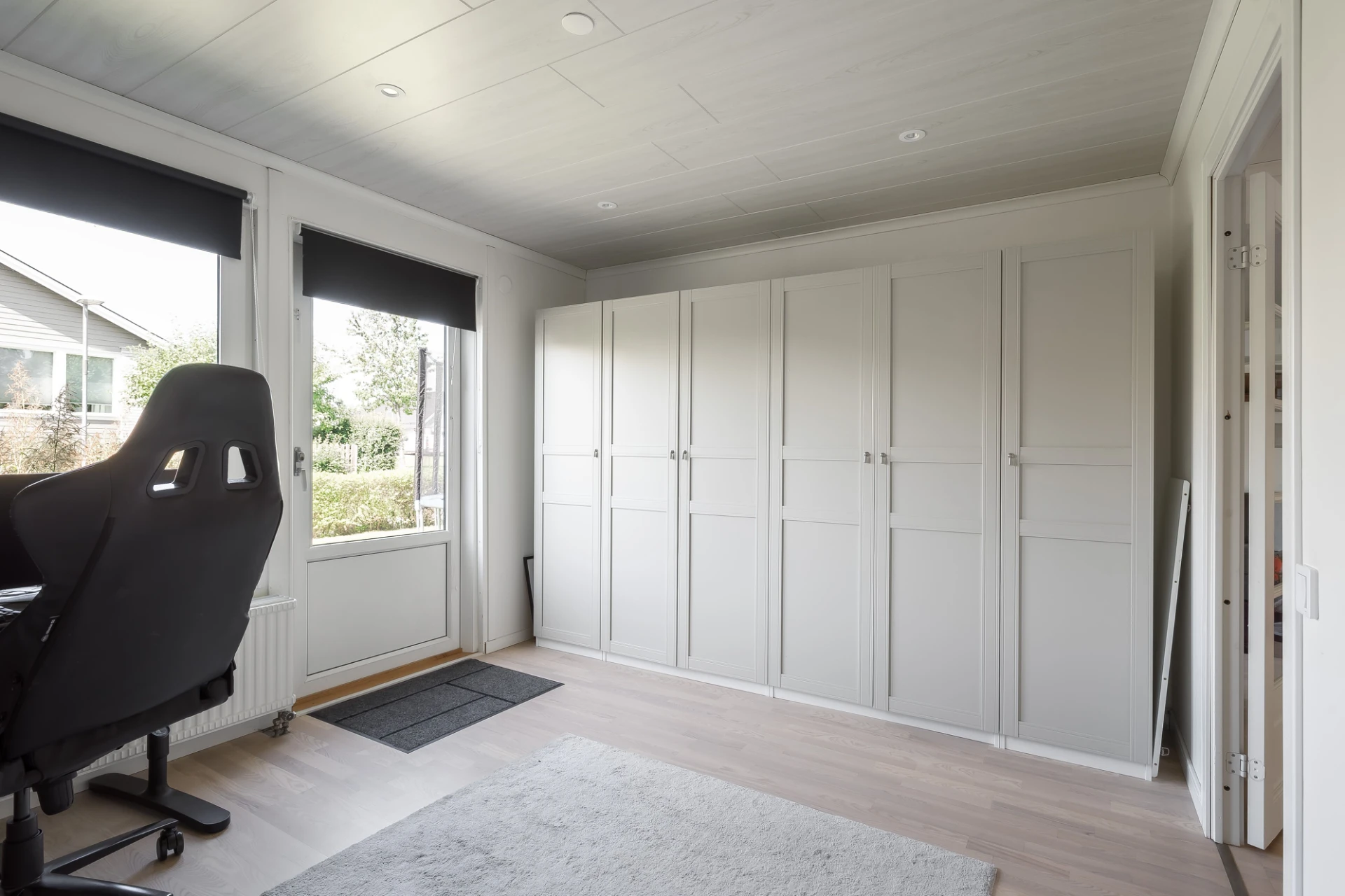 Ett mångsidigt sovrum med utrymme för en enkelsäng och en praktisk arbetshörna. Perfekt som barnrum eller hemmakontor. Målade väggar och parkettgolv.