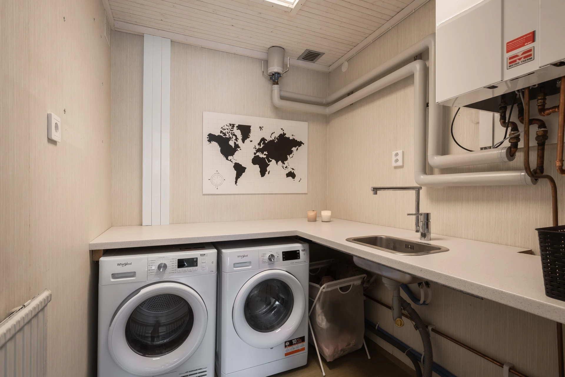 Tvättho, arbetsbänk samt tvättmaskin och torktumlare. Tapetserade väggar och våtrumsmatta på golv.