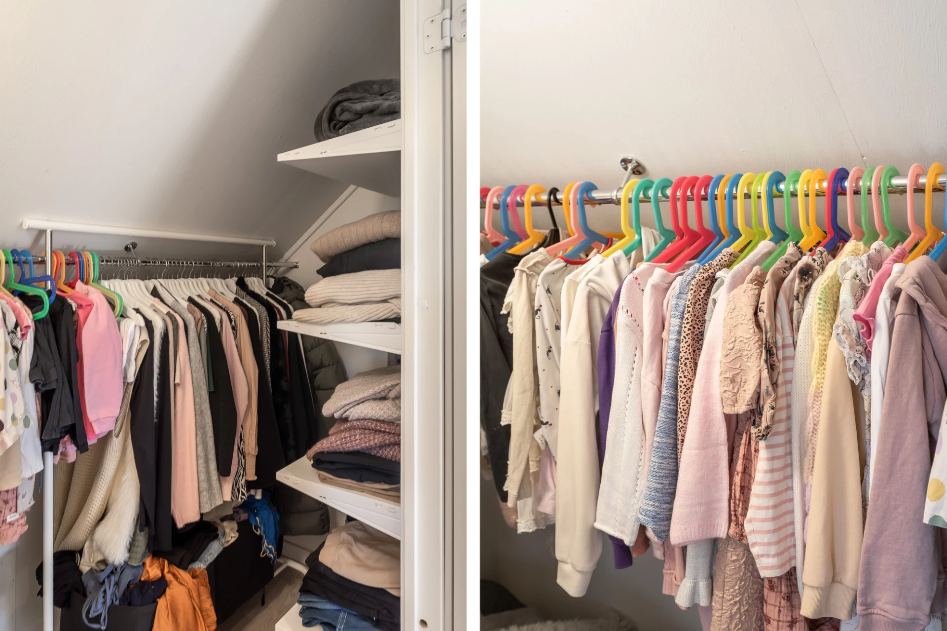Praktiskt rum för förvaring eller walk-in-closet. Målade väggar och parkettgolv.
