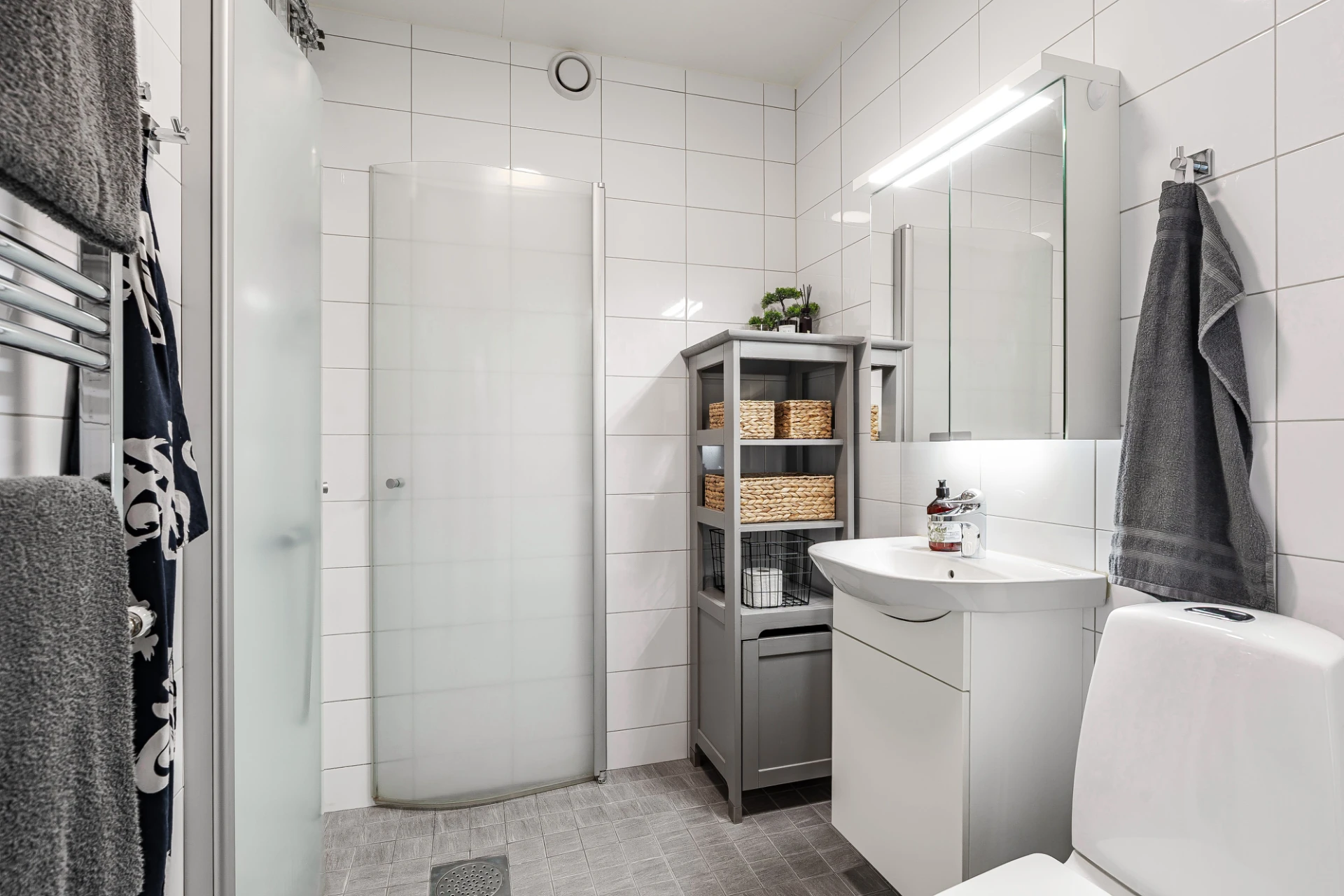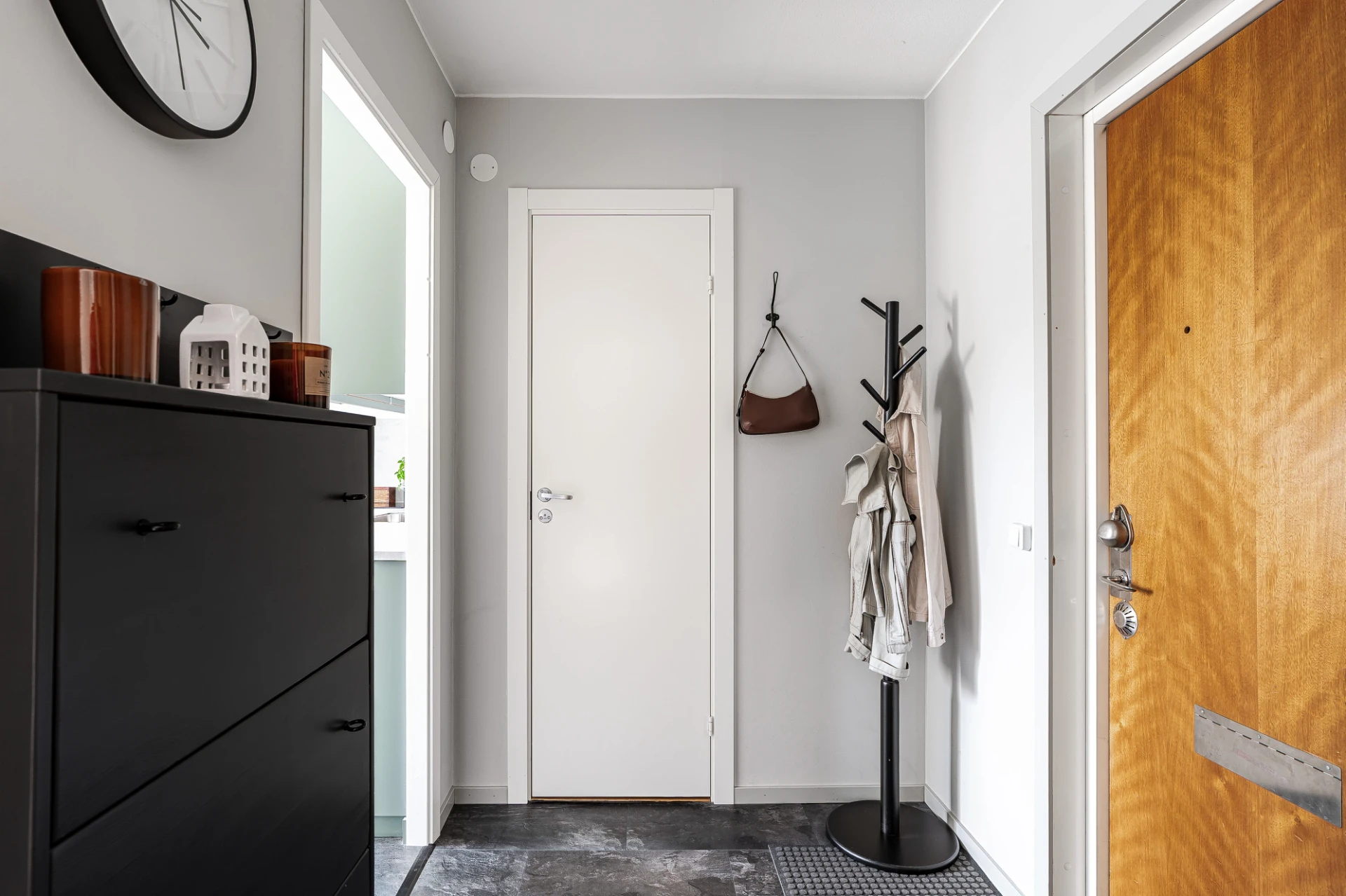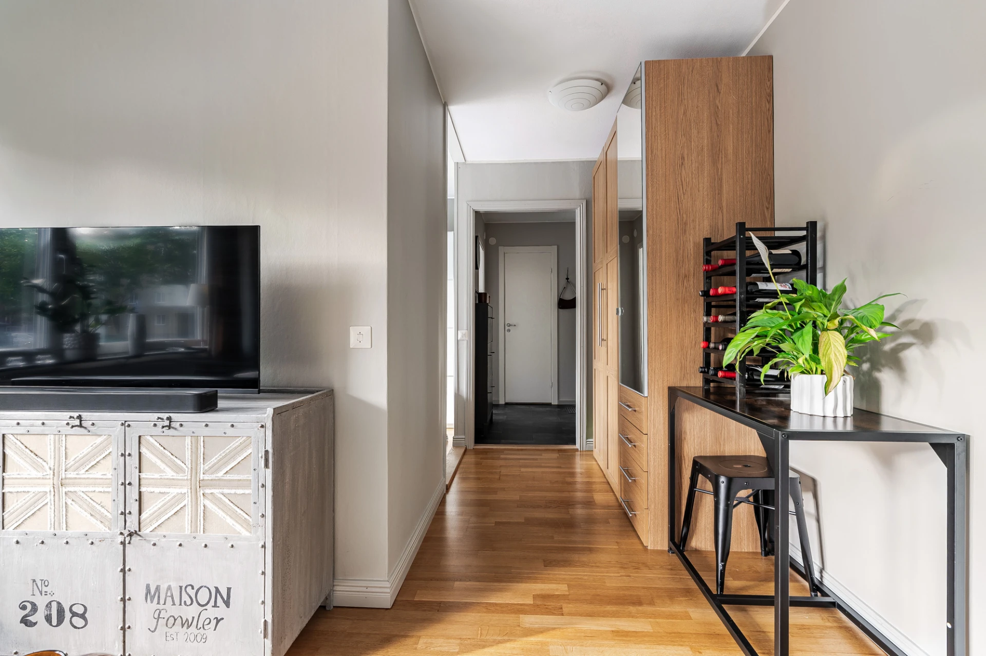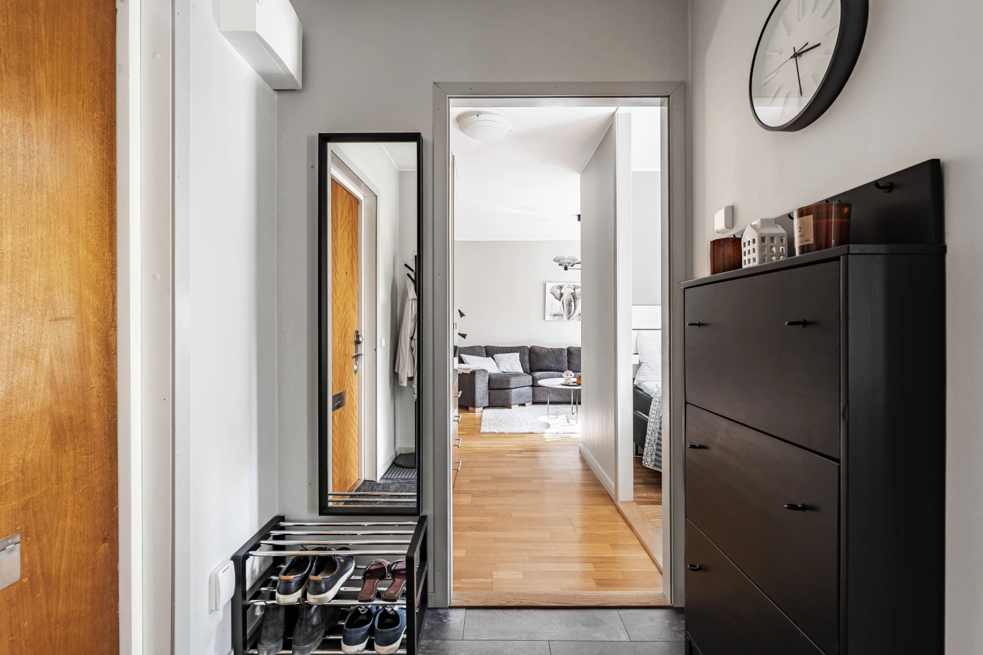 När du kliver in möts du av en välkomnande hall med praktiskt linoleummatta. Köket är stilrent och modernt med gott om arbetsyta, bra förvaring och plats för matbord. Vardagsrummet har ett fint ljusinsläpp, parkettgolv och ytterligare förvaring i garderob. Sovrummet erbjuder bra förvaringsmöjligheter i en garderobsvägg med skjutdörrar. Badrummet är helkaklat och modernt med tidlös känsla.