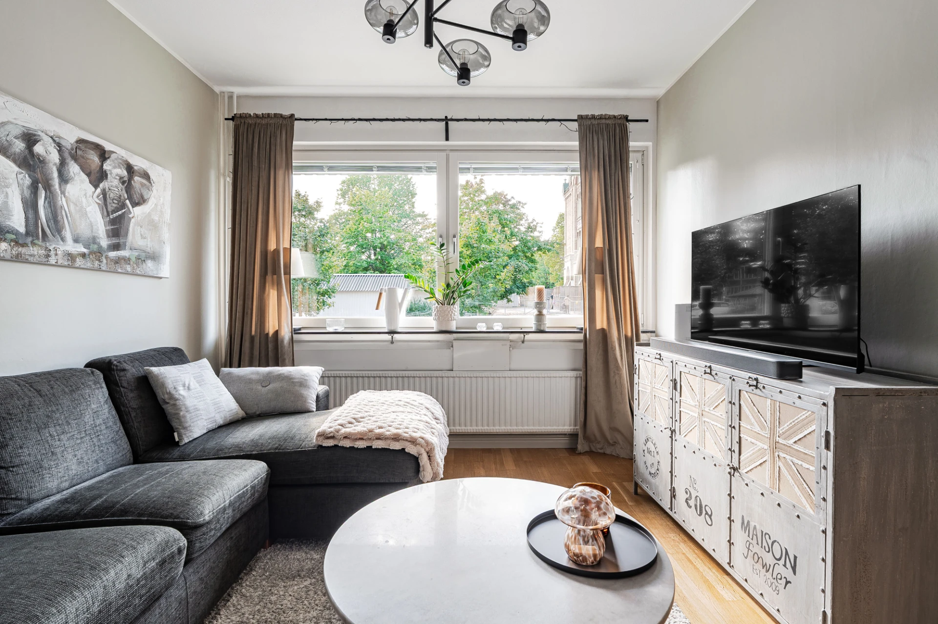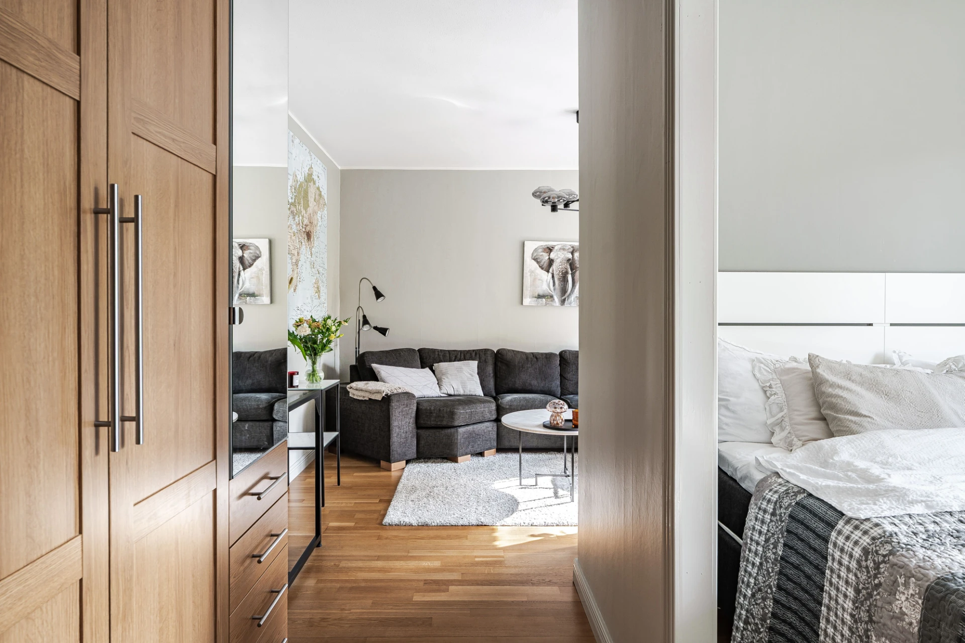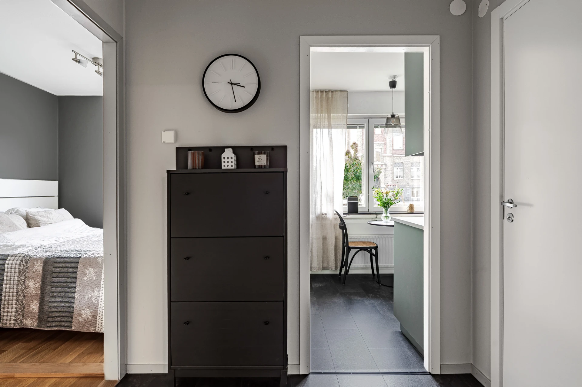 När du kliver in möts du av en välkomnande hall med praktiskt linoleummatta. Köket är stilrent och modernt med gott om arbetsyta, bra förvaring och plats för matbord. Vardagsrummet har ett fint ljusinsläpp, parkettgolv och ytterligare förvaring i garderob. Sovrummet erbjuder bra förvaringsmöjligheter i en garderobsvägg med skjutdörrar. Badrummet är helkaklat och modernt med tidlös känsla.