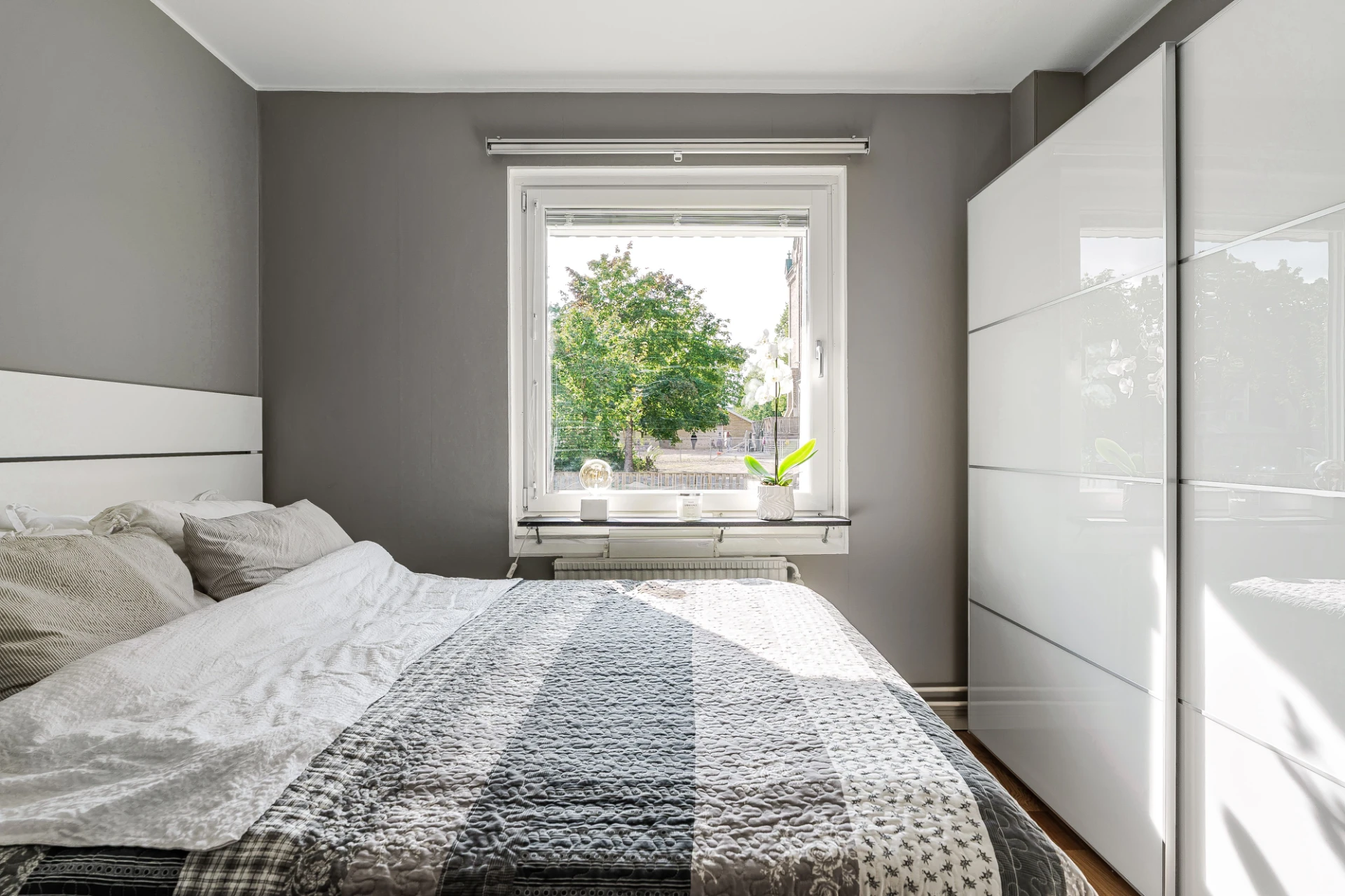 Parkettgolv och grå väggar. Här finns plats för säng med tillhörande möblemang. Förvaring i garderob med skjutdörrar.