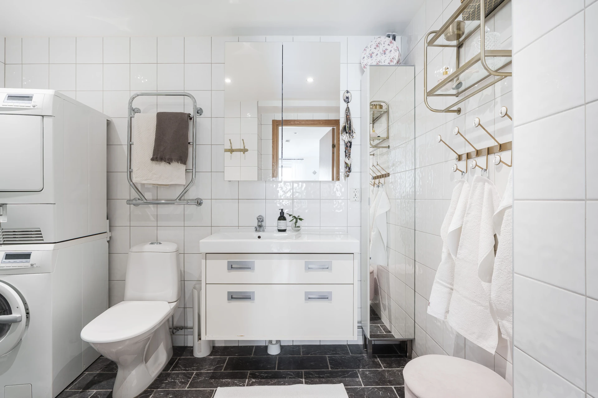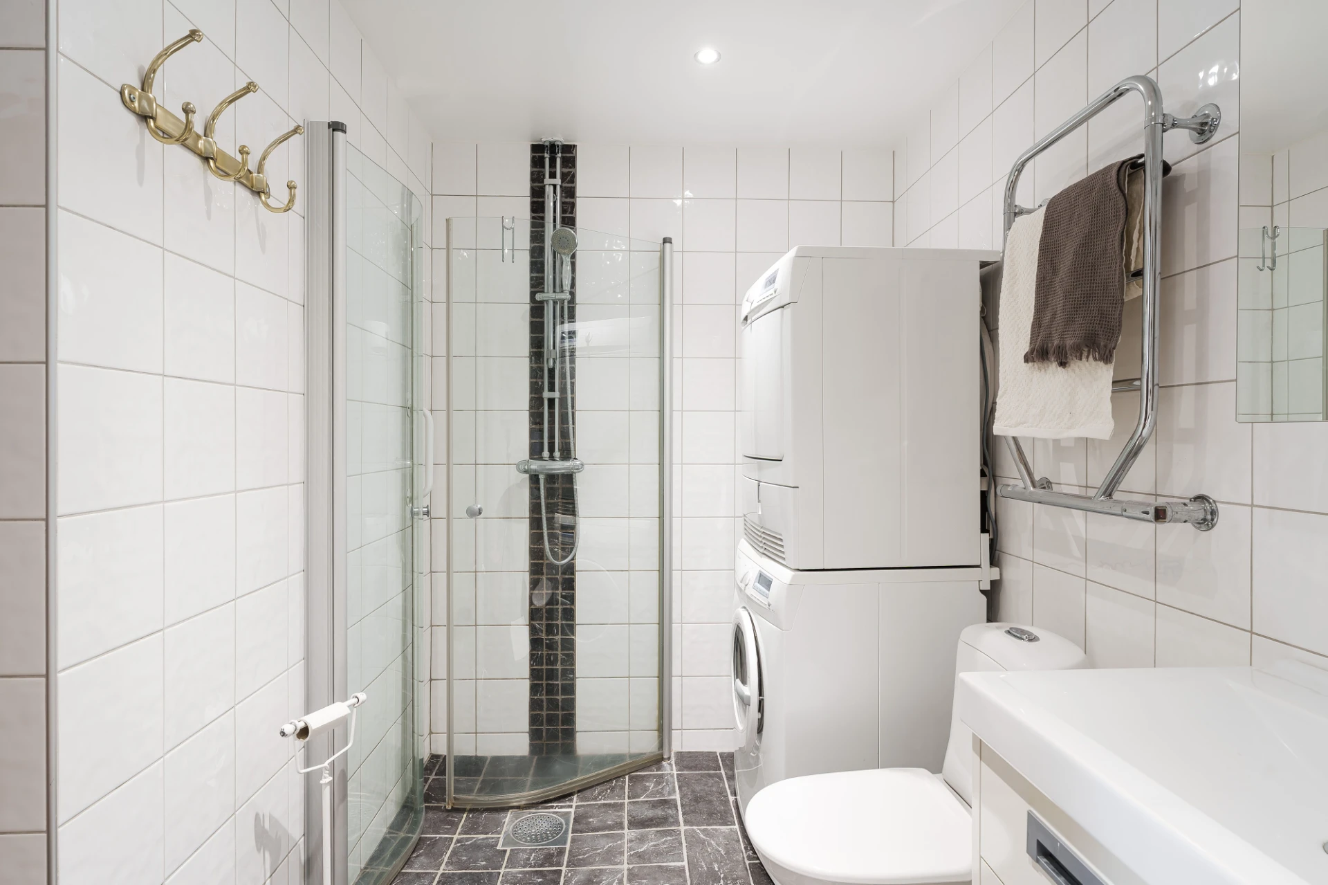 Klinkergolv med golvvärme och helkaklade väggar. Duschrummet är utrustad med wc, handdukstork, handfat med kommod, vägghängd spegelskåp, tvättmaskin, torktumlare samt dusch.