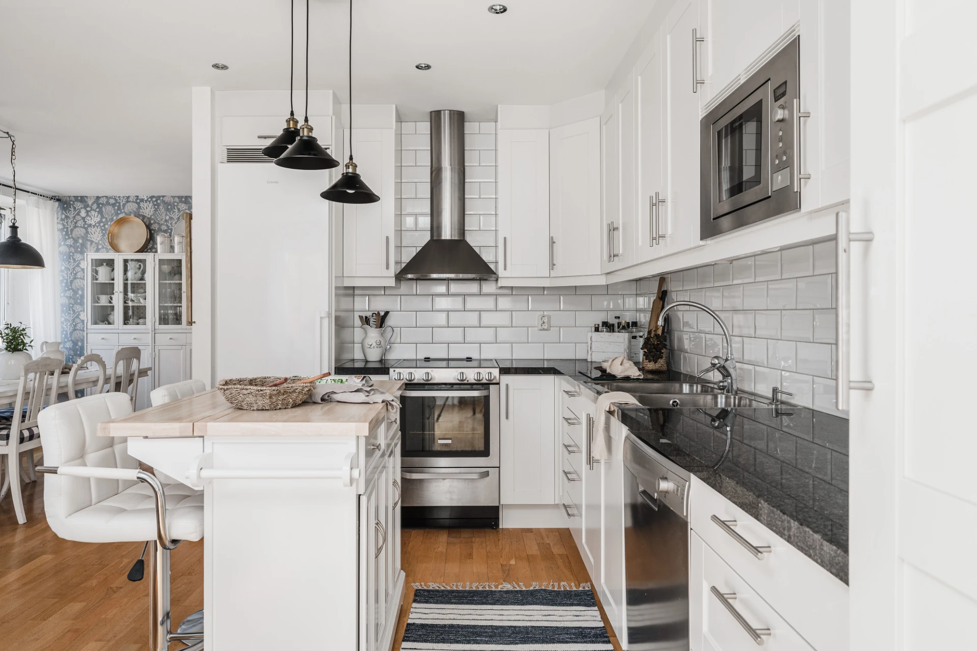 Parkettgolv och ljusa väggar. Köket är utrustat med spis med ugn, fläkt, diskmaskin, inbyggd mikro samt kyl och frys. Köksö med sittplats.