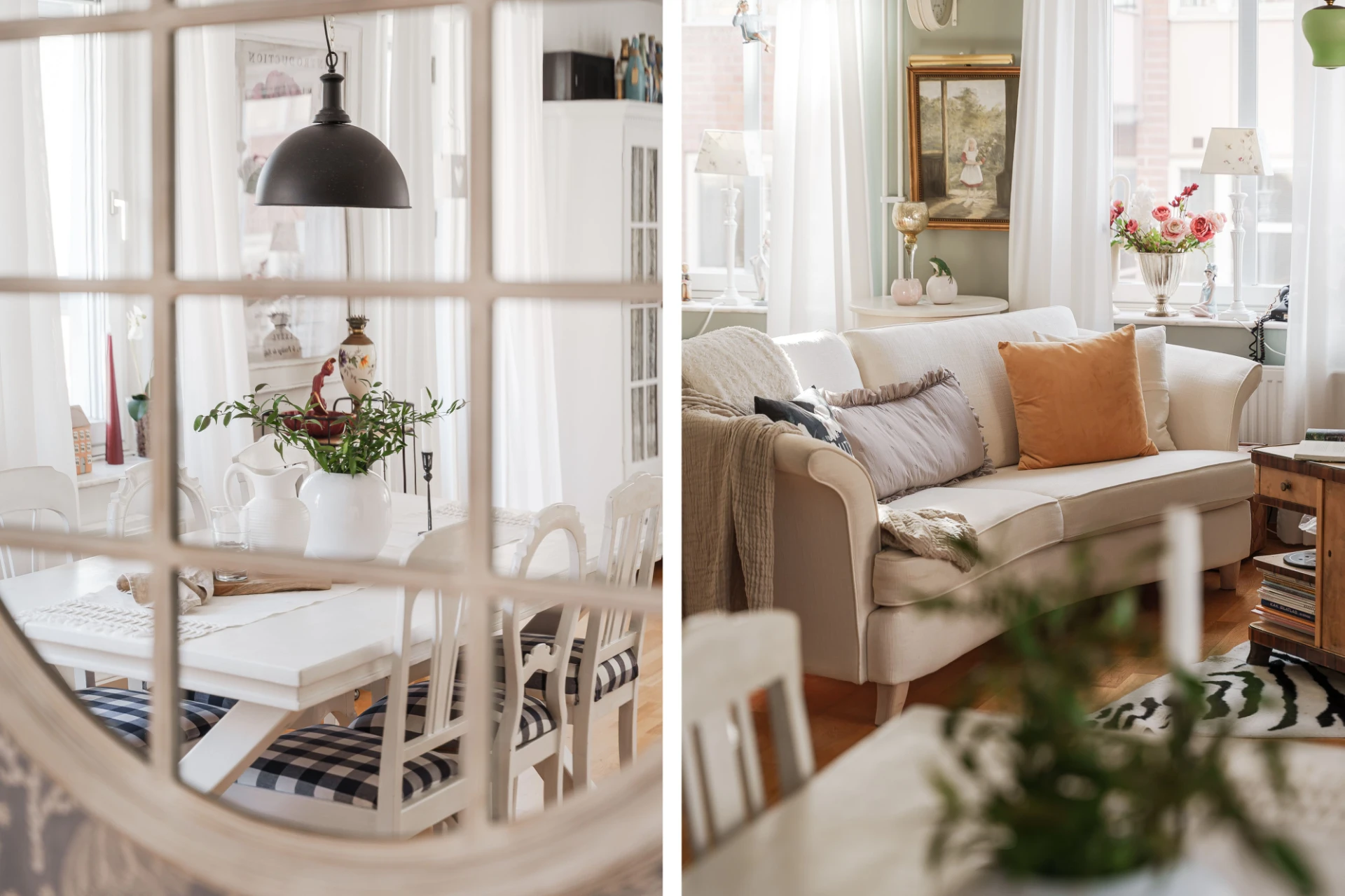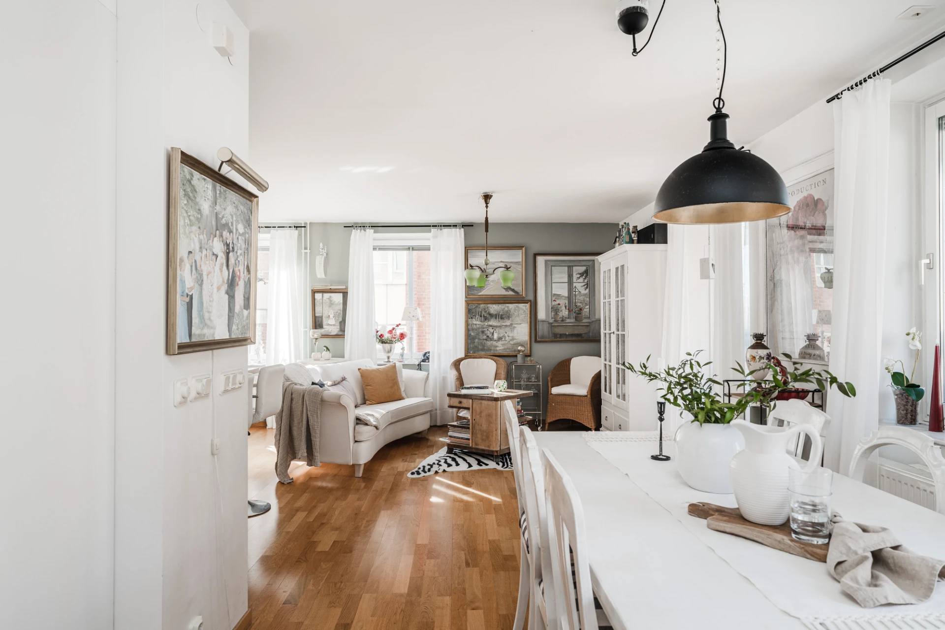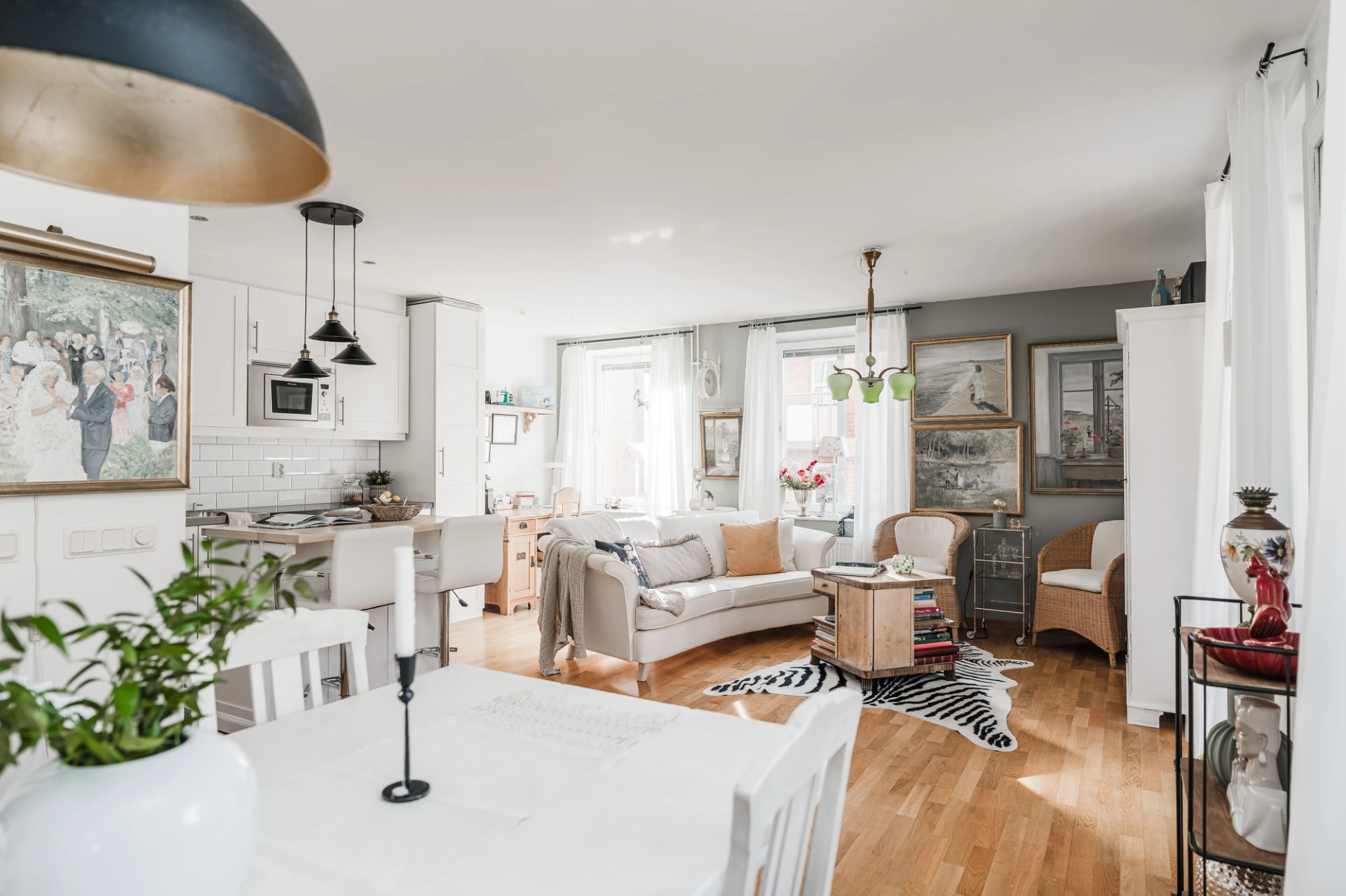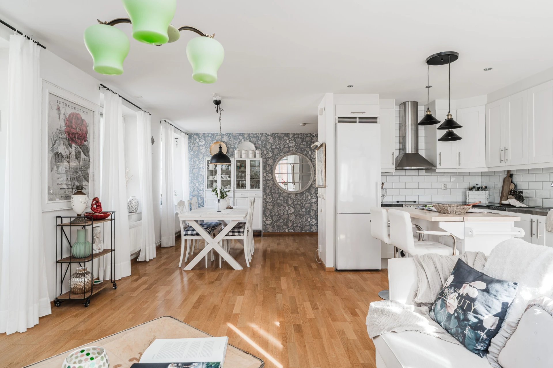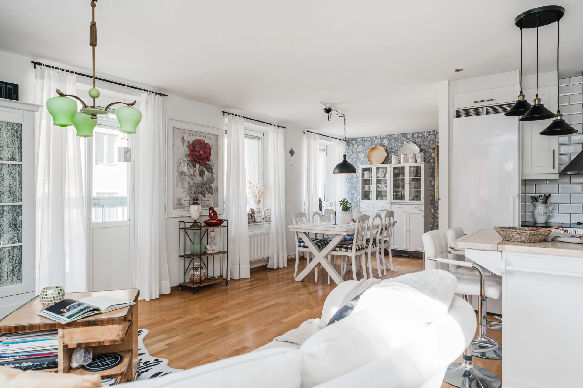 Öppen planlösning mot kök. Parkettgolv och ljusa väggar med mönstrad fondvägg. Plats för matgrupp och soffgrupp. Från vardagsrummet nås bostadens rymliga inglasade balkong.