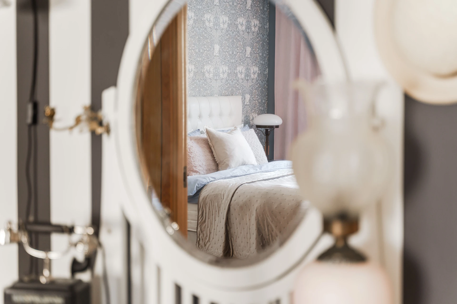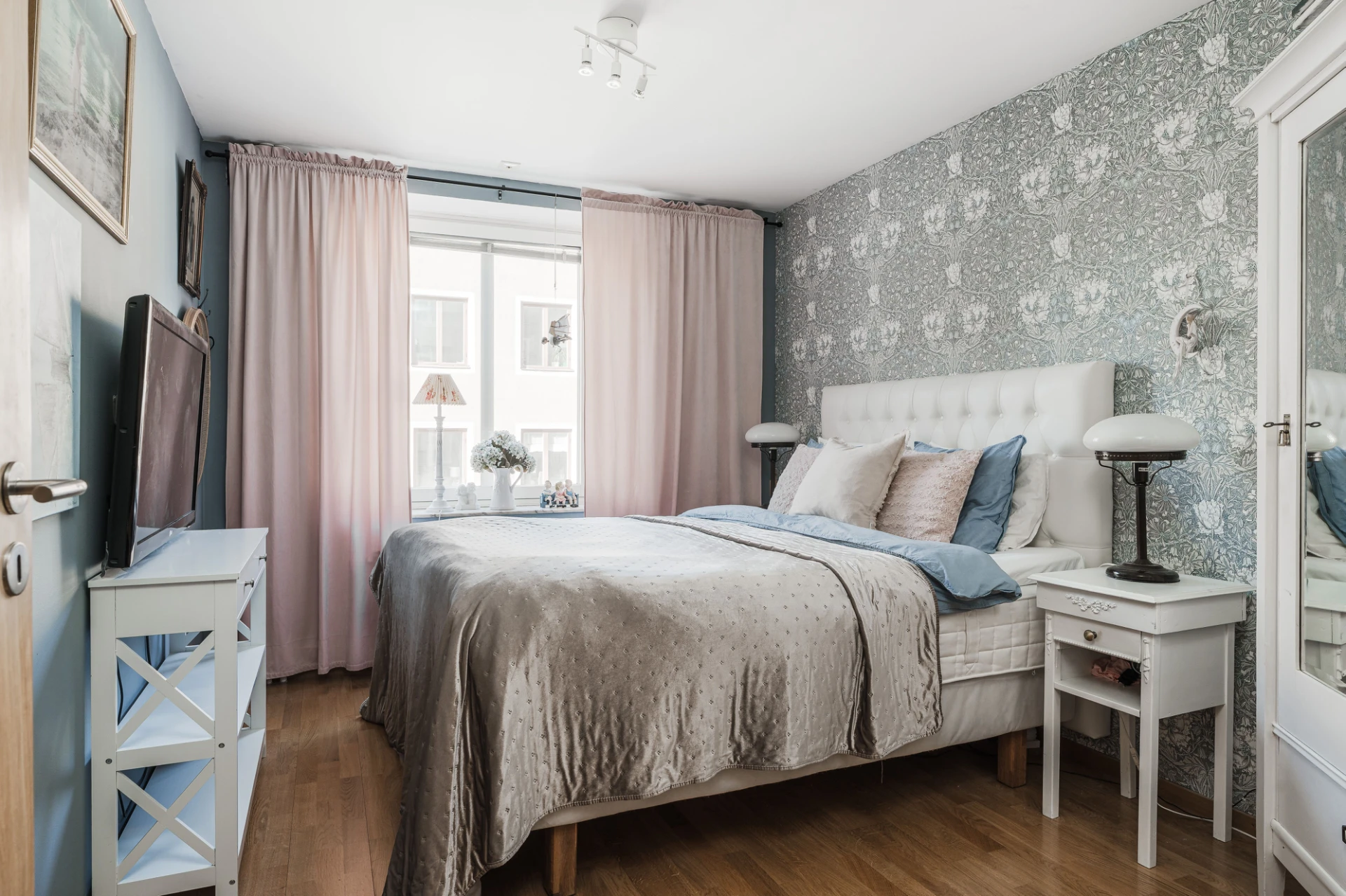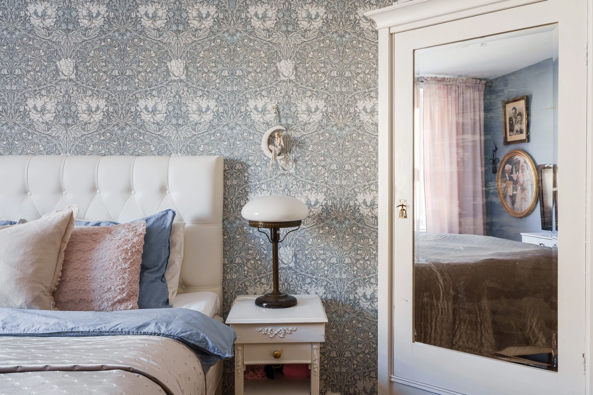 Parkettgolv och blå väggar med mönstrad fondvägg. Här finns plats för säng med tillhörande möblemang. Förvaring i garderob.