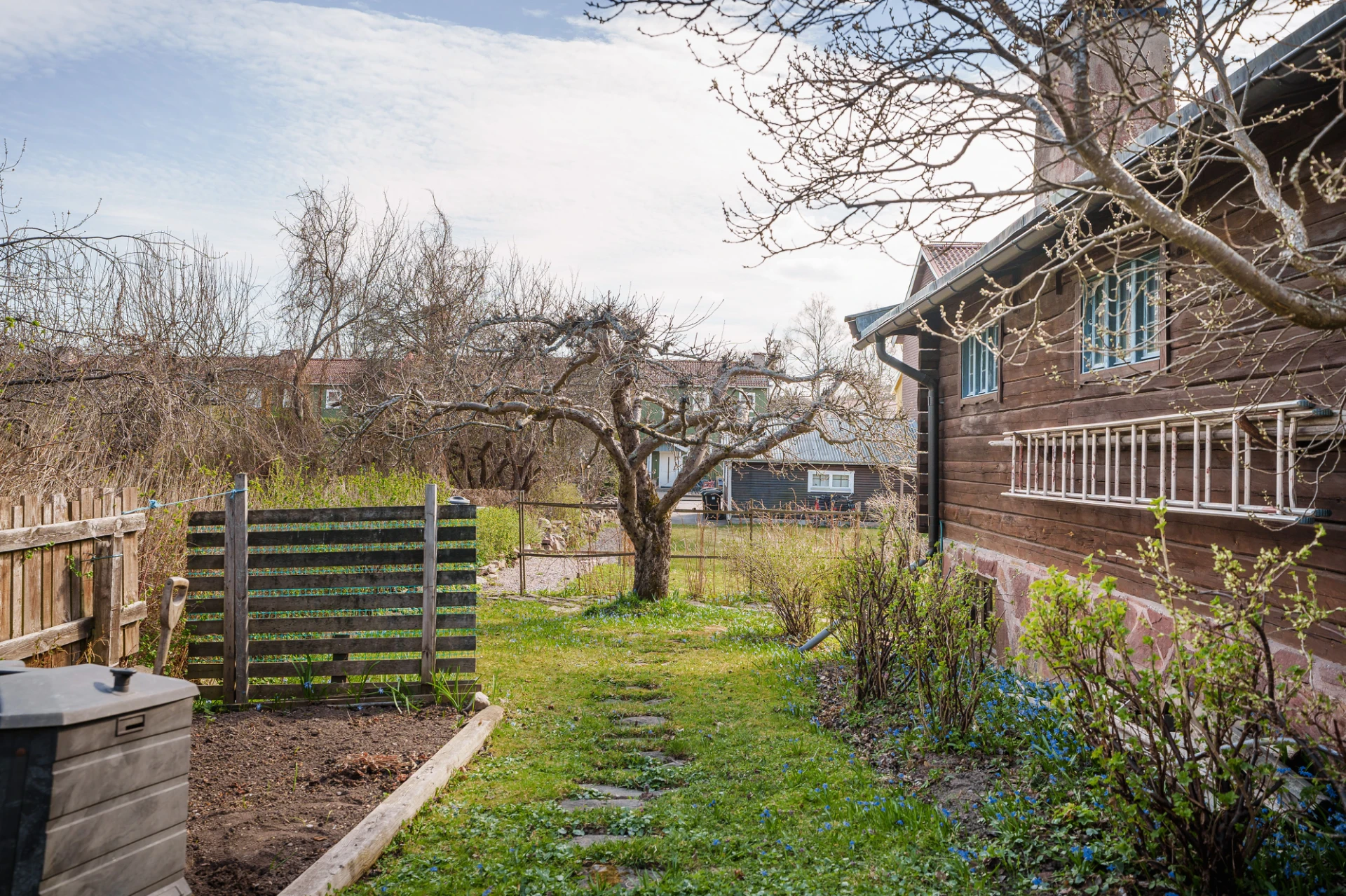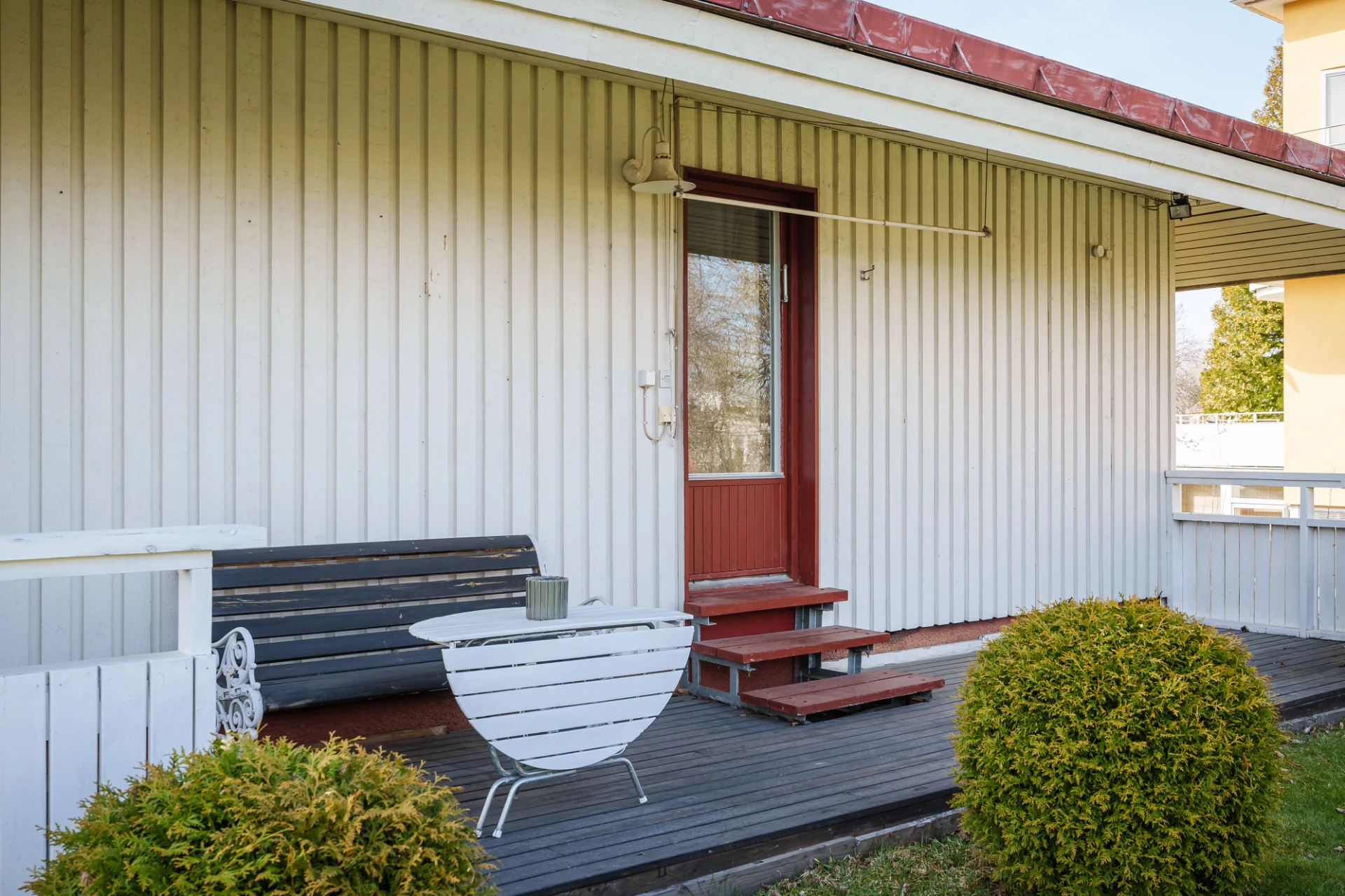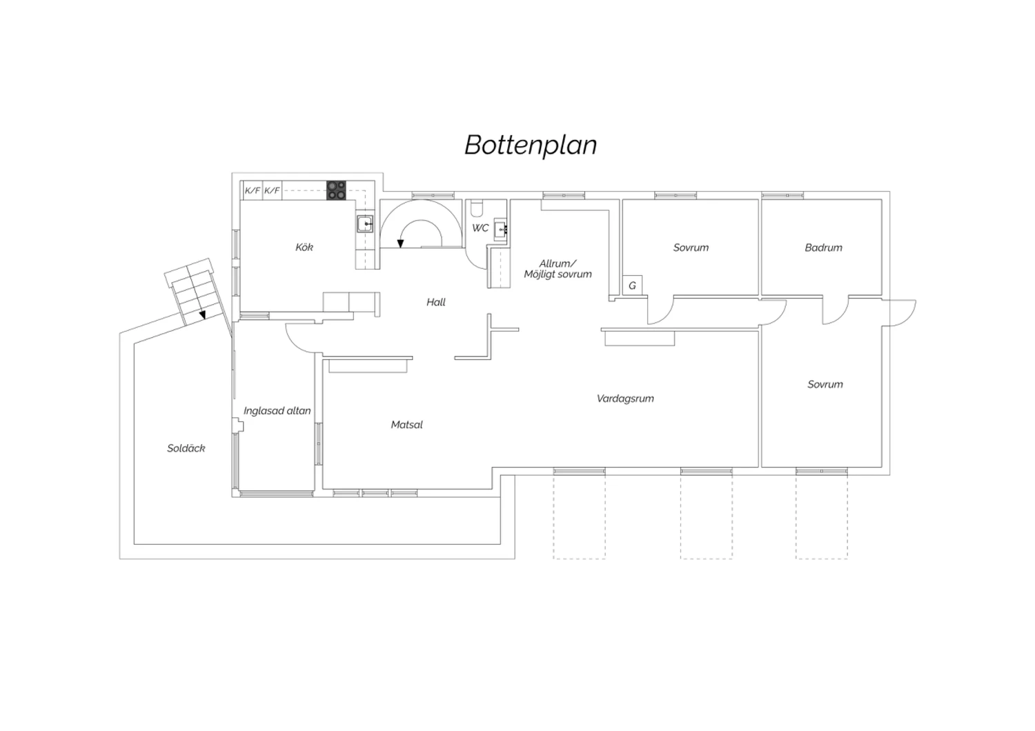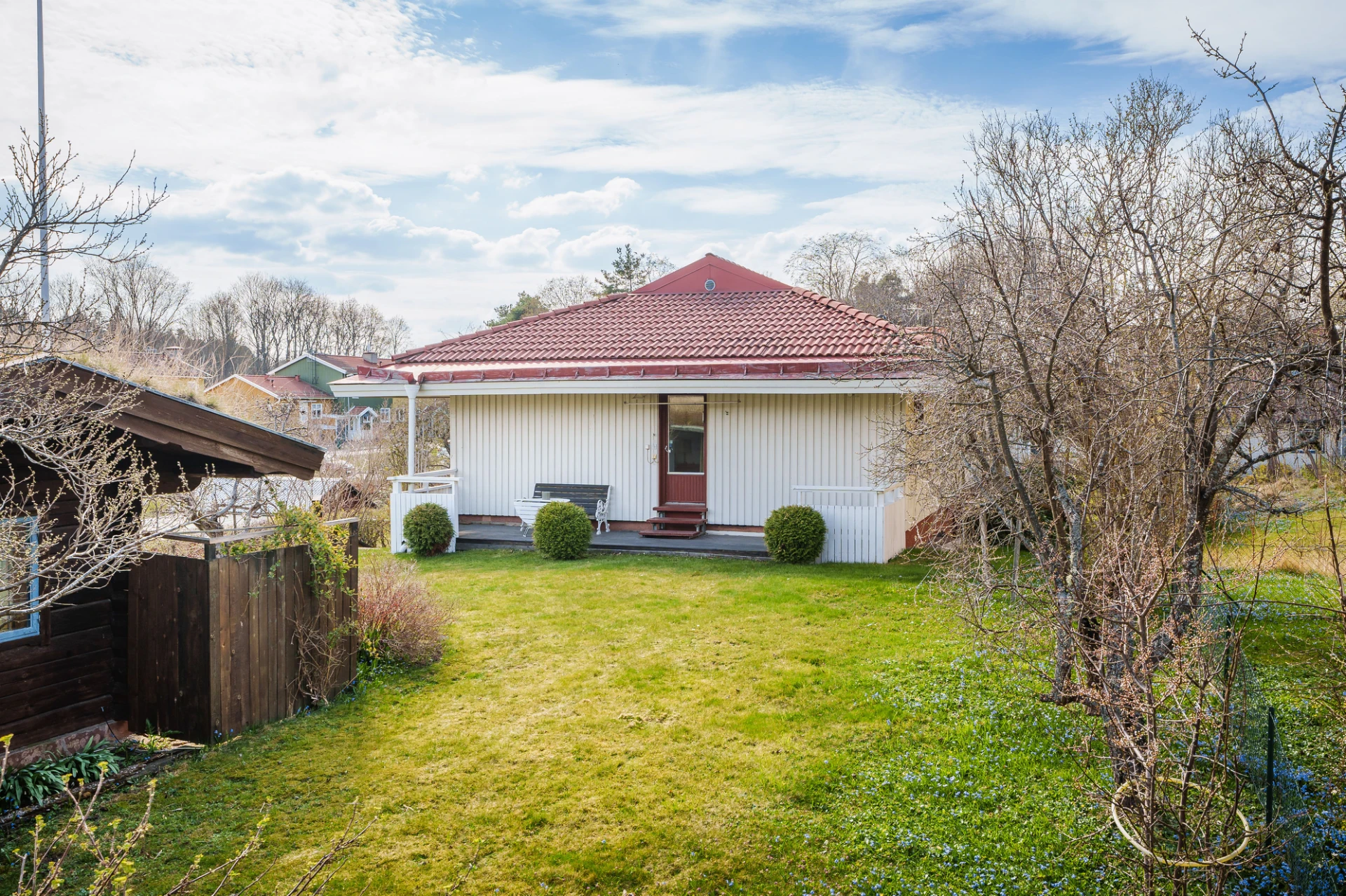 Parkettgolv med vattenburen golvvärme och ljusa väggar. Här finns plats för säng med tillhörande möblemang samt skrivbordshörna. Förvaring i platsbyggd garderober med skjutdörrar. Från sovrummet nås trädgården och altanen.