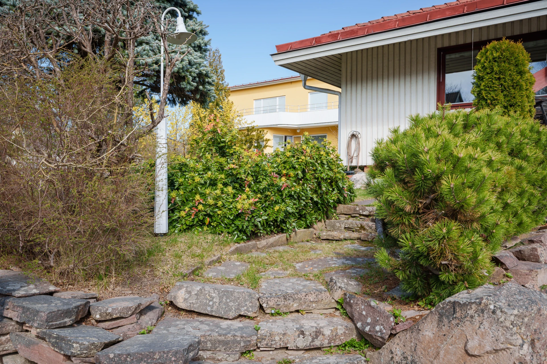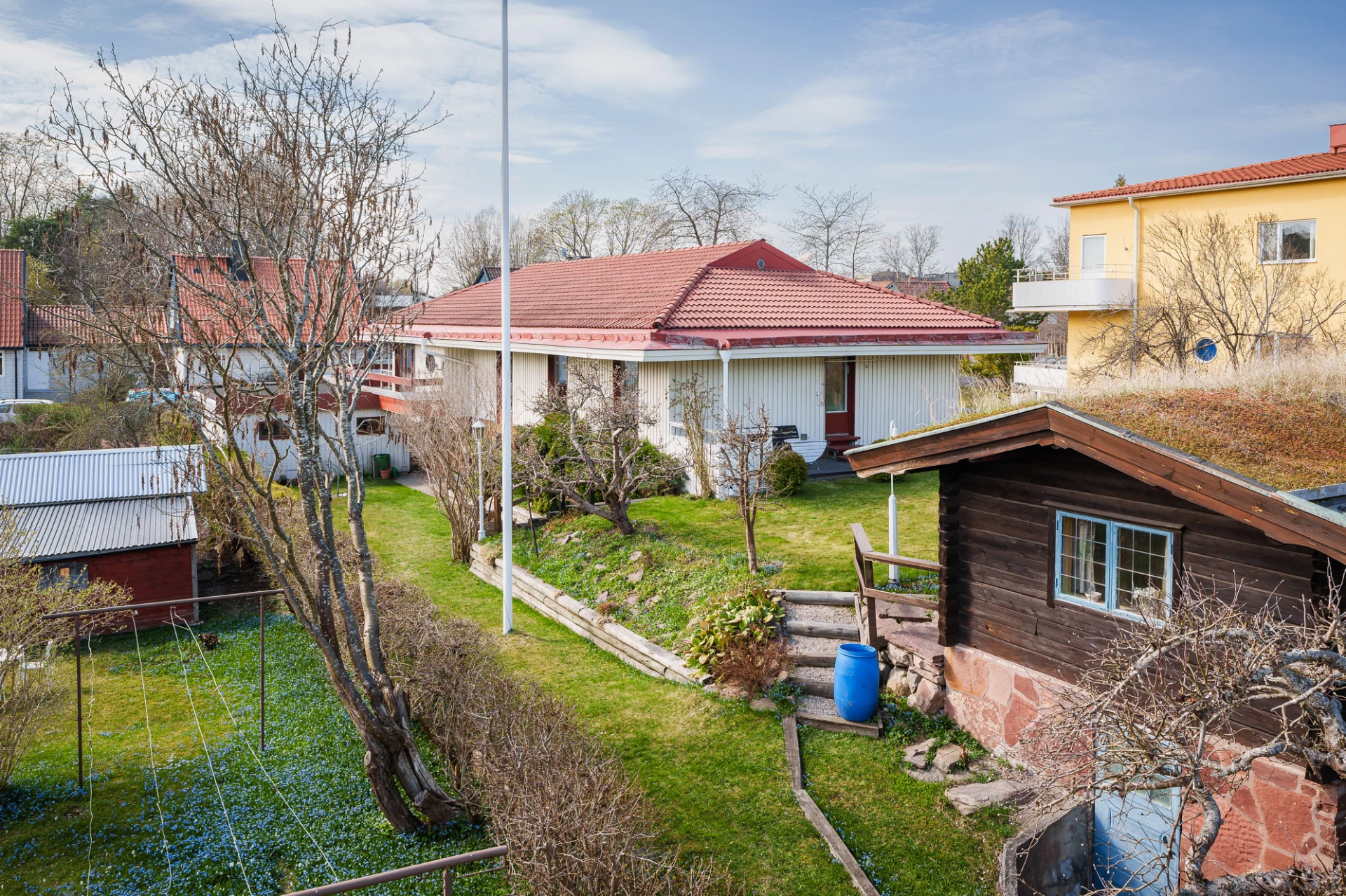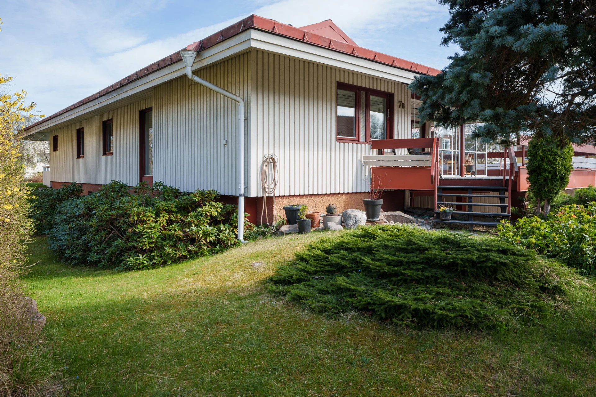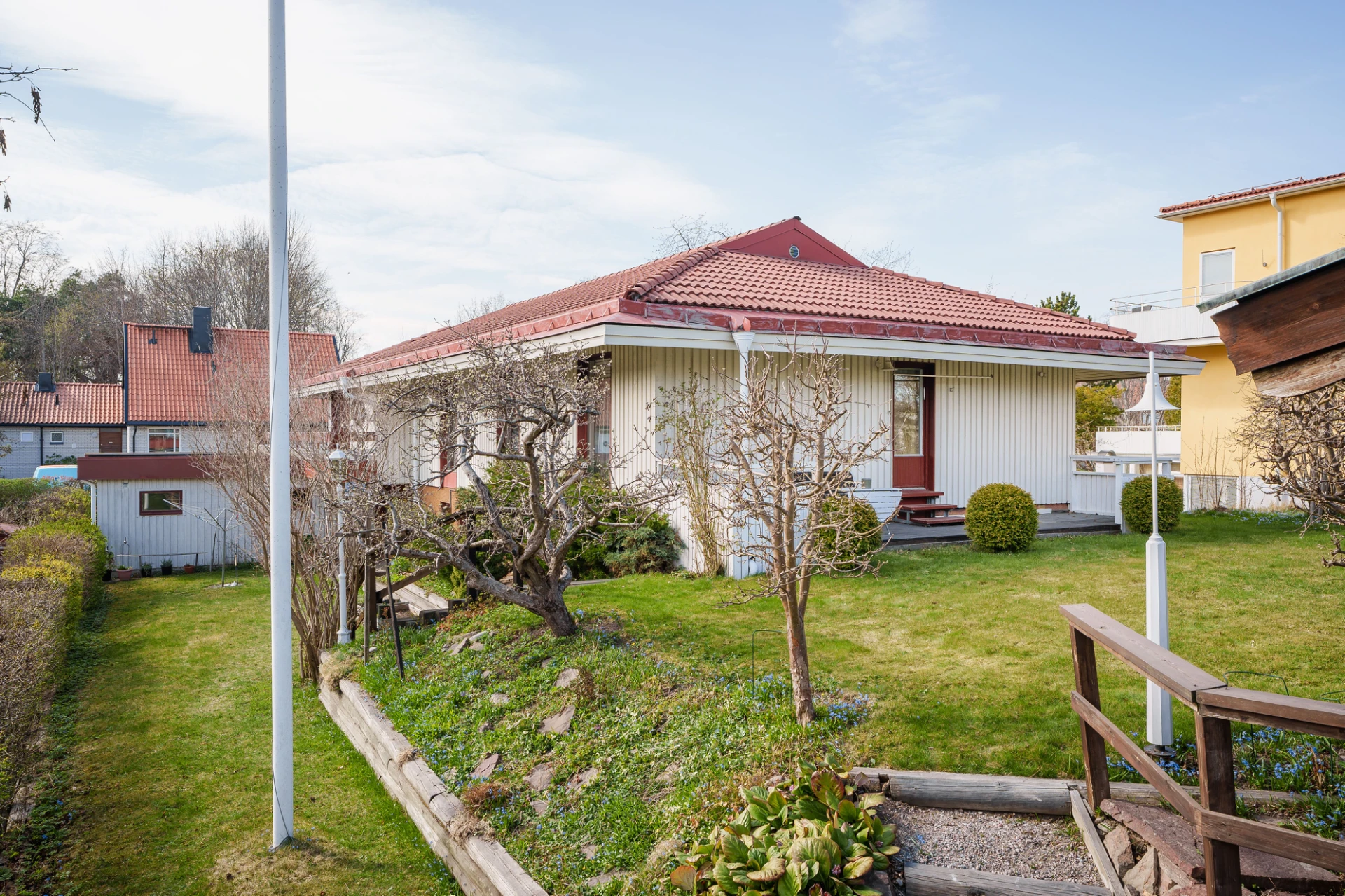 Parkettgolv med vattenburen golvvärme och ljusa väggar. Här finns plats för säng med tillhörande möblemang samt skrivbordshörna. Förvaring i platsbyggd garderober med skjutdörrar. Från sovrummet nås trädgården och altanen.