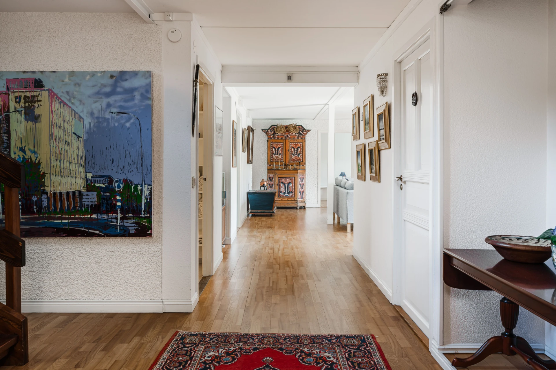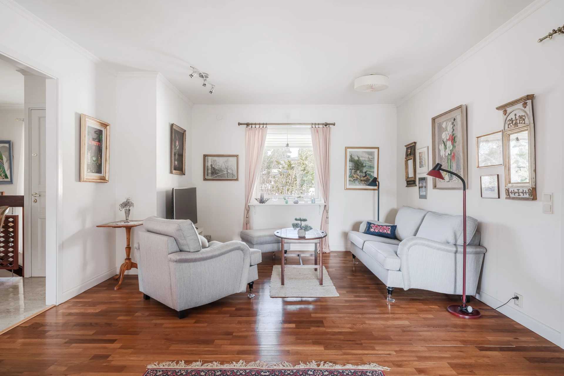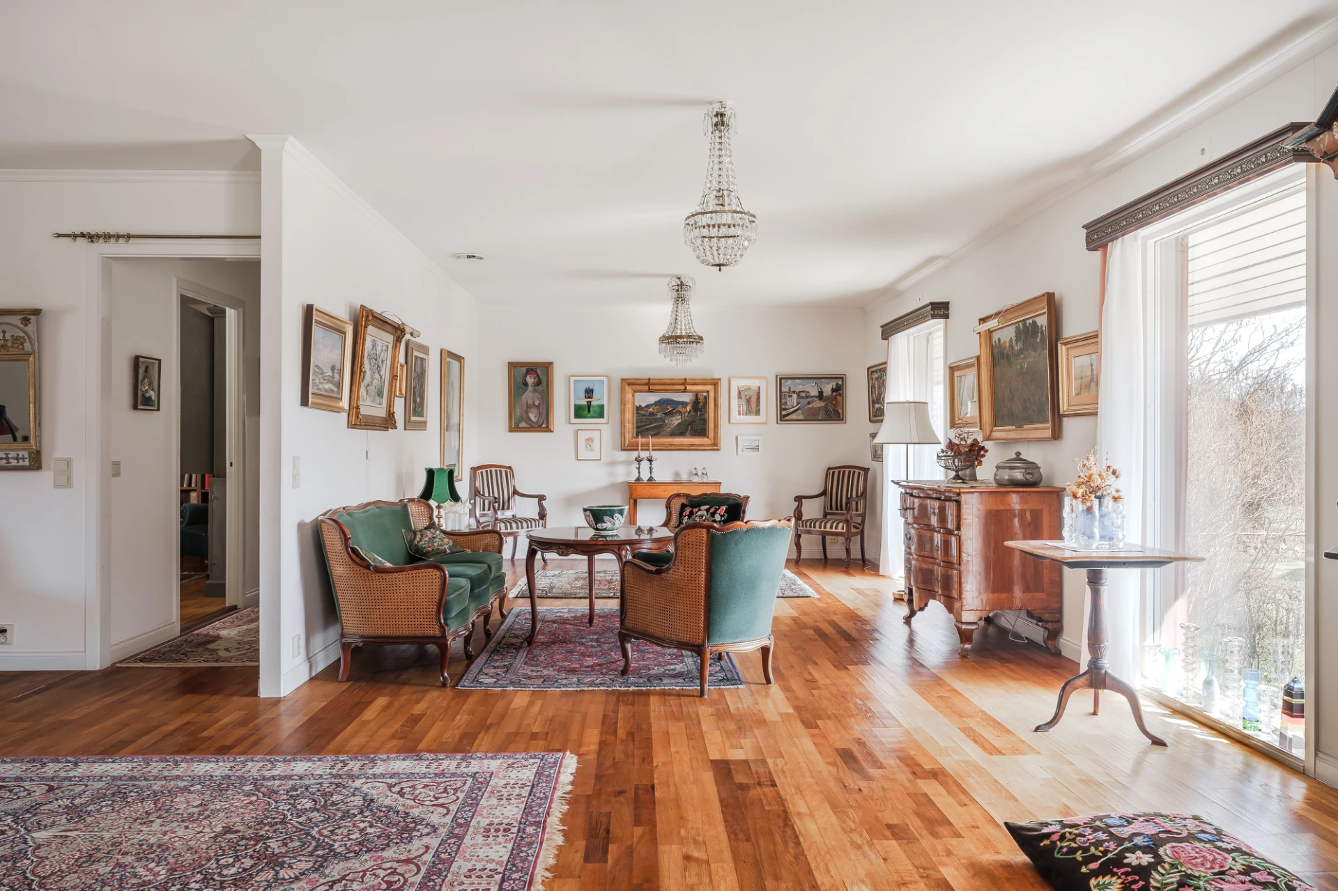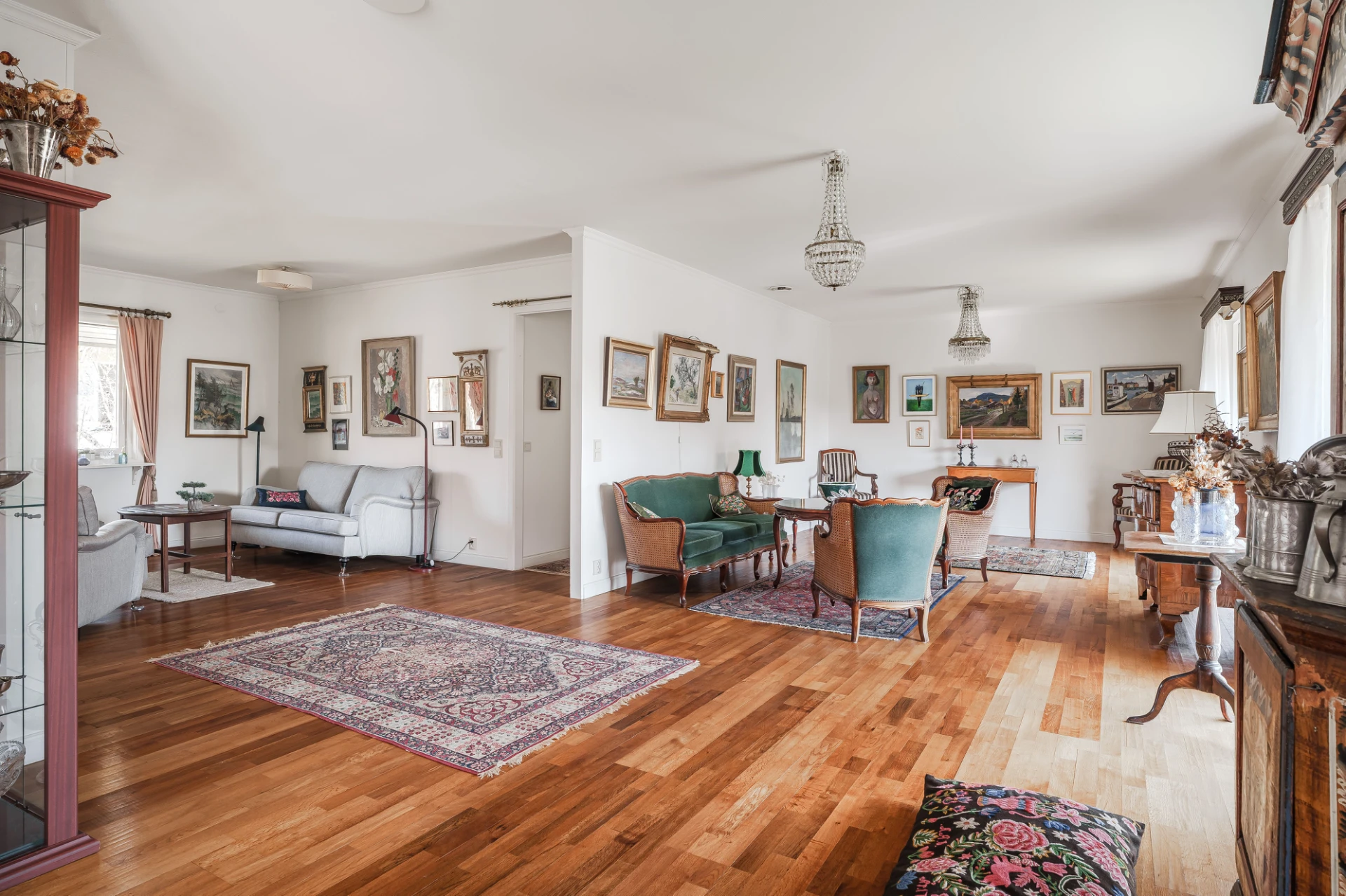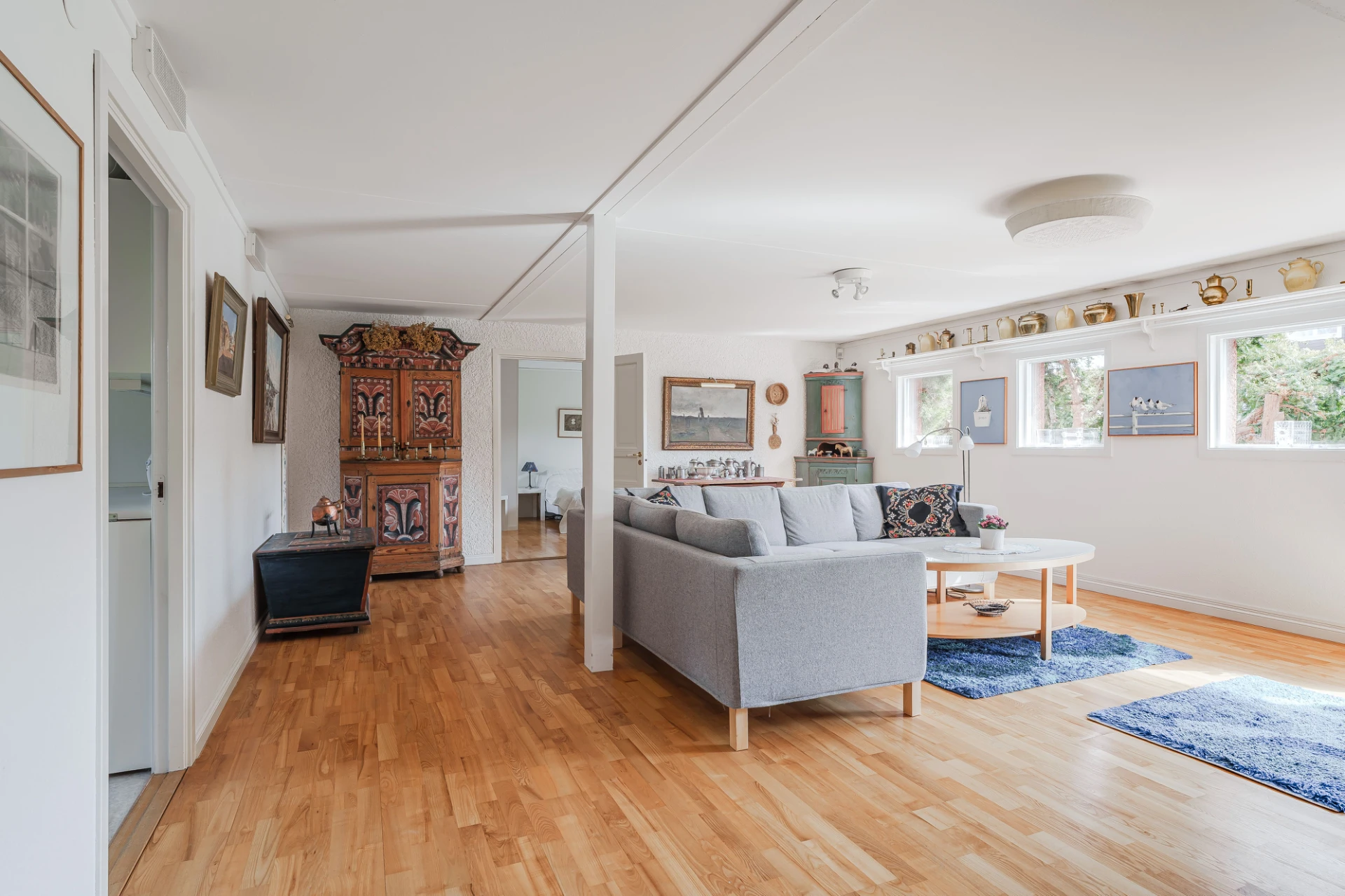 Parkettgolv med vattenburen golvvärme och ljusa väggar. Här finns plats för soffgrupper med tillhörande möblemang.
