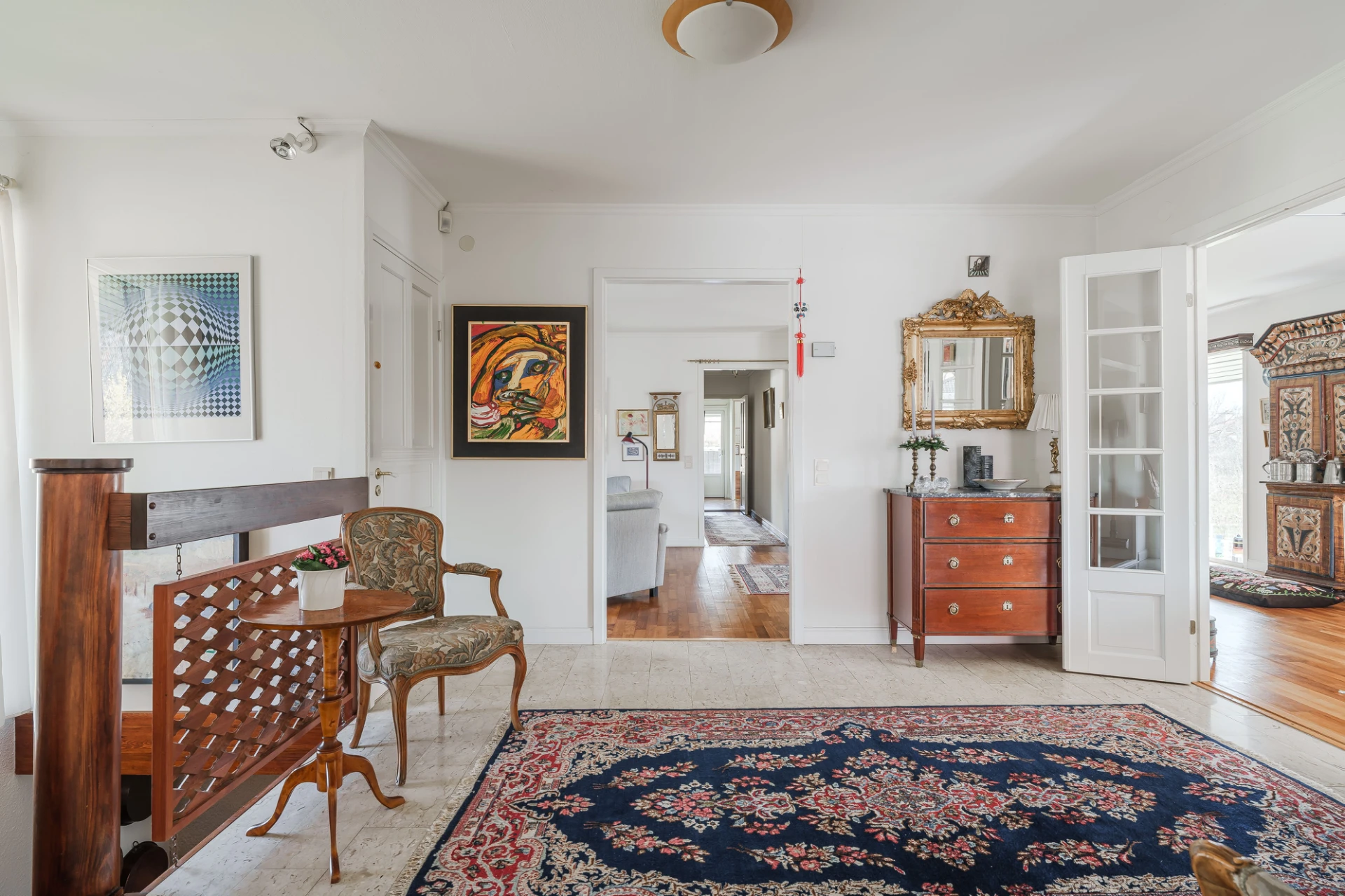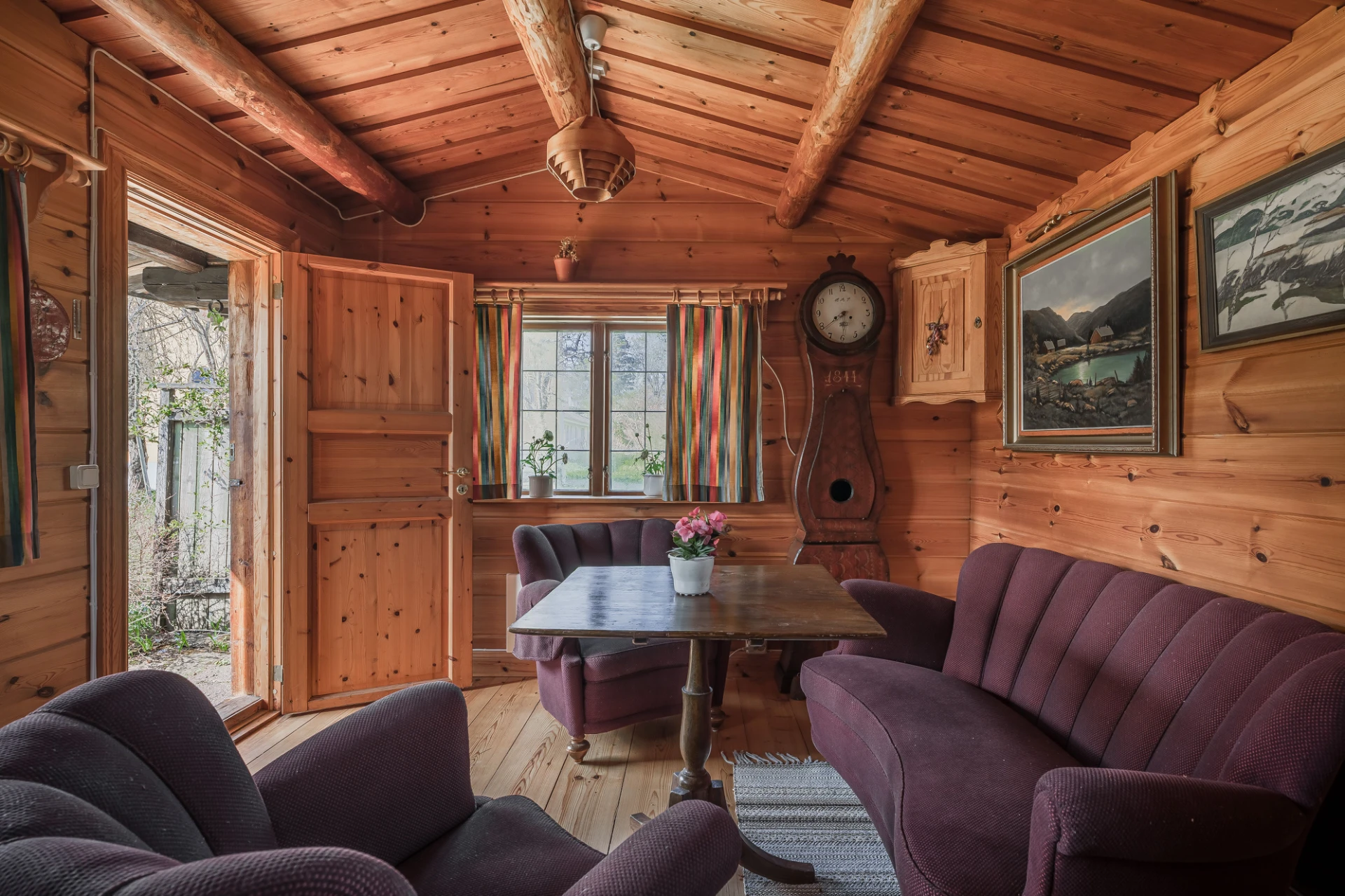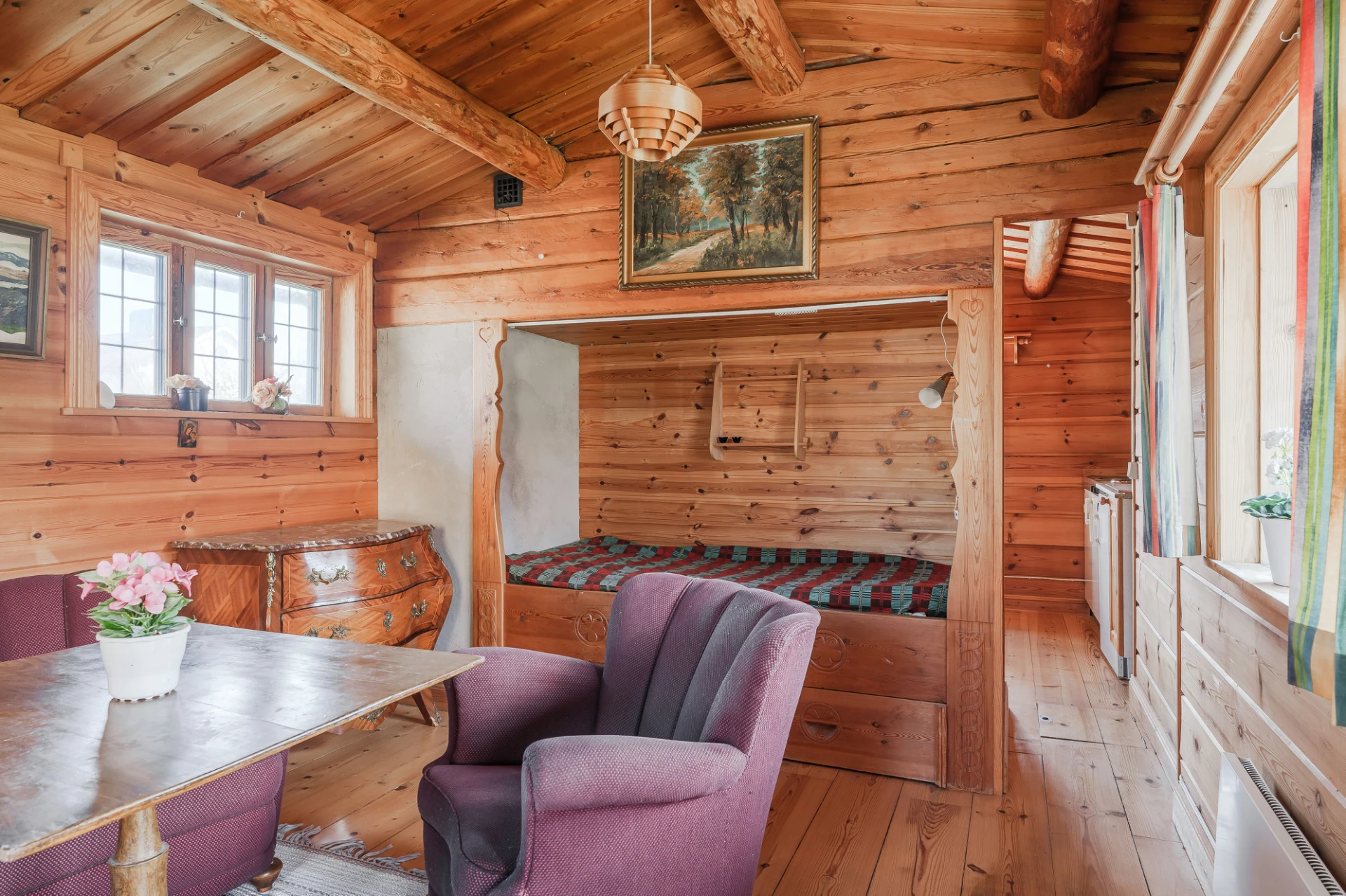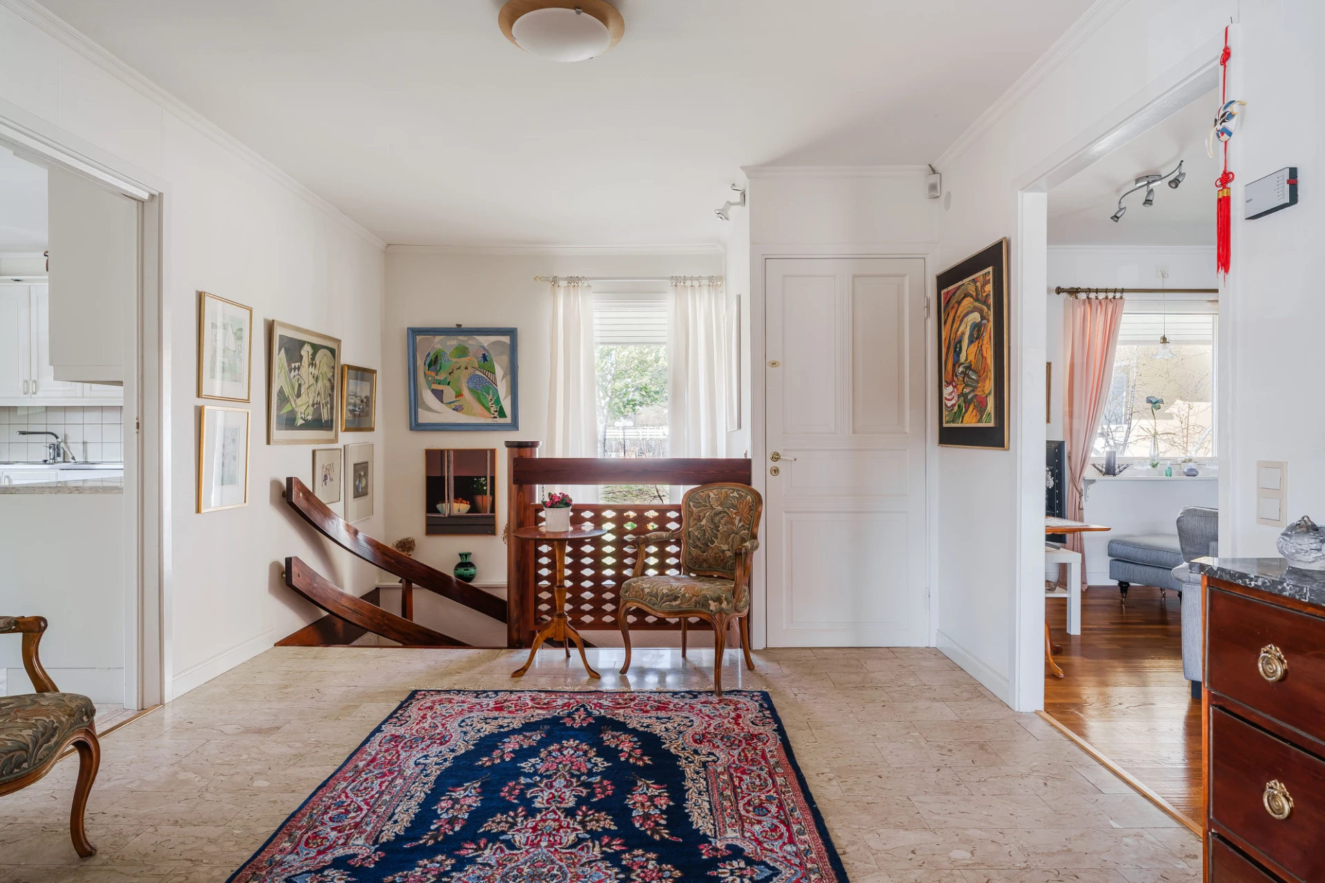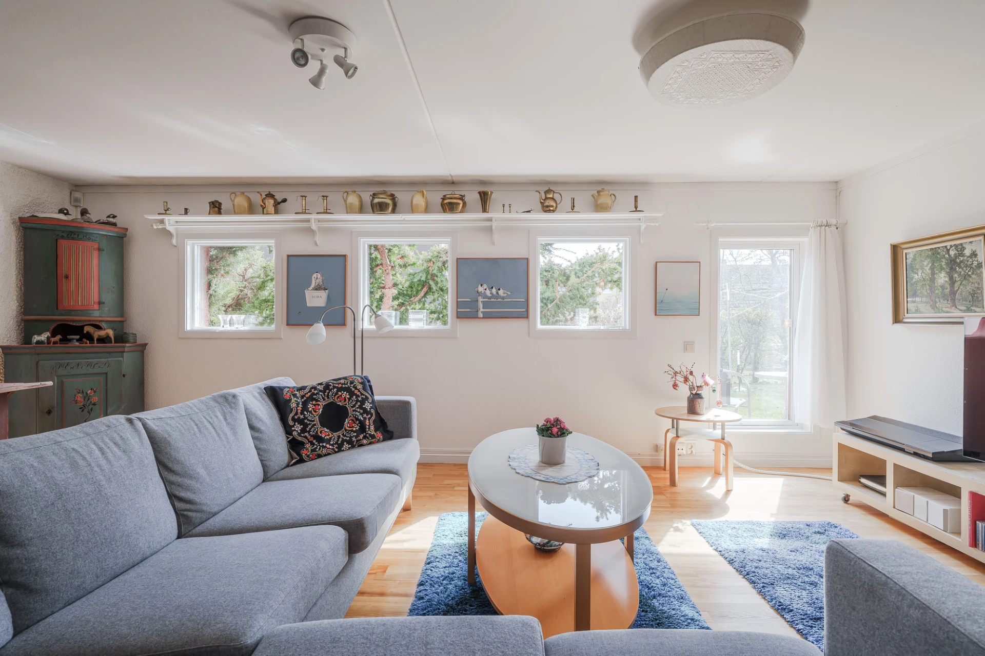 Parkettgolv med vattenburen golvvärme och ljusa väggar. Här finns plats för soffgrupper med tillhörande möblemang.