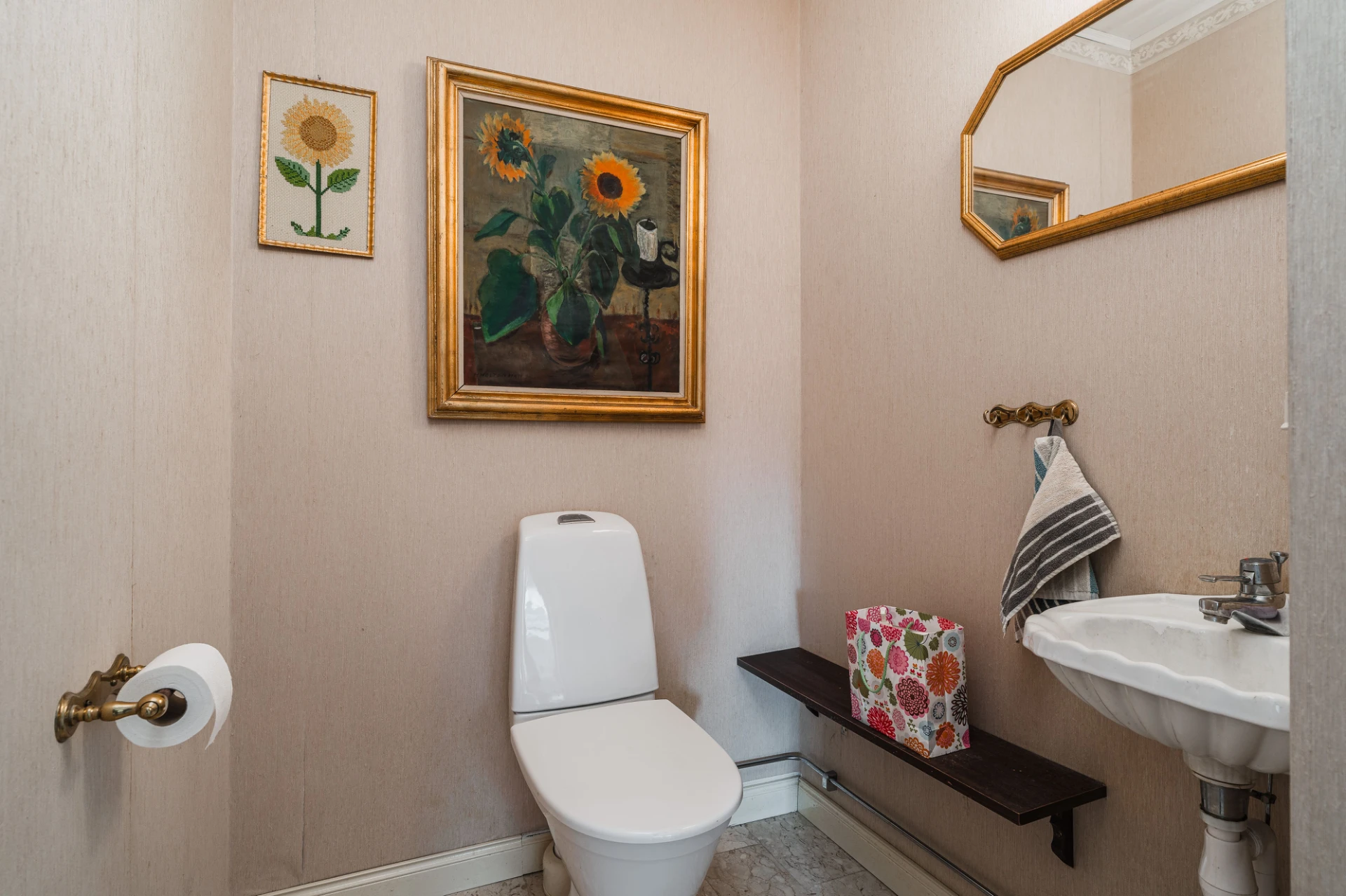 Marmorgolv med vattenburen golvvärme och beiga väggar. Toaletten är utrustad med wc, handfat samt vägghängd spegel.