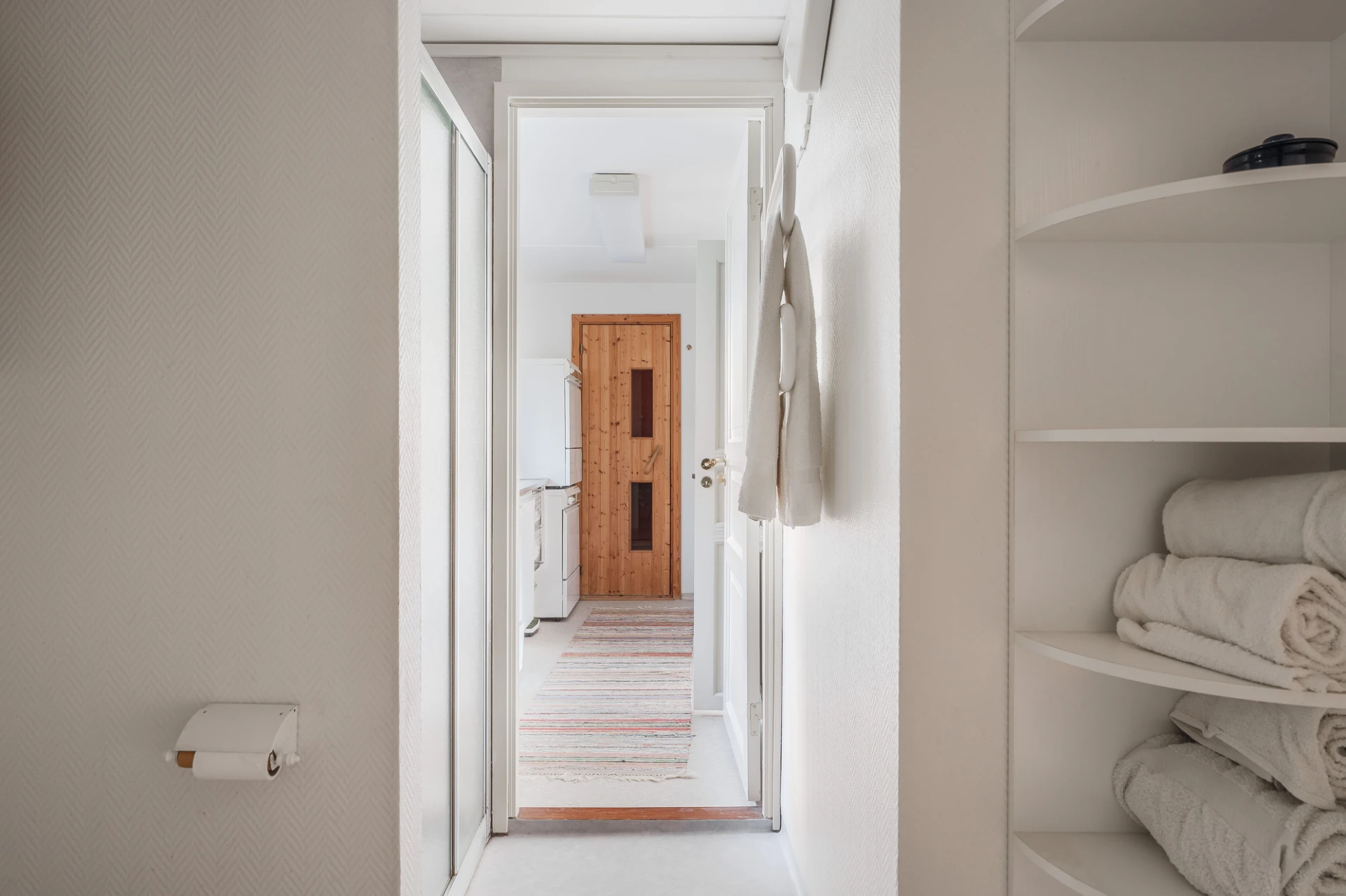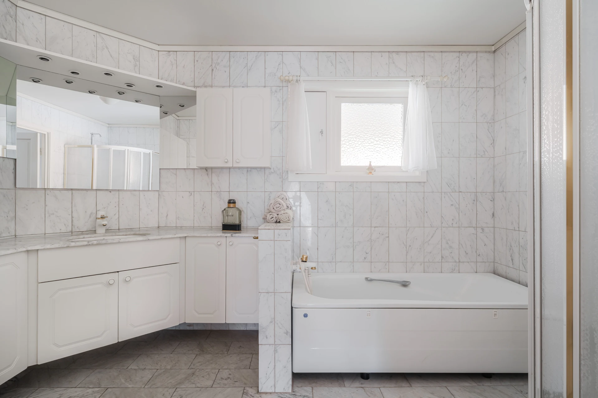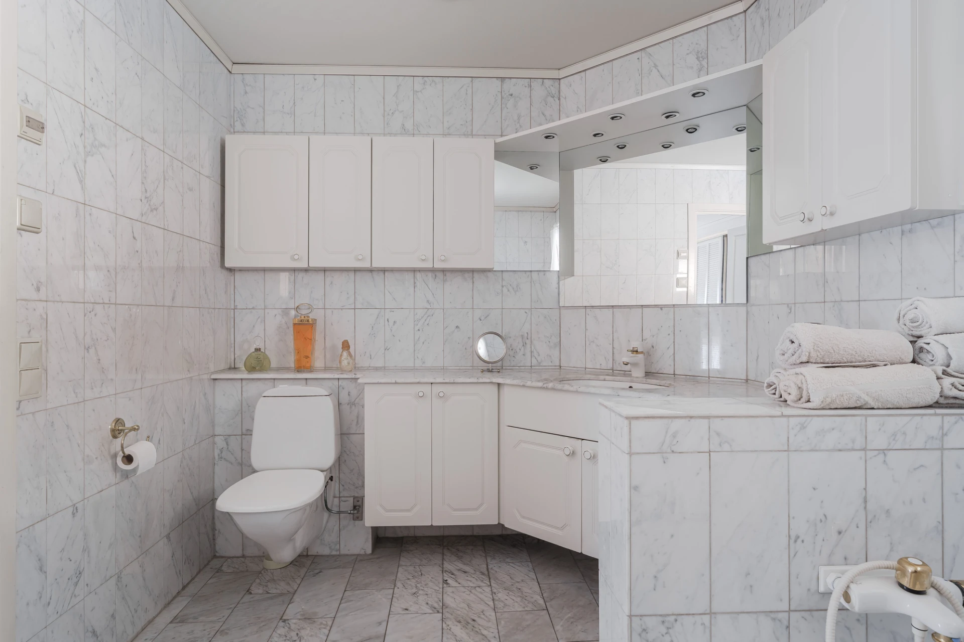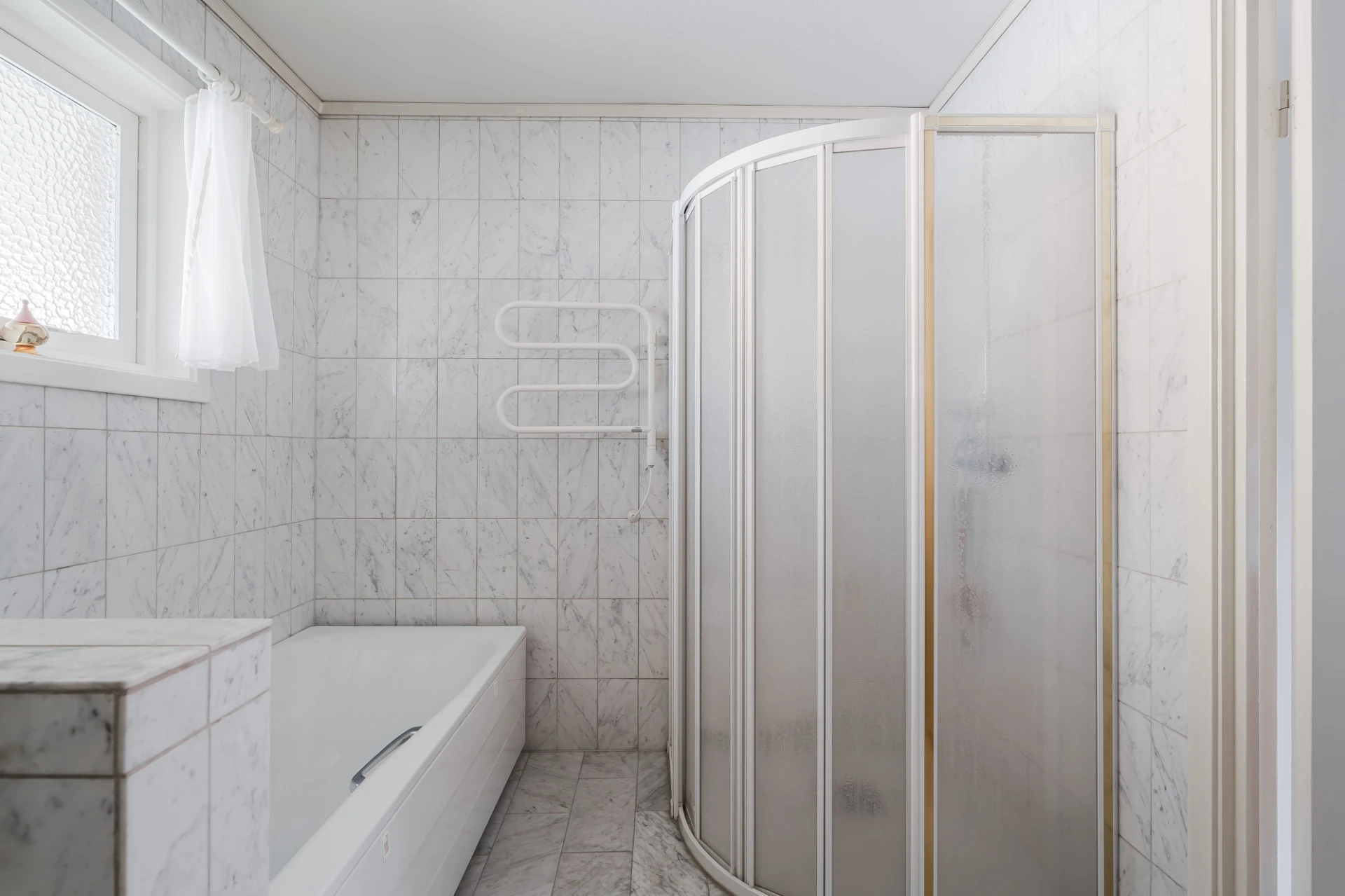 Marmorgolv med vattenburen golvvärme och ljusa väggar. Plats för avhängning.
