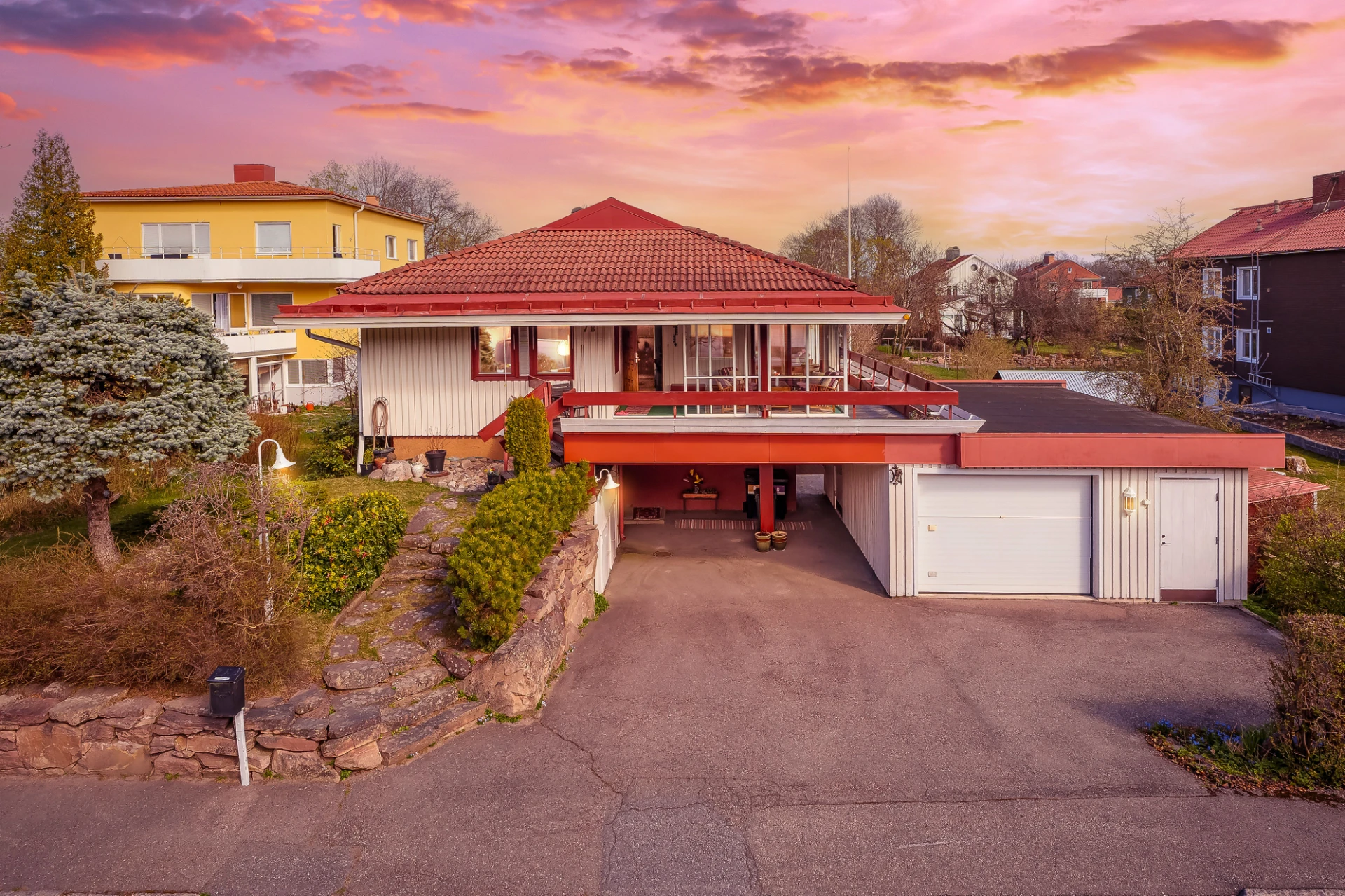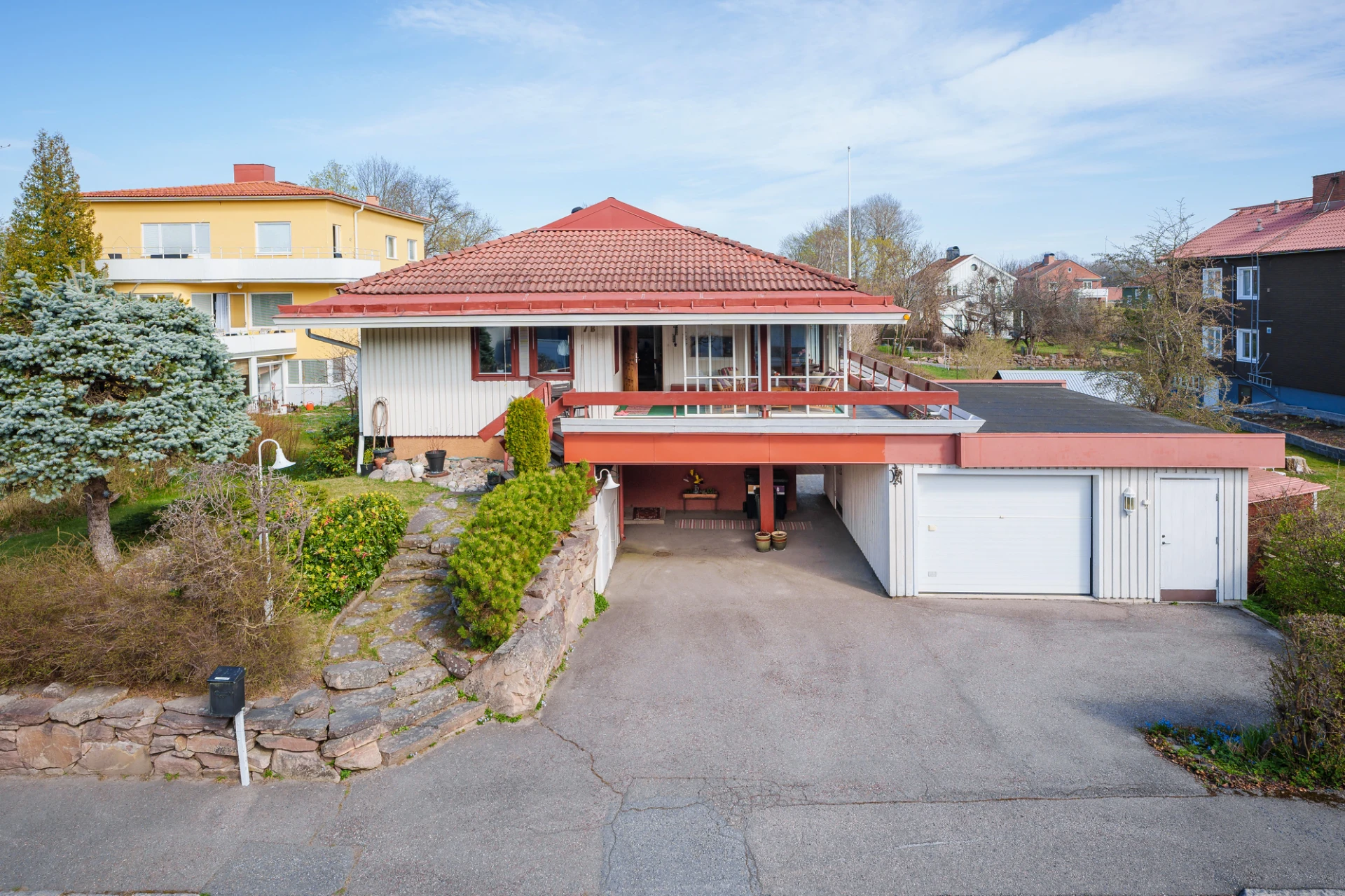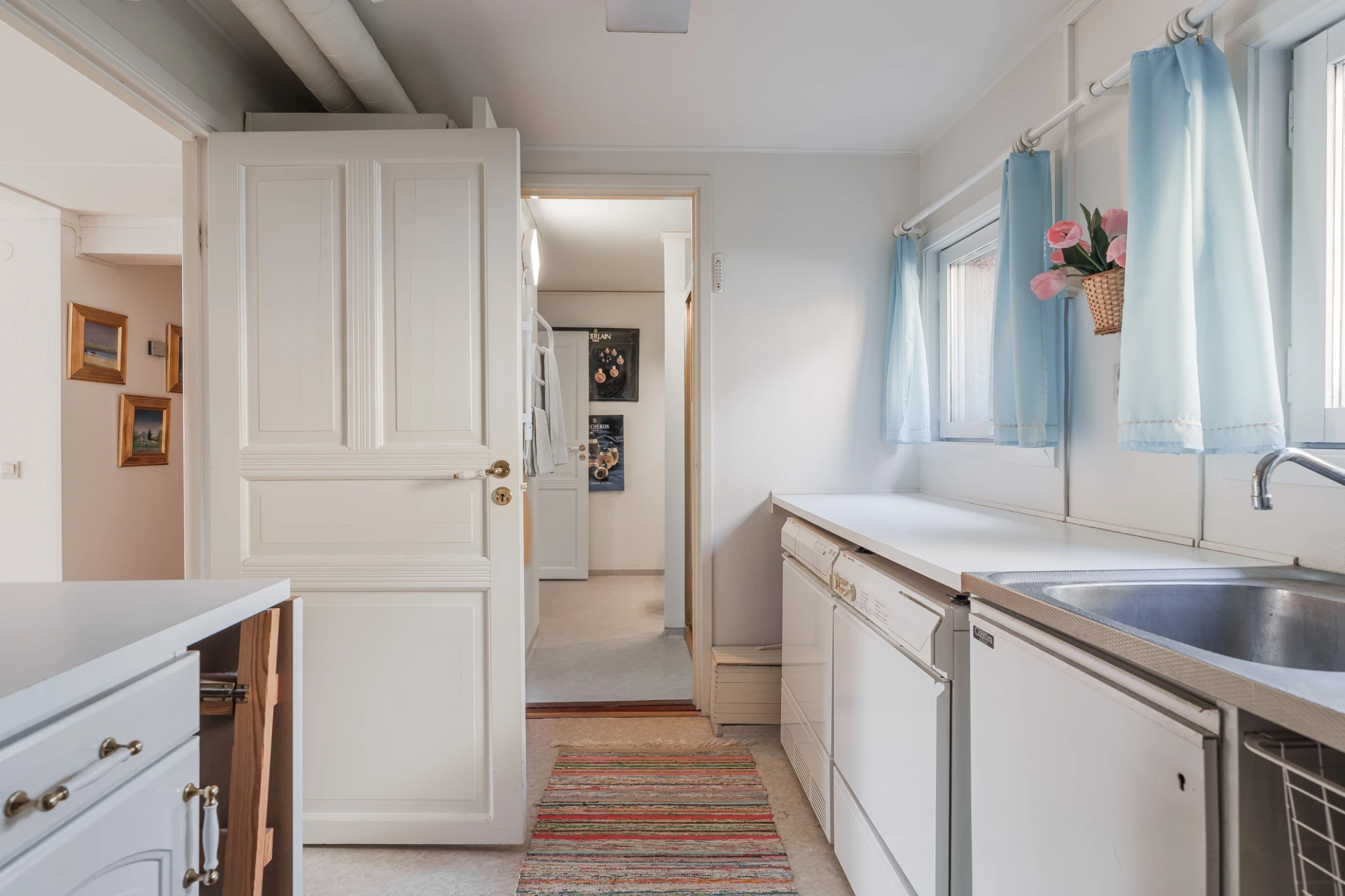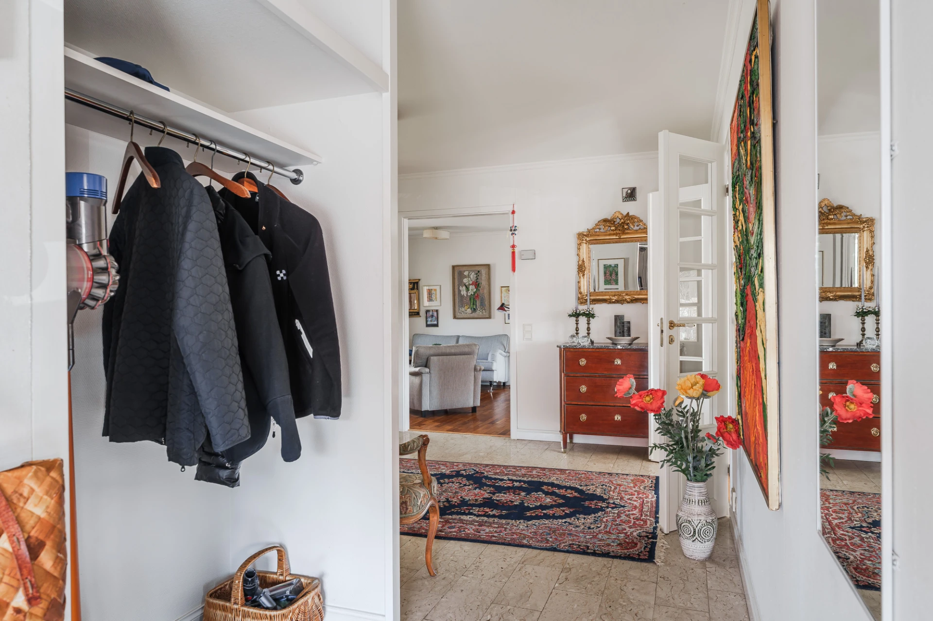 Marmorgolv med vattenburen golvvärme och ljusa väggar. Plats för avhängning.