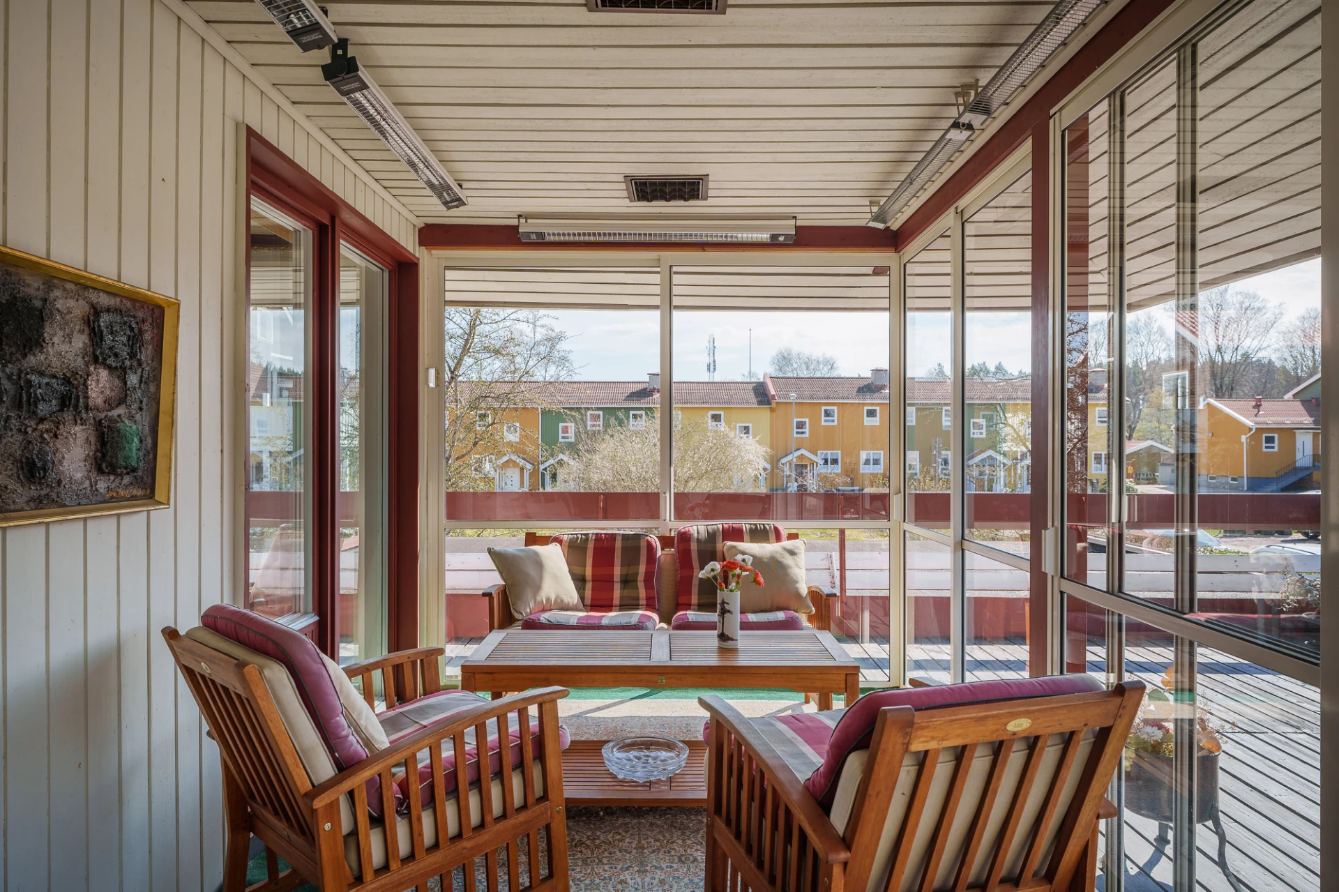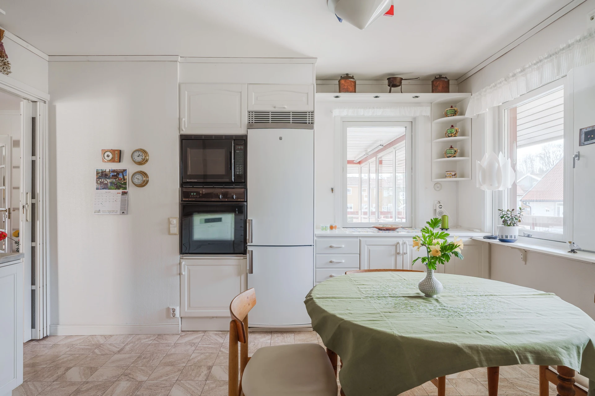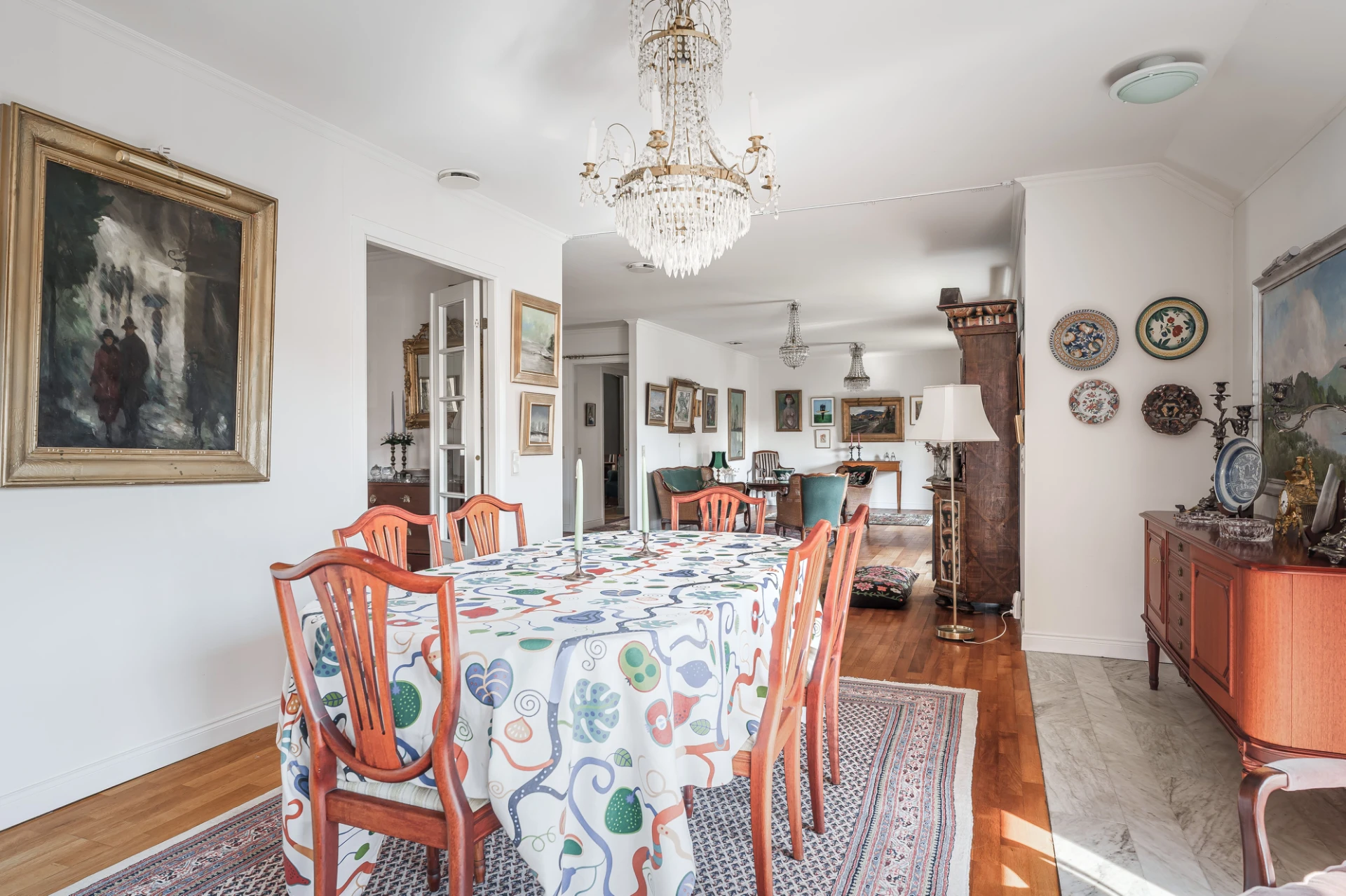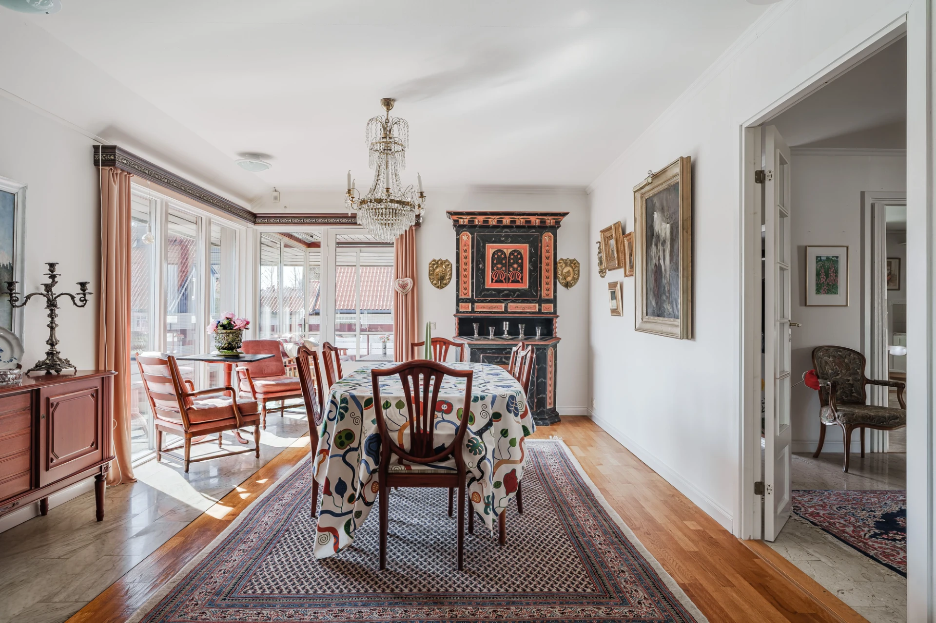 Parkettgolv med vattenburen golvvärme och ljusa väggar. Här finns plats för större matbord. Från matrummet nås bostaden inglasade altan.