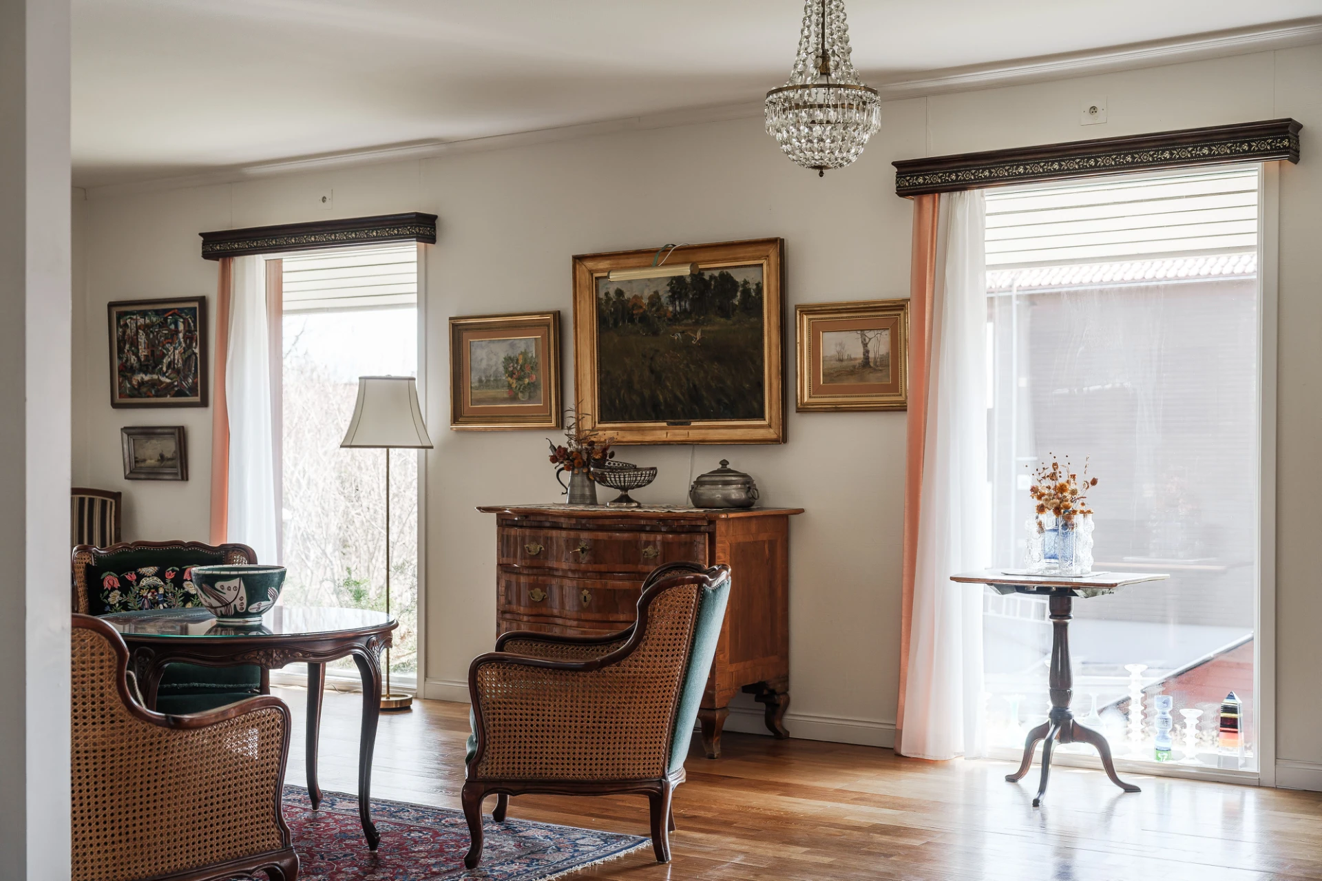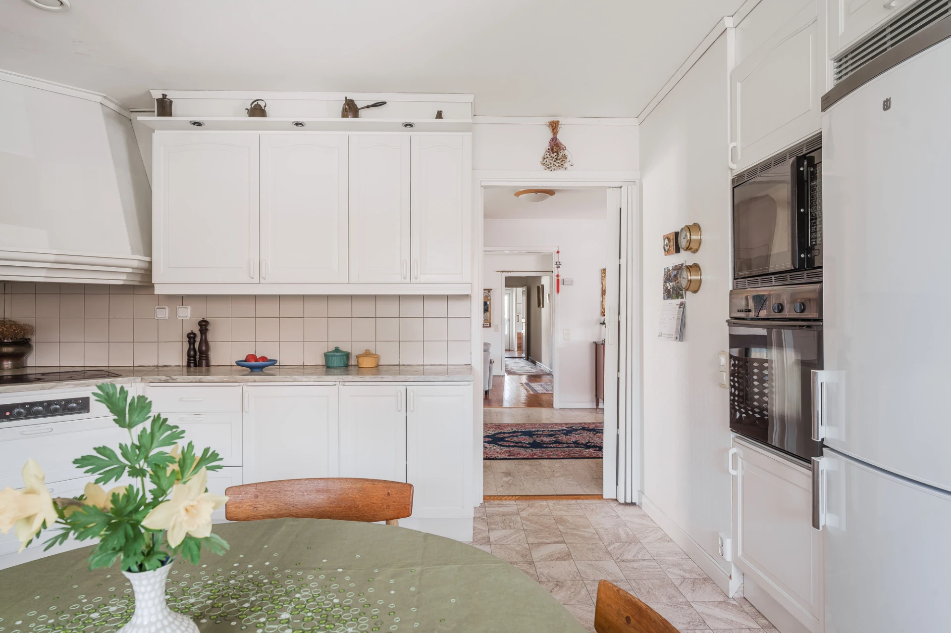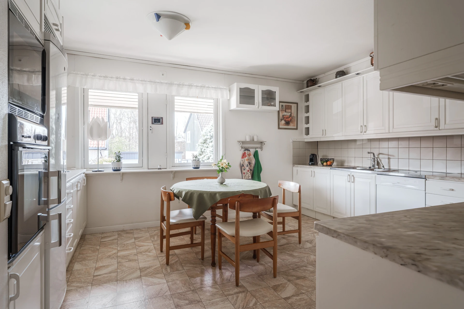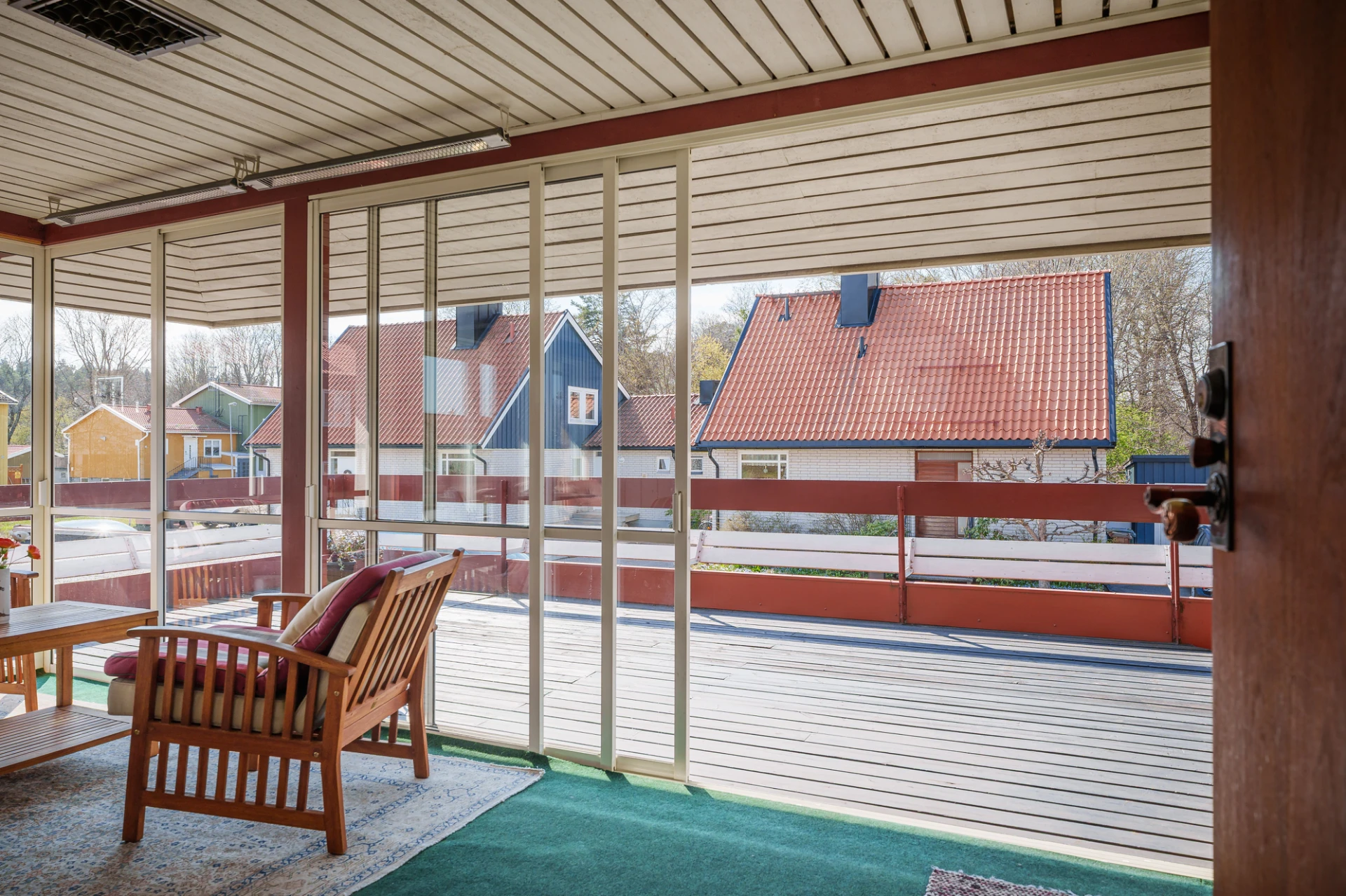 Parkettgolv med vattenburen golvvärme och ljusa väggar. Här finns plats för större matbord. Från matrummet nås bostaden inglasade altan.