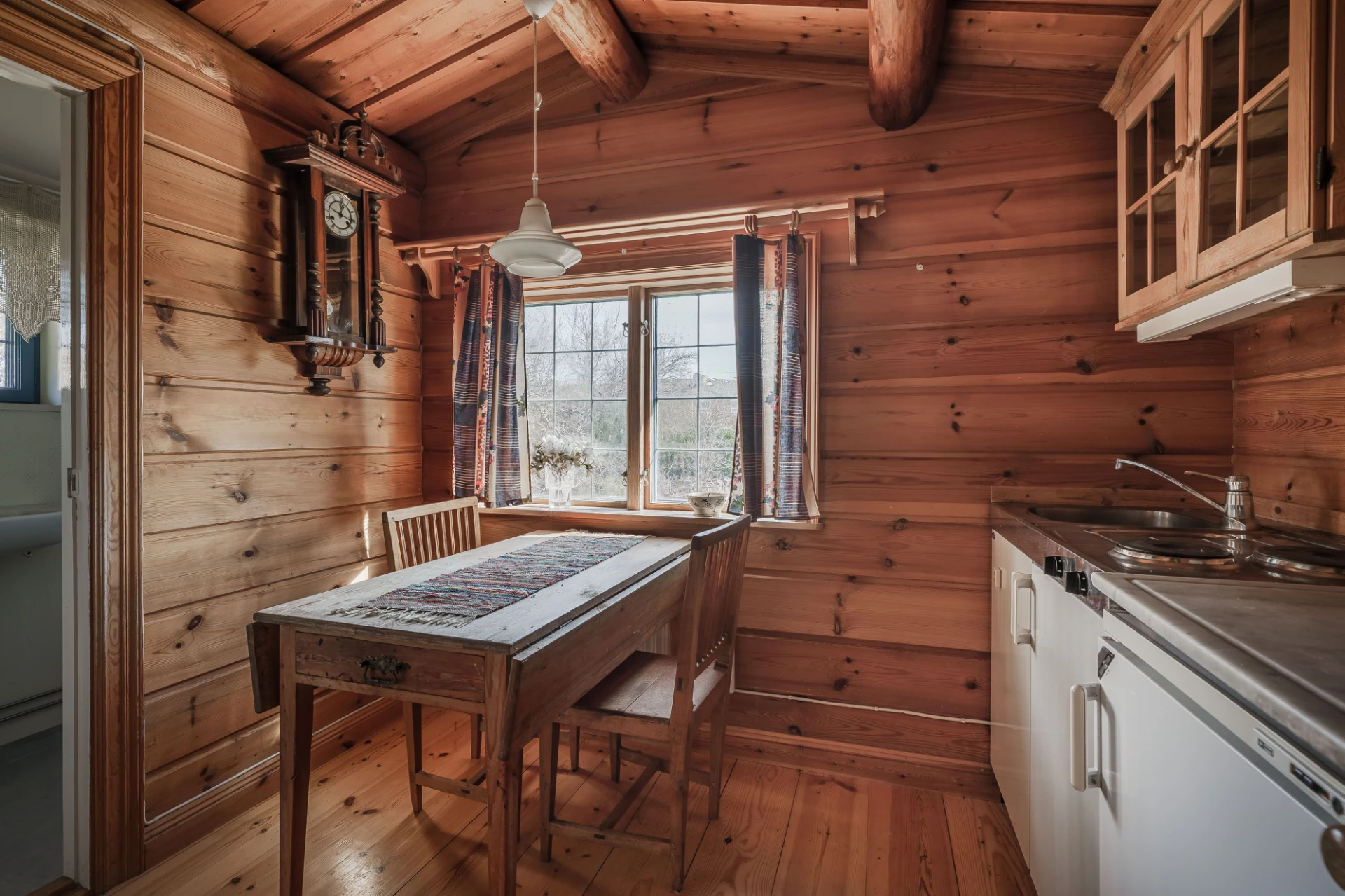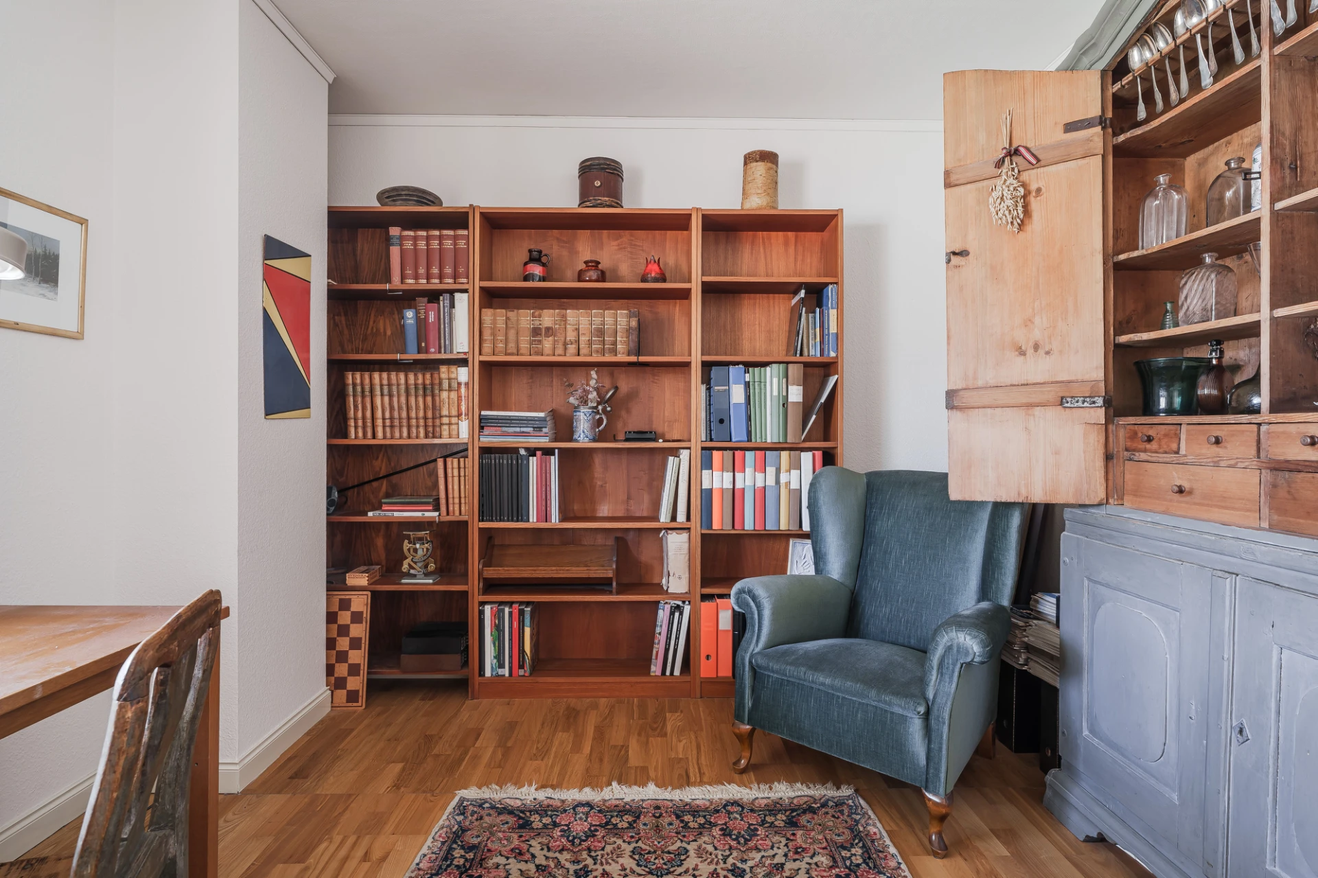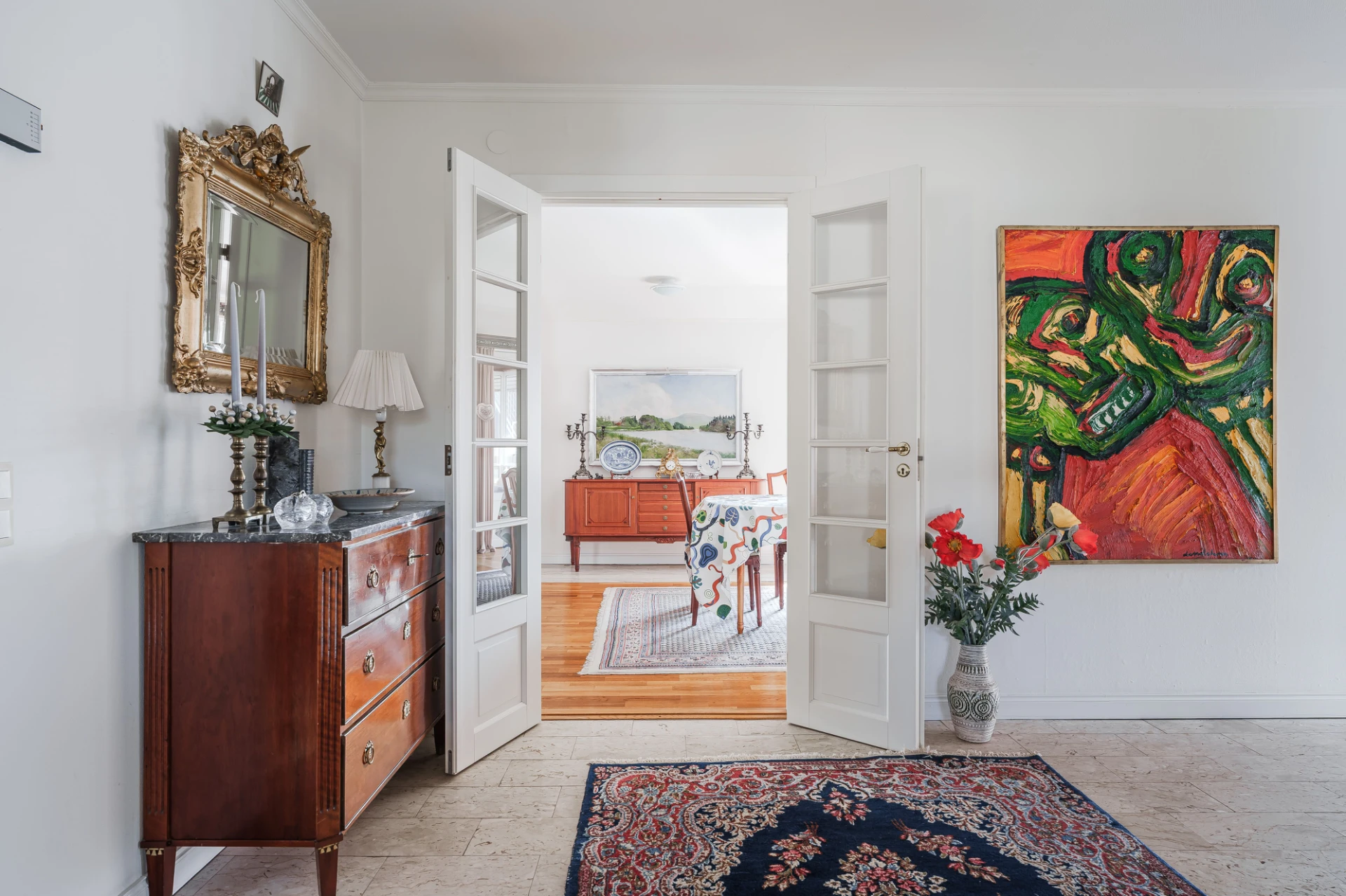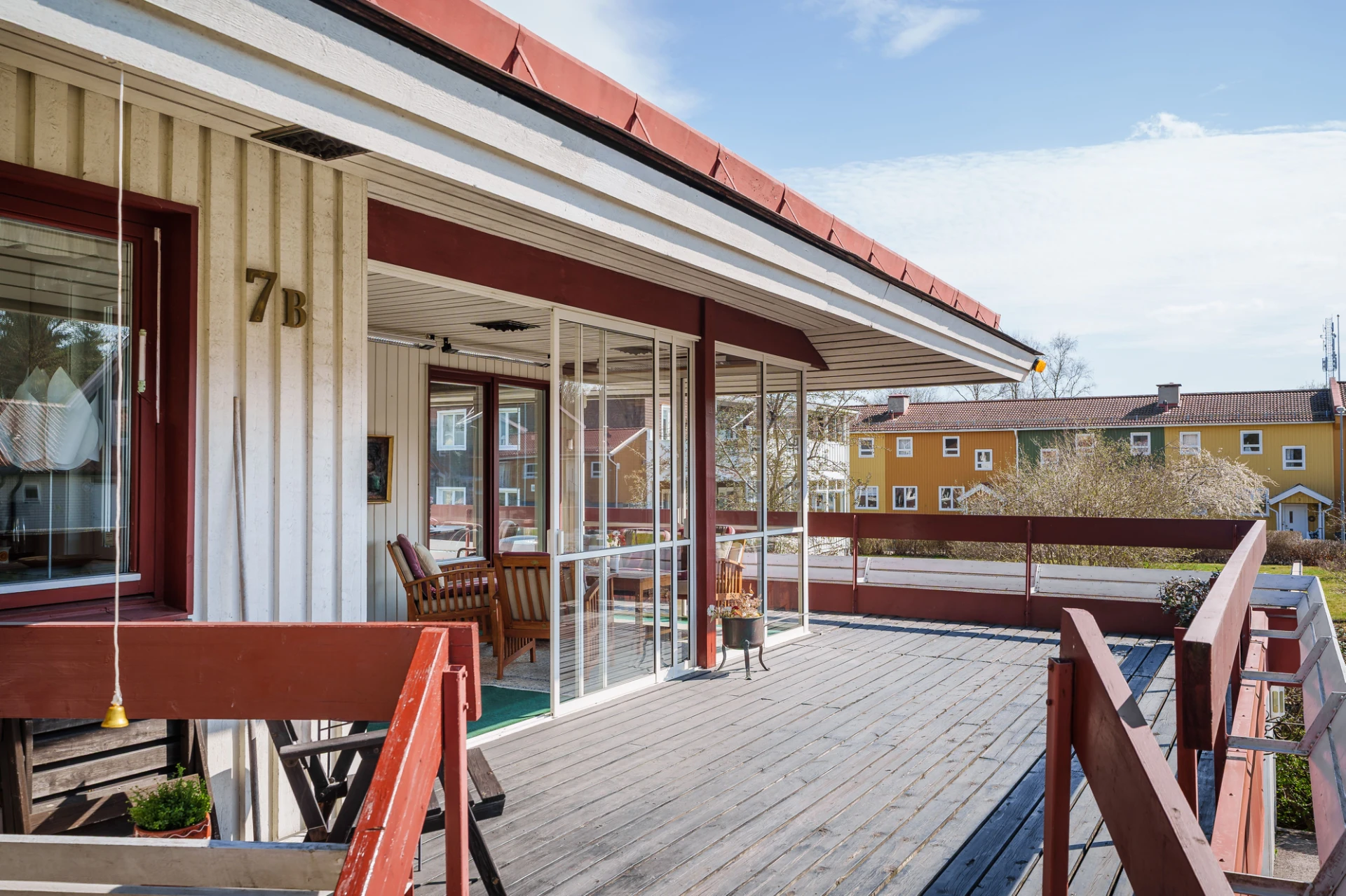 Parkettgolv med vattenburen golvvärme och ljusa väggar. Här finns plats för större matbord. Från matrummet nås bostaden inglasade altan.