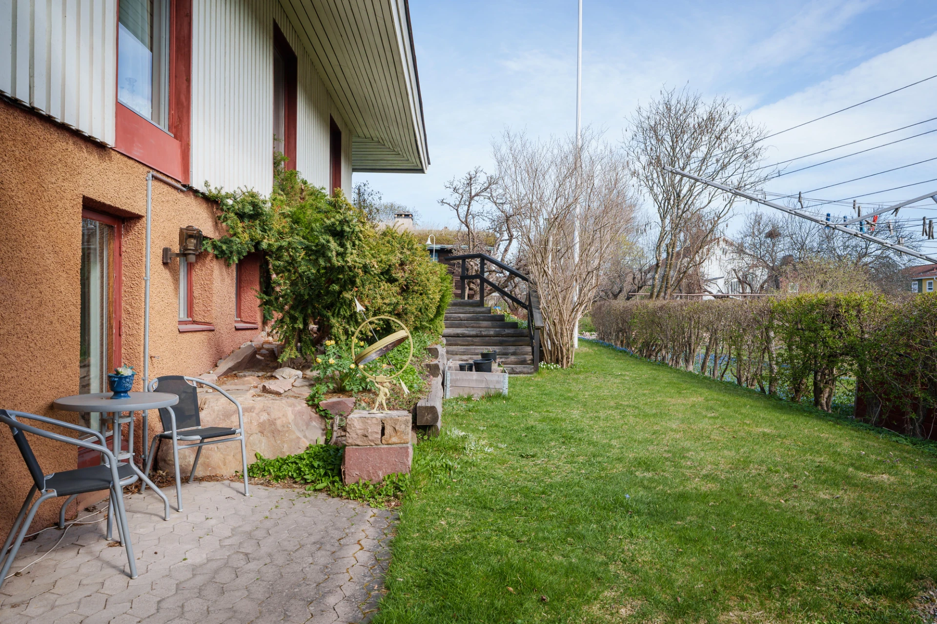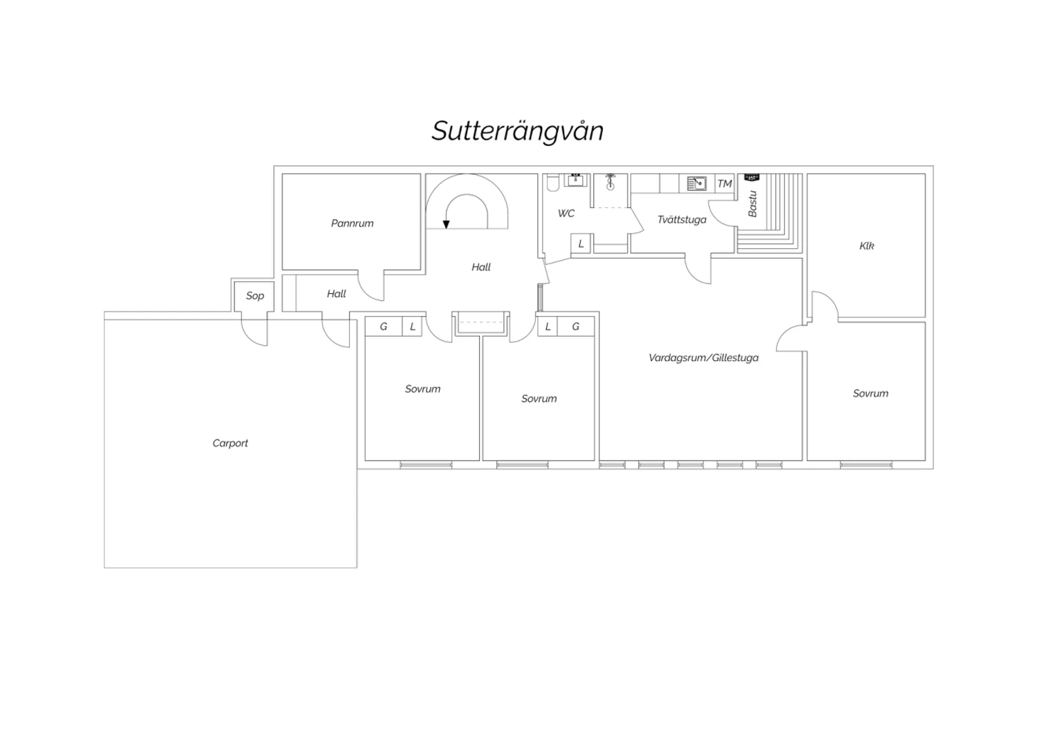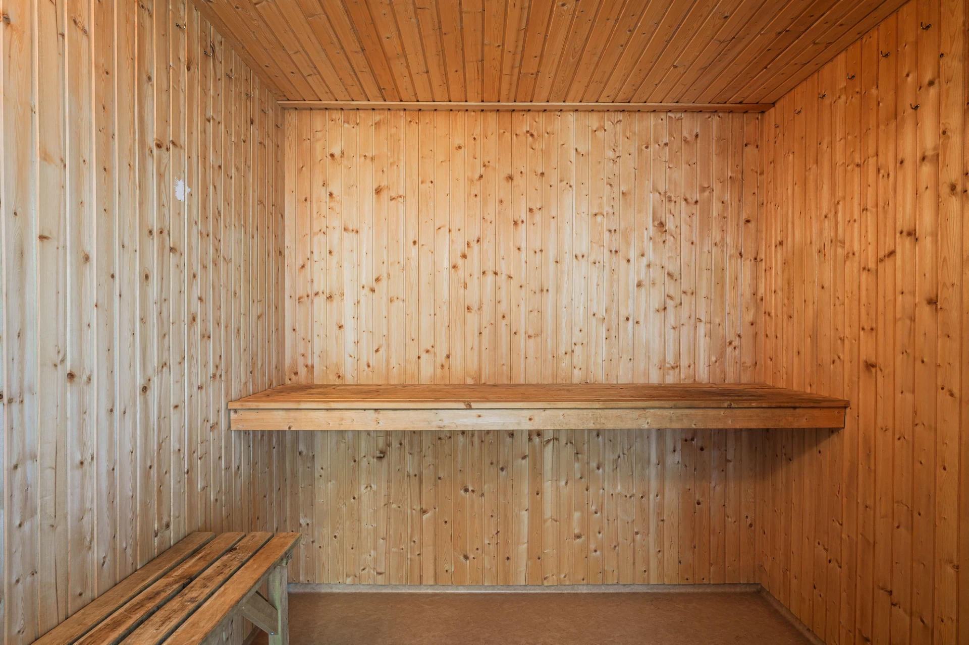 Plastmatta med vattenburen golvvärme och ljusa väggar. Tvättstugan är utrustad med tvättmaskin, torktumlare, tvättho, arbetsbänk, förvaringsskåp samt bastu.