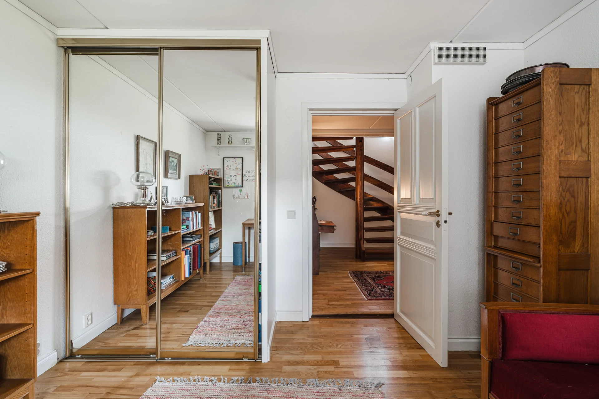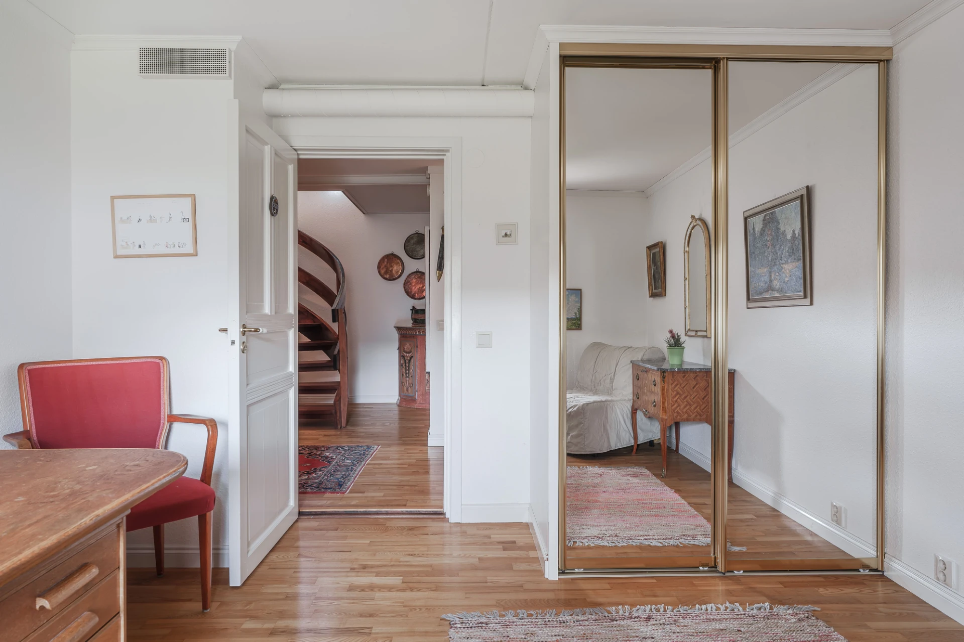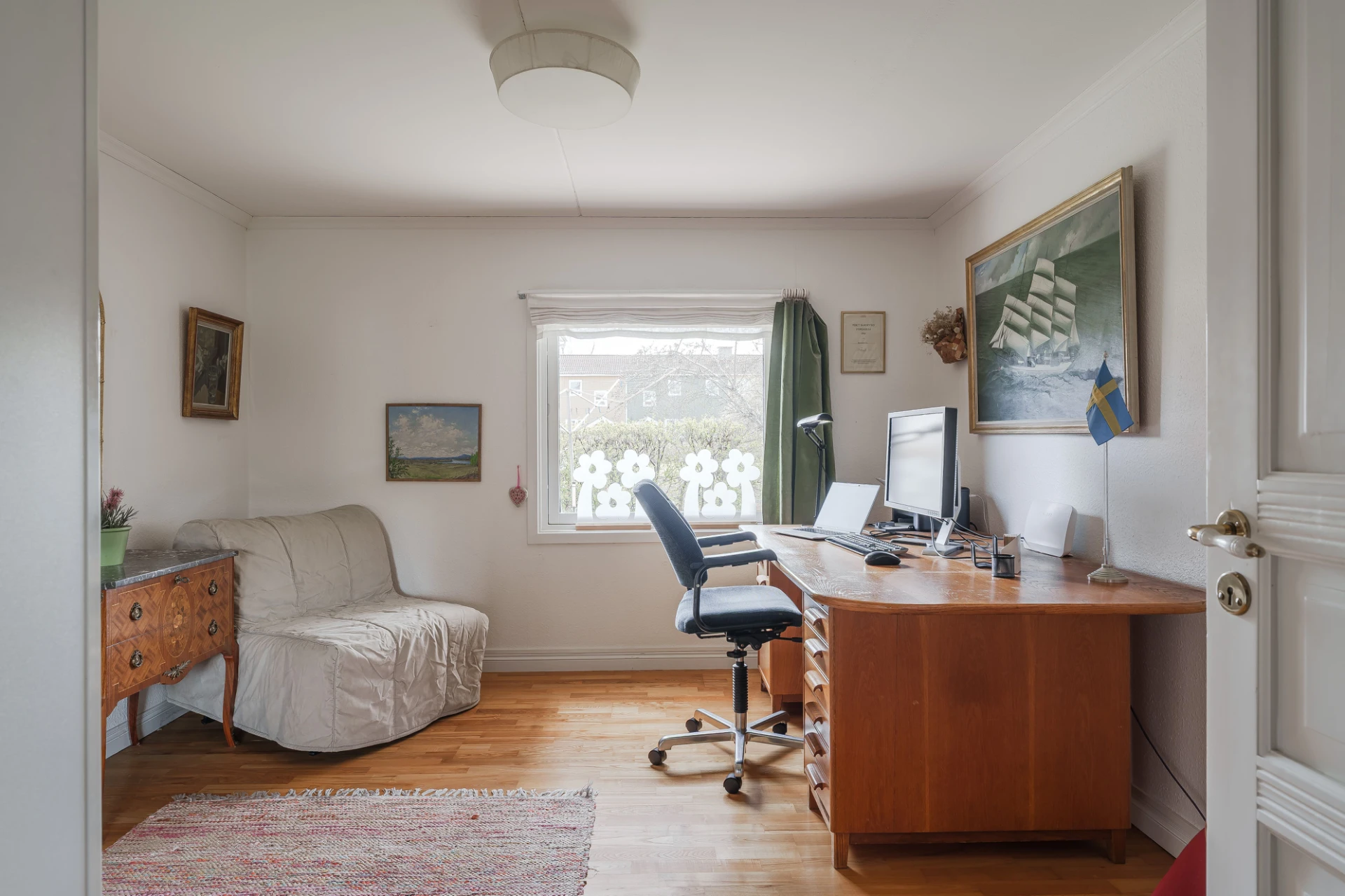 Parkettgolv med vattenburen golvvärme och ljusa väggar. Här finns plats för skrivbord och lämpar sig bra för hemmakontor.