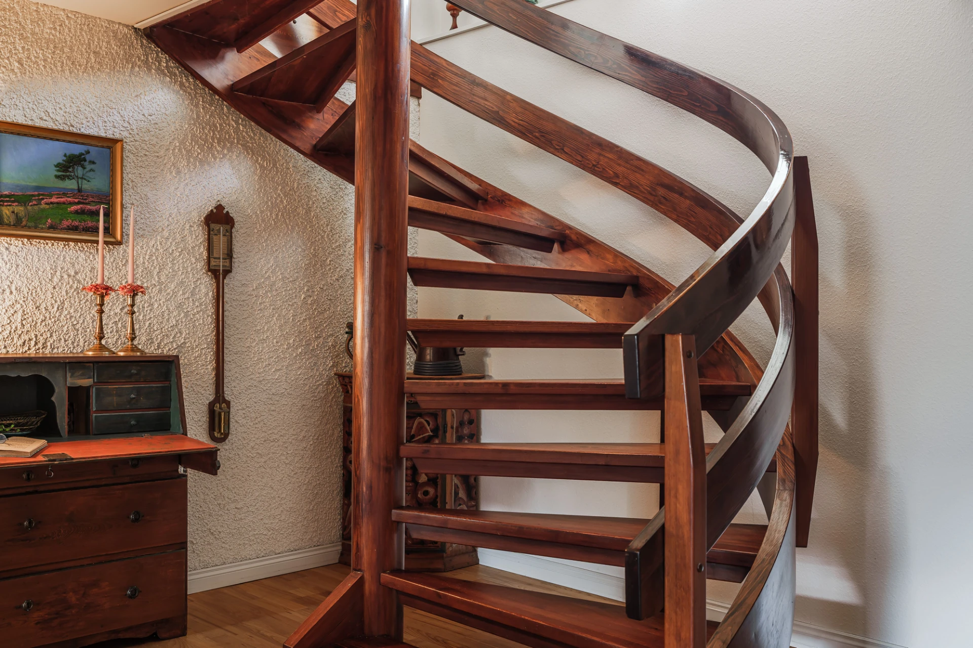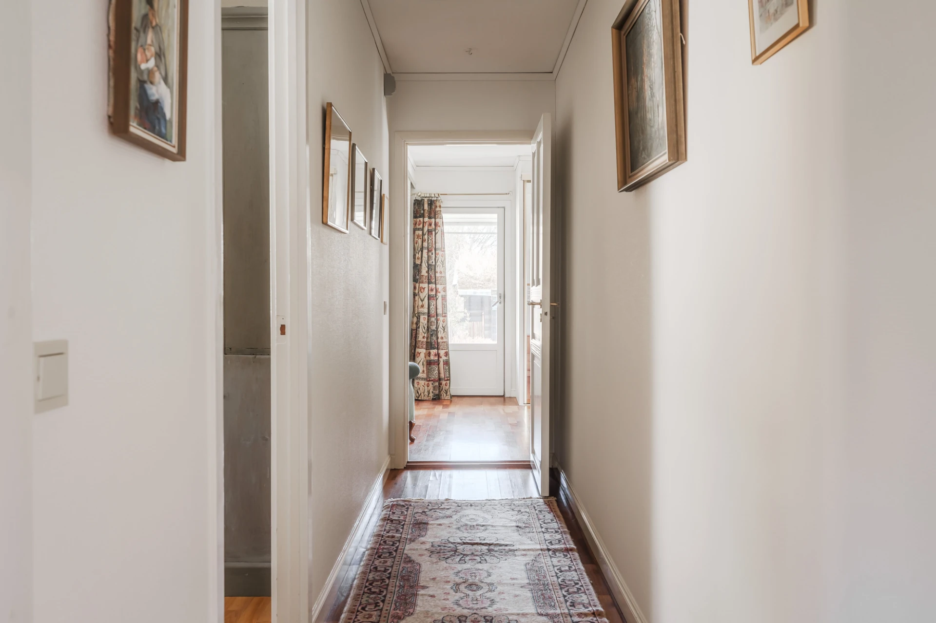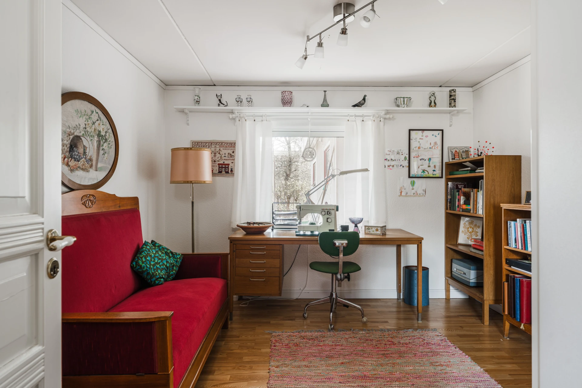 Parkettgolv med vattenburen golvvärme och ljusa väggar. Här finns plats för skrivbord och lämpar sig bra för hemmakontor.