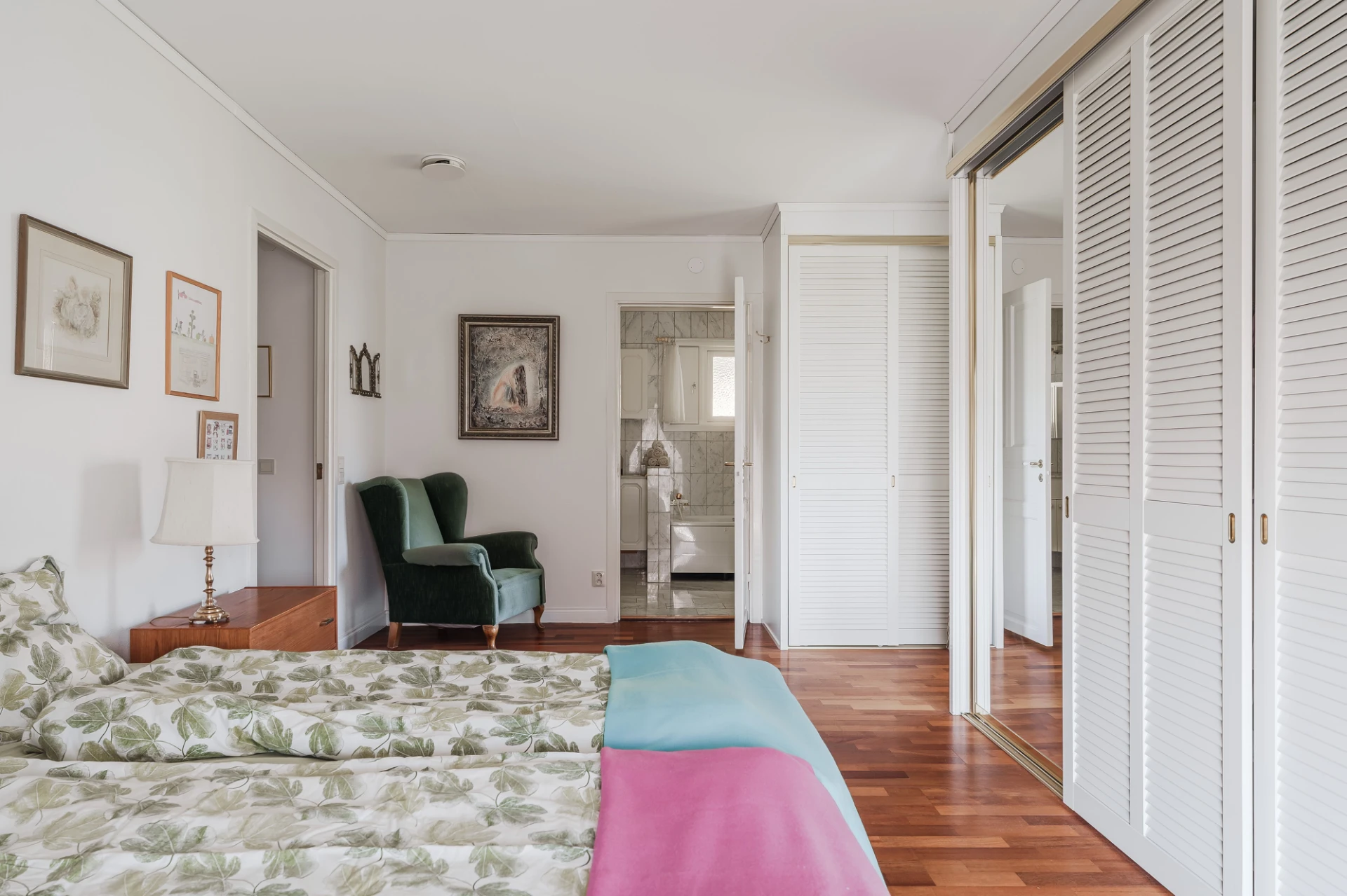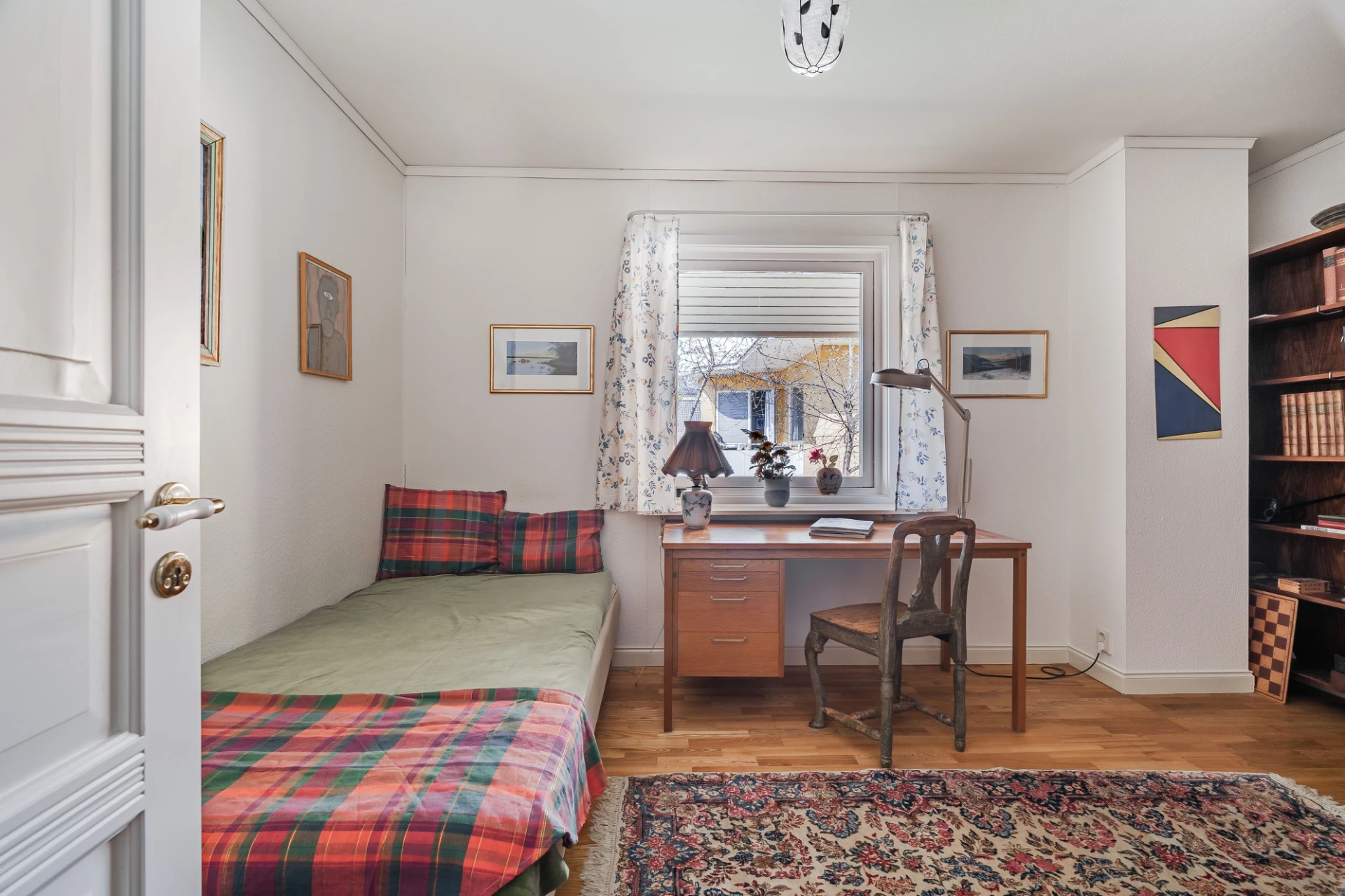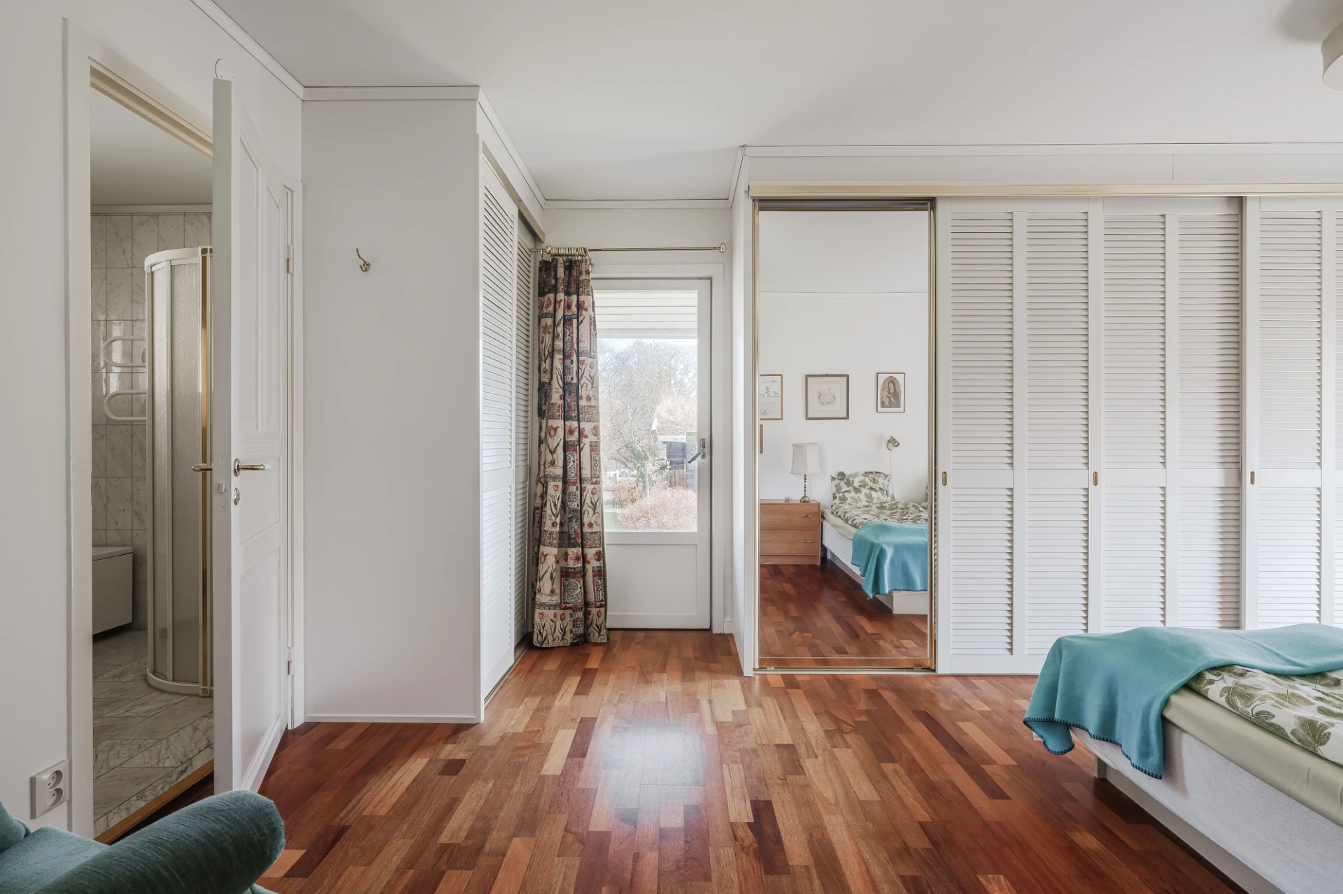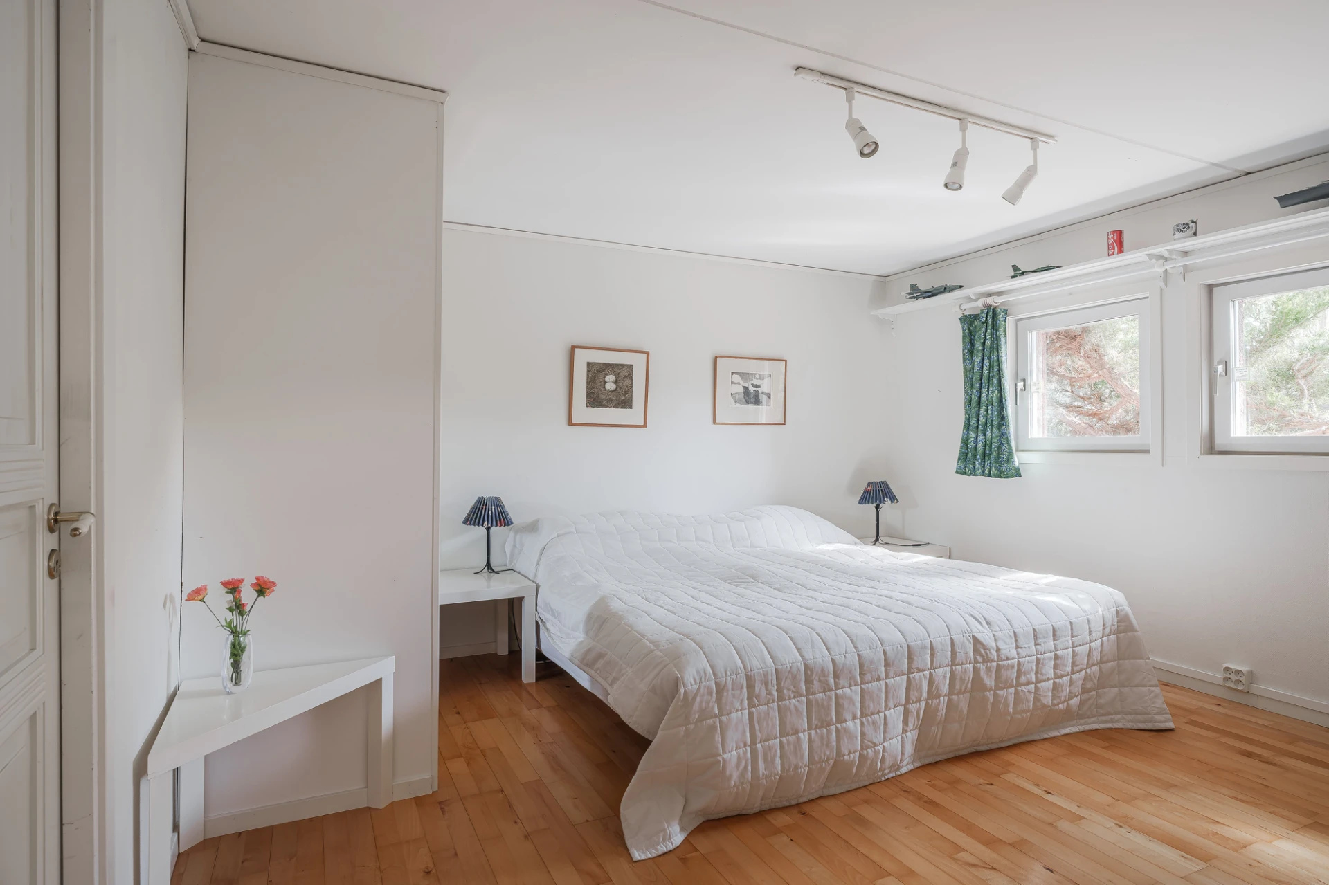 Parkettgolv med vattenburen golvvärme och ljusa väggar. Här finns plats för säng med tillhörande möblemang samt skrivbordshörna.