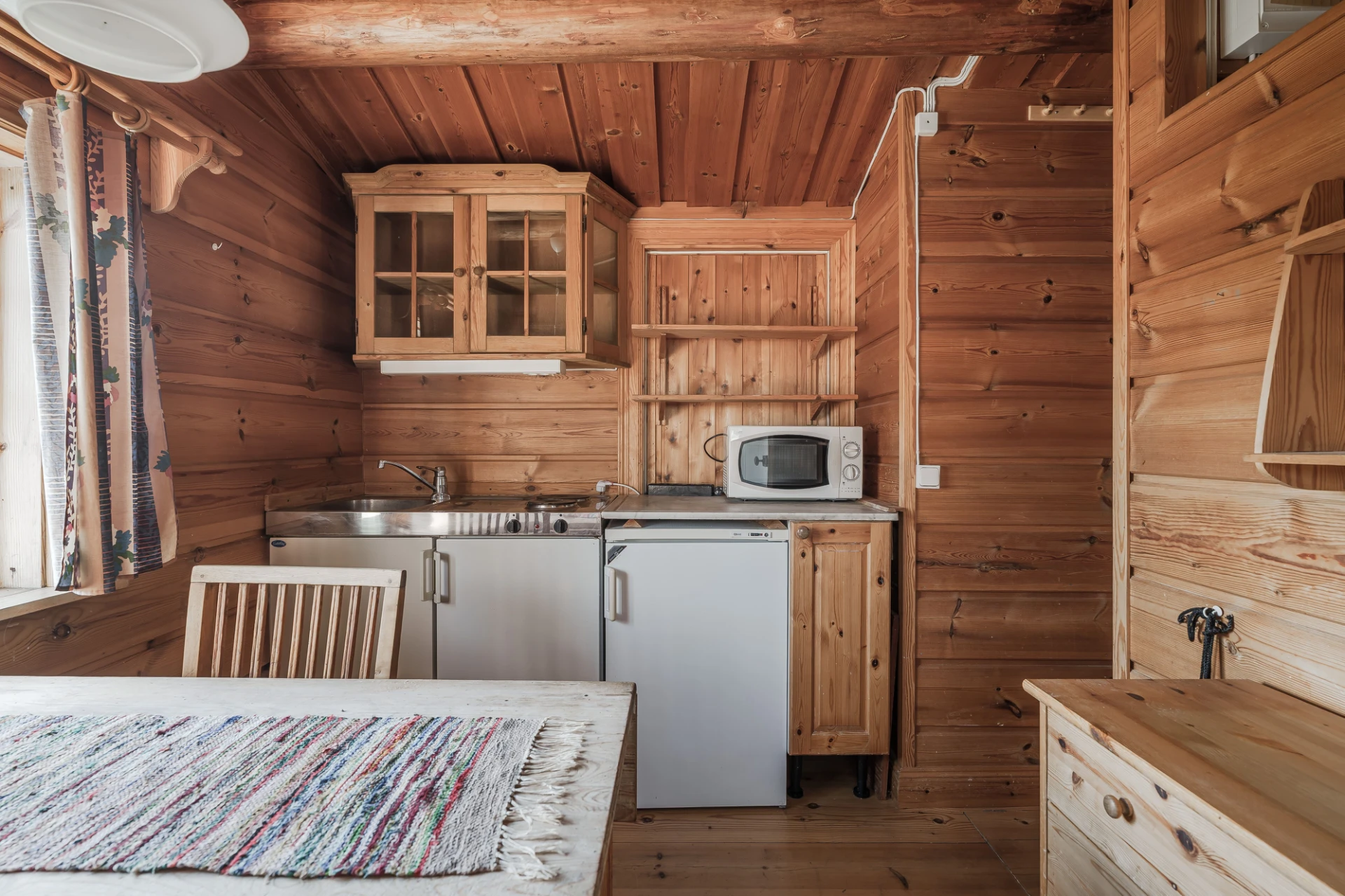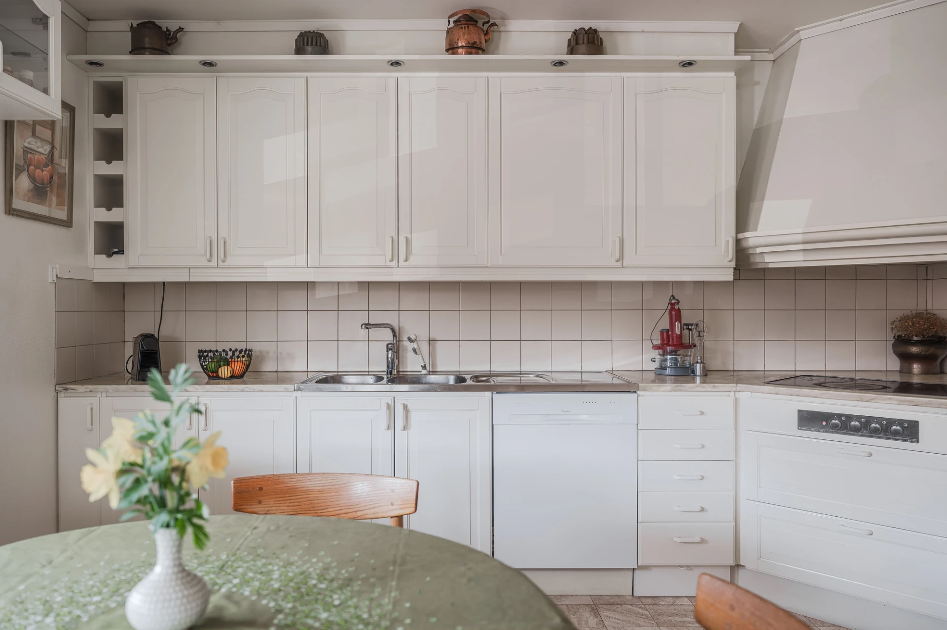 Plastmatta med vattenburen golvvärme och ljusa väggar. Den maskinella utrustningen består av spishäll, inbyggd ugn, inbyggd mikro, inbyggd diskmaskin samt kyl och frys. Matplats.