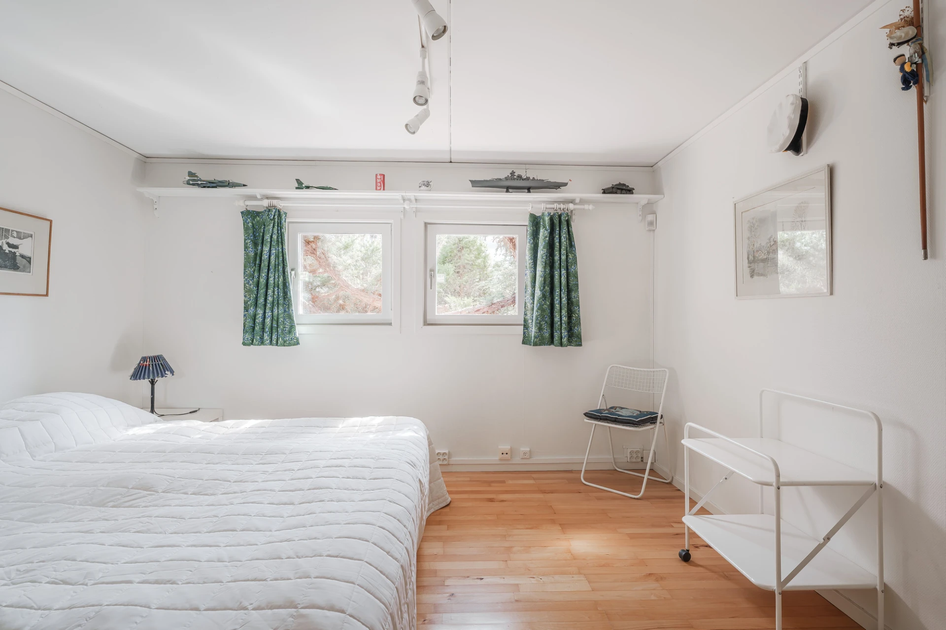 Parkettgolv med vattenburen golvvärme och ljusa väggar. Här finns plats för säng med tillhörande möblemang samt skrivbordshörna. Förvaring i platsbyggd garderob.