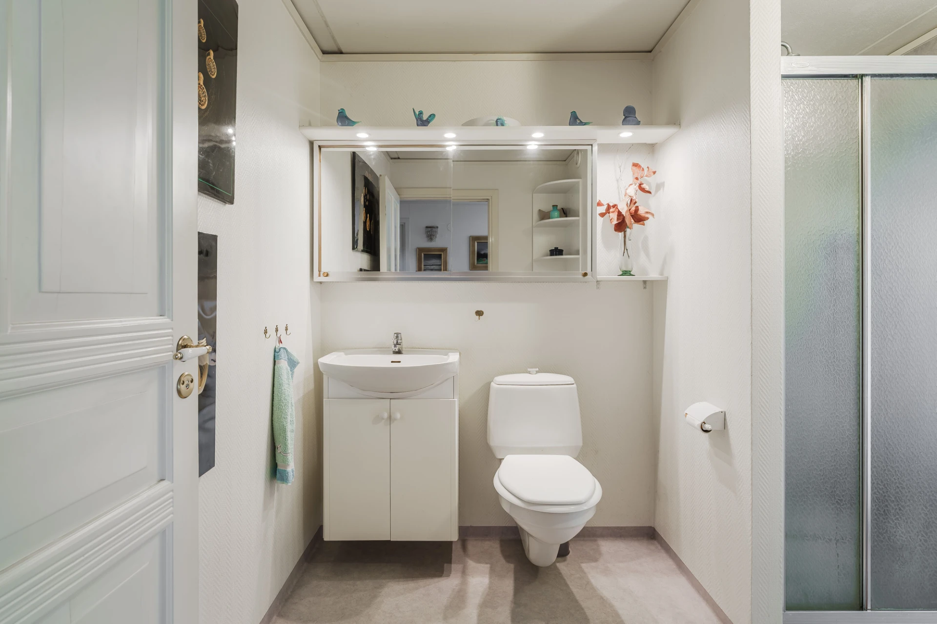 Plastmatta med vattenburen golvvärme och ljusa väggar. Duschrummet är utrustat med vägghängd wc, handfat med kommod, vägghängd spegelskåp med belysning samt dusch.