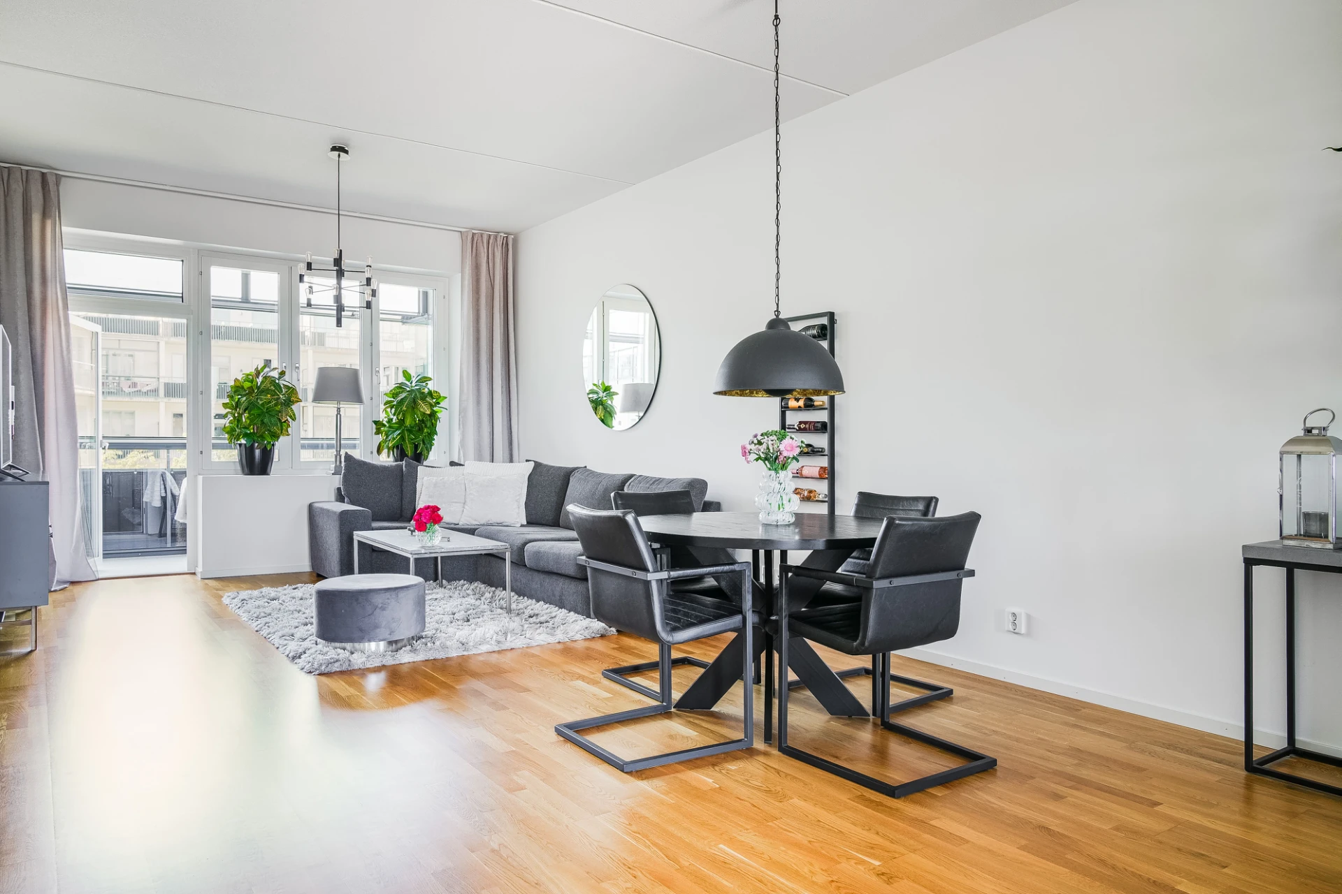 Parkettgolv och ljusa väggar. Här finns plats för soffa med tillhörande samt matbord. Från vardagsrummet nås bostaden inglasade balkong.