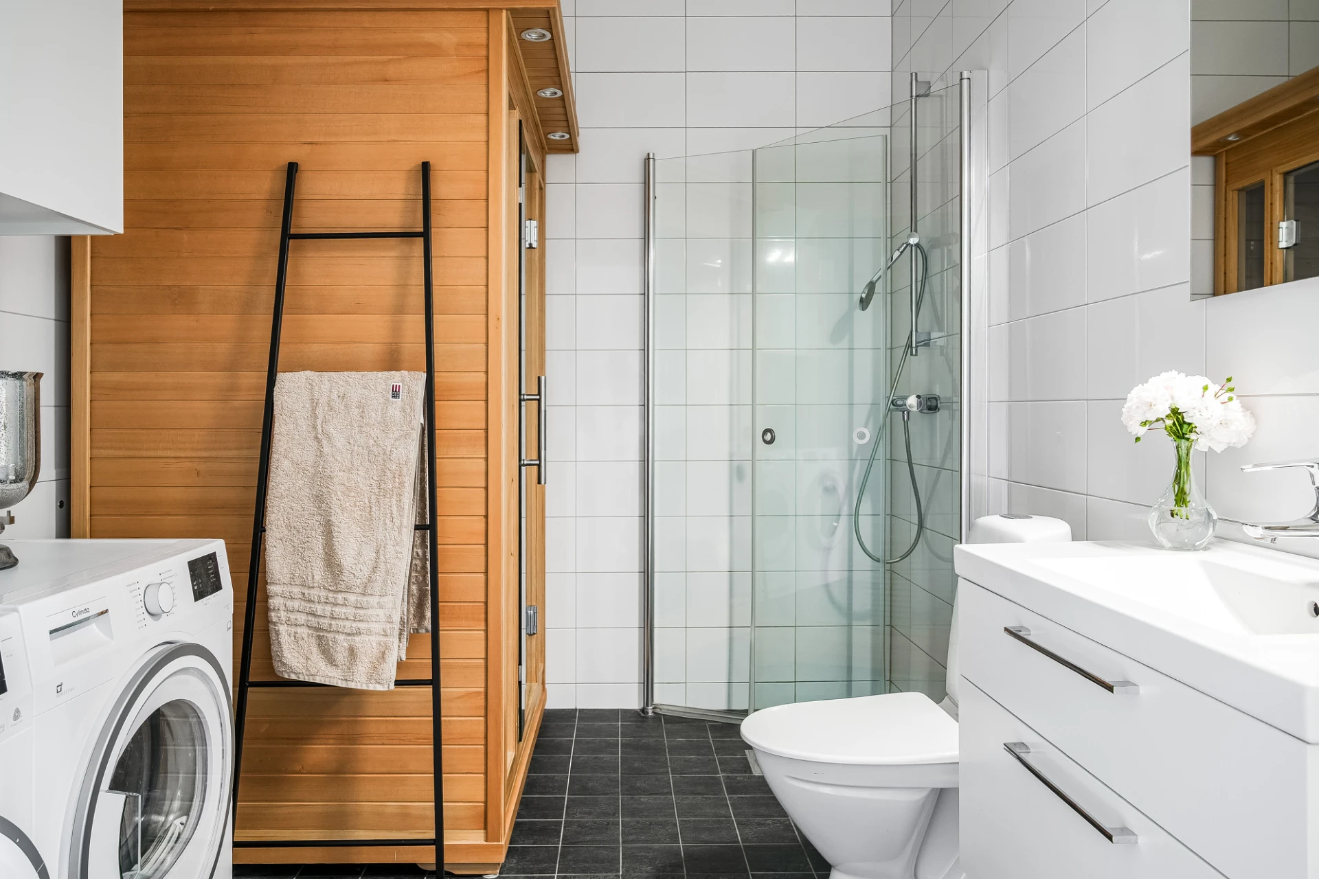 Klinkergolv och helkaklade väggar. Duschrummet är utrustat med wc, handfat med kommod, vägghängd spegel, dusch med vikbara glasdörrar, tvättmaskin, torktumlare, förvaringsskåp samt IR bastu.