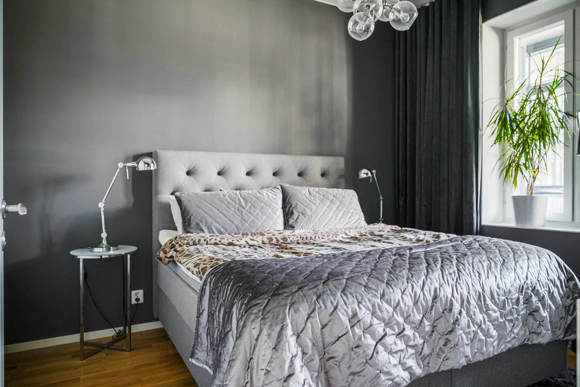 Parkettgolv och grå väggar. Här finns plats för säng med tillhörande möblemang.